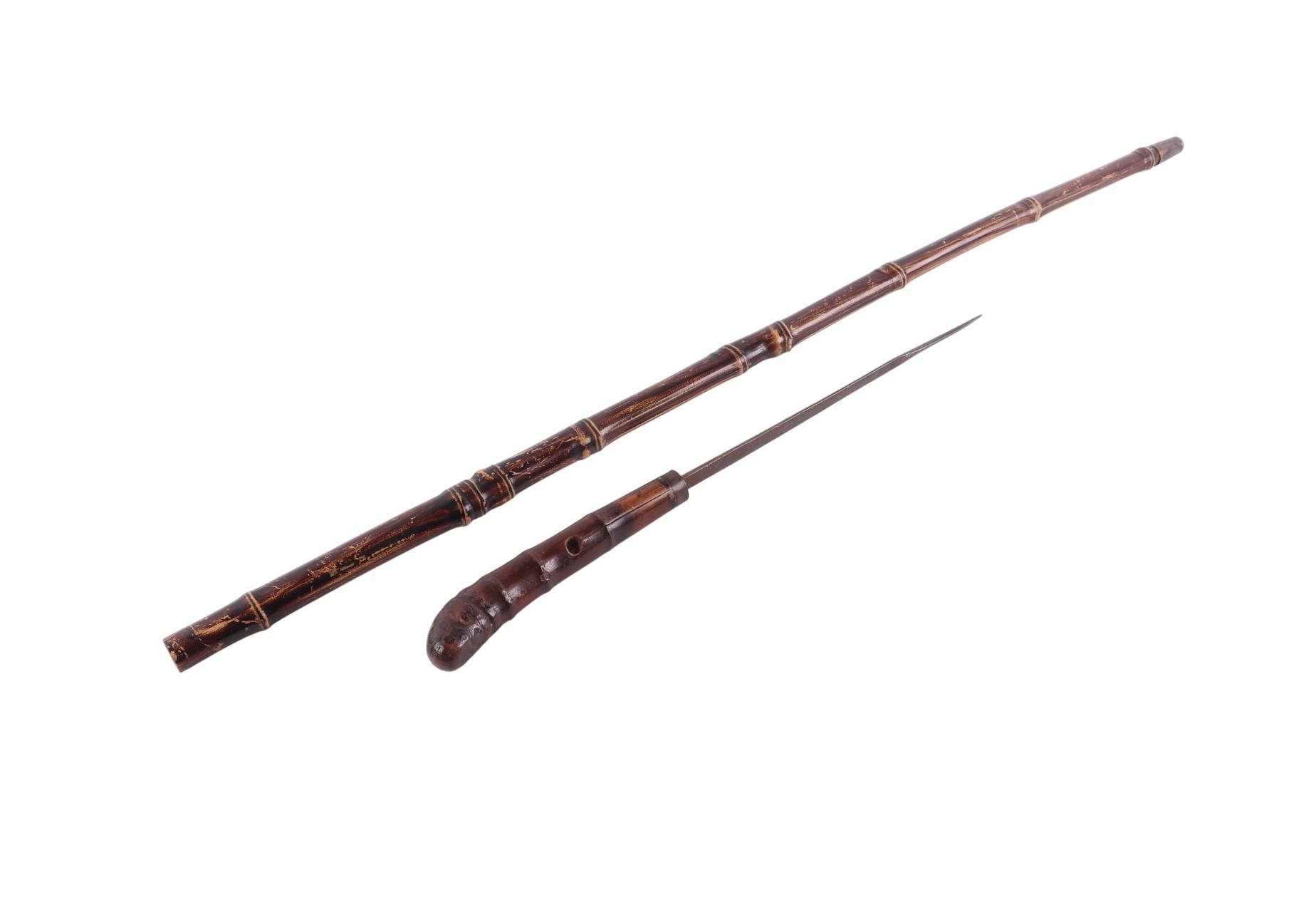 A late 19th / early 20th century cane shafted sword stick. Having a rectangular section blade 25cms long and an overall length of 95.5cms.
