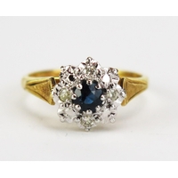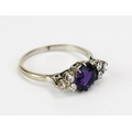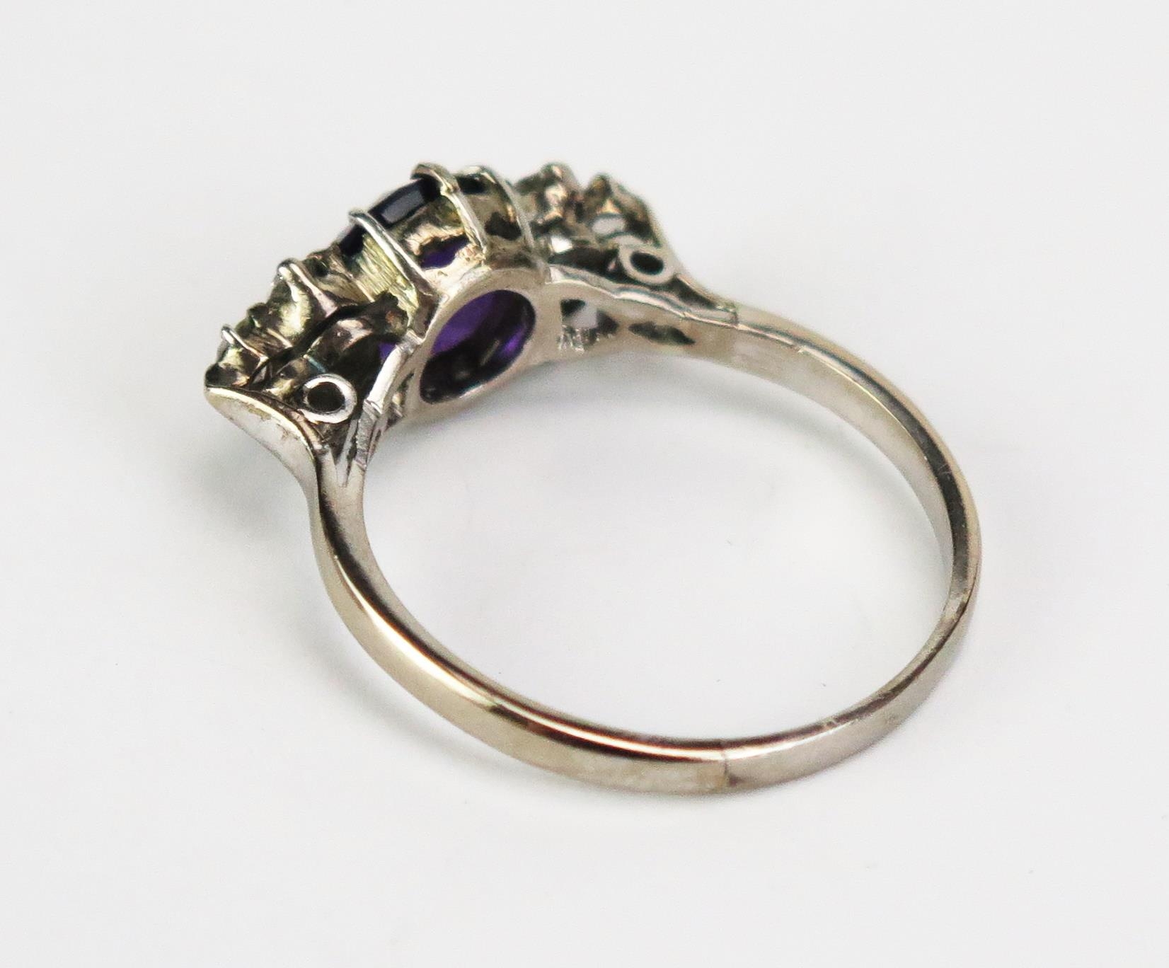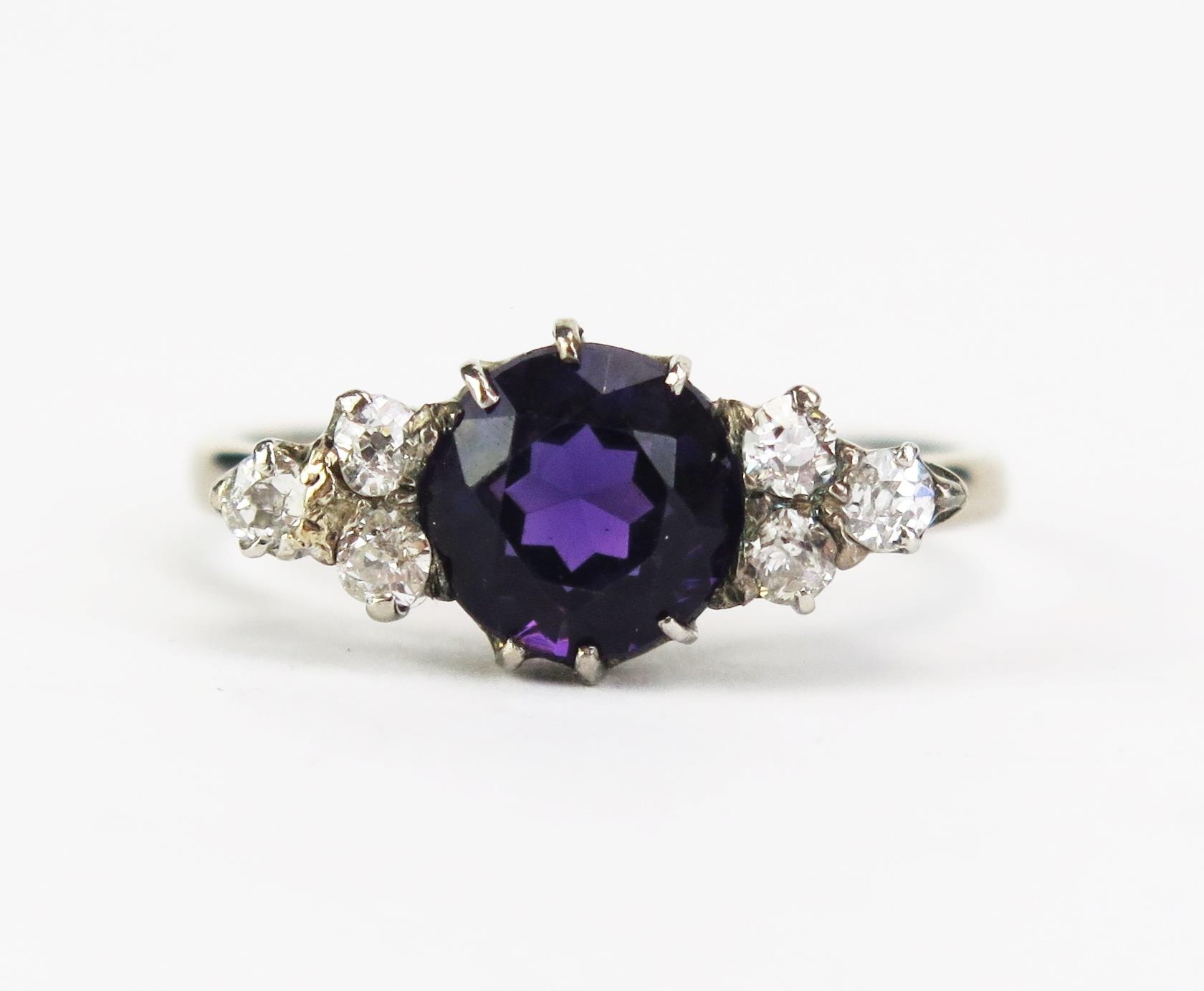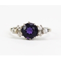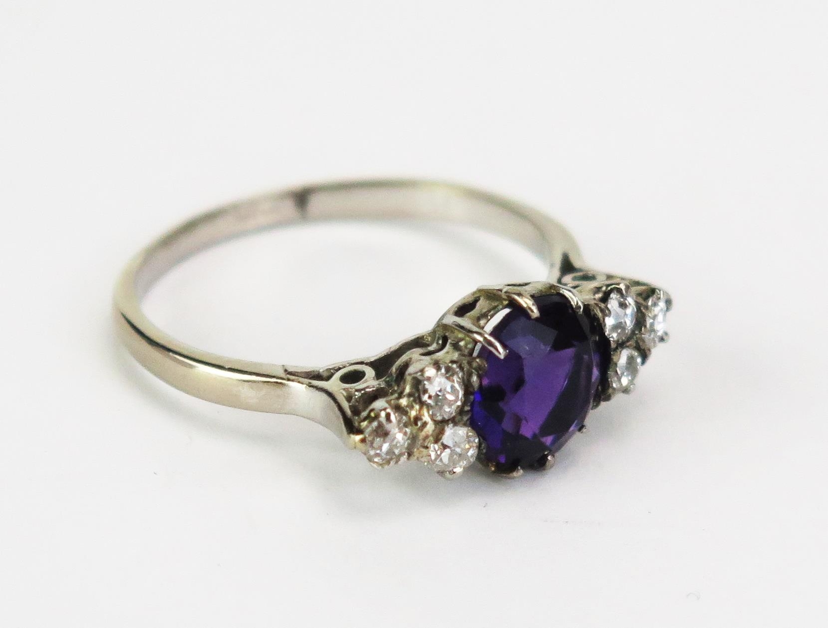 An Amethyst and Diamond Seven Stone Ring in a precious white metal setting, c. 7.9mm principal stone, 19mm head, probably 18ct white gold, size S.25, 3.72g