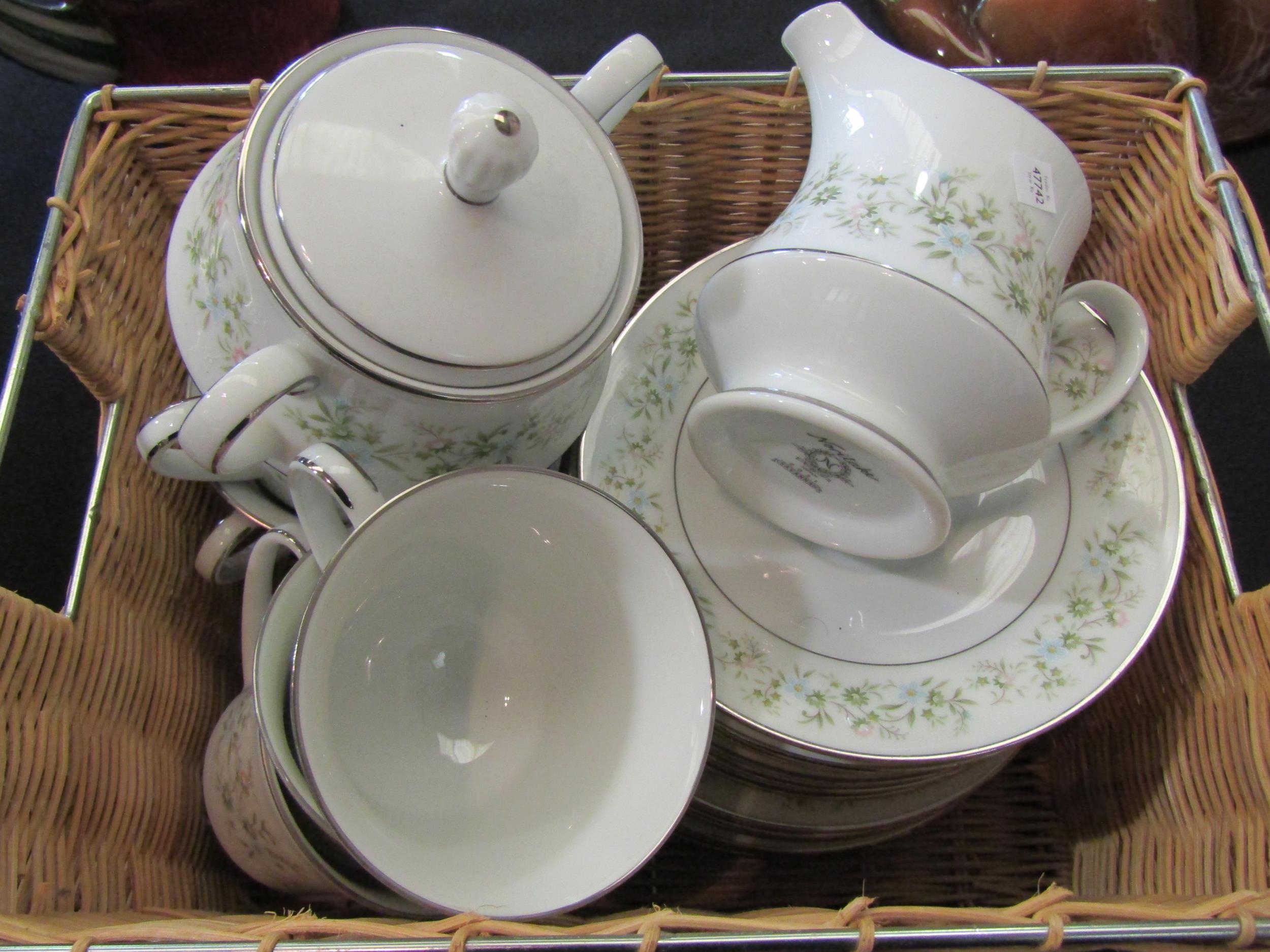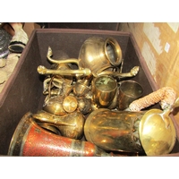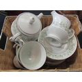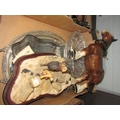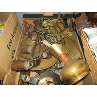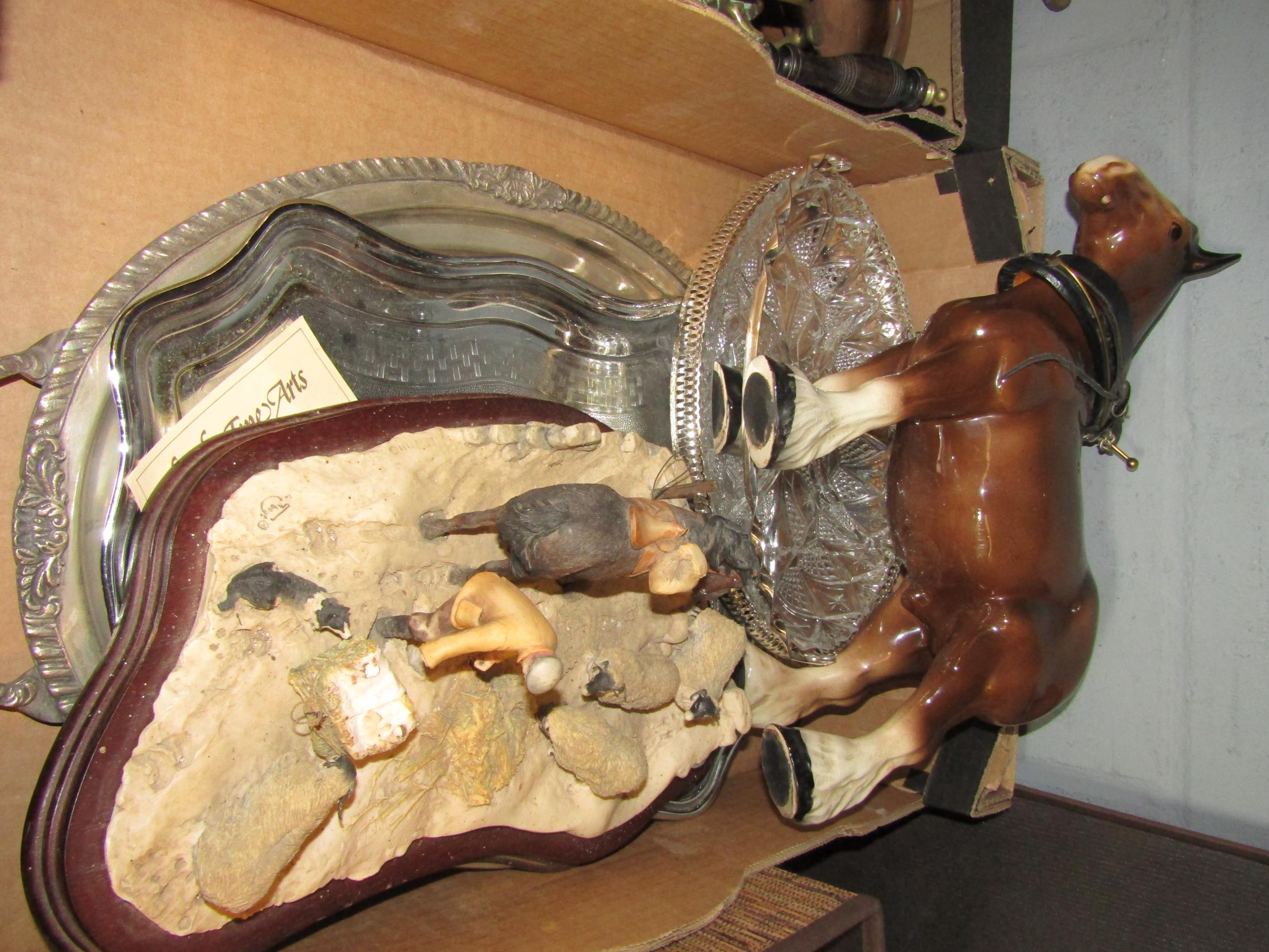 A box of assorted including 'Wintery Feeding' Border Artists figure (a/f), a ceramic horse, Noritake tea set, two metal trays and another etc.