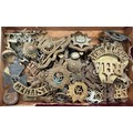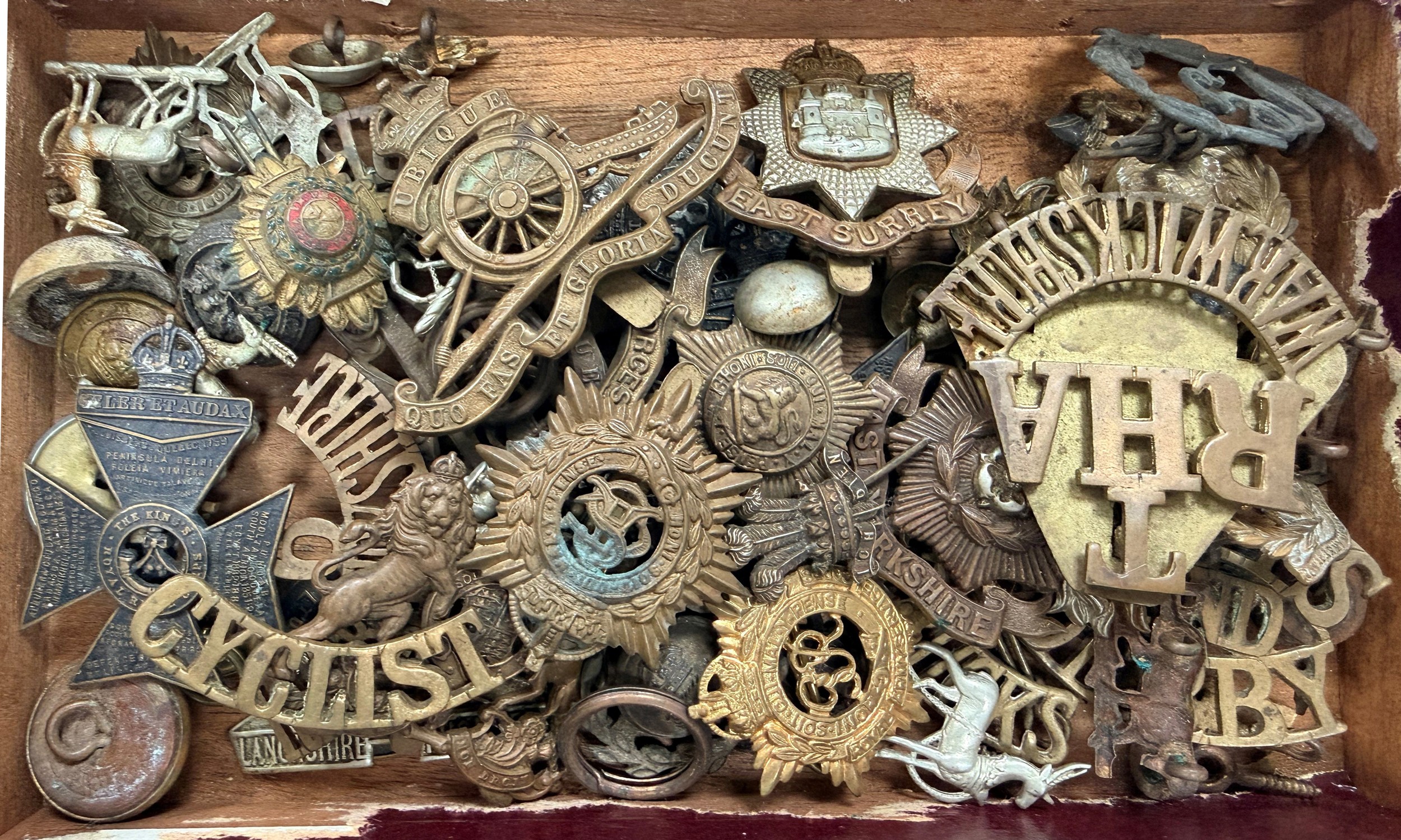 Cigar Box containing 47 Military Badges And Buttons.