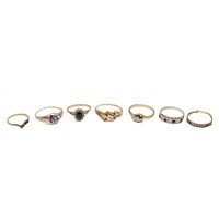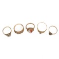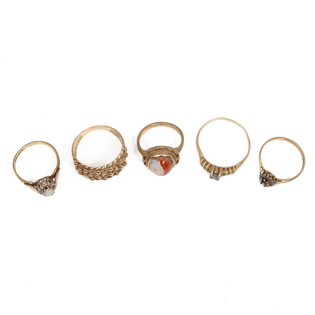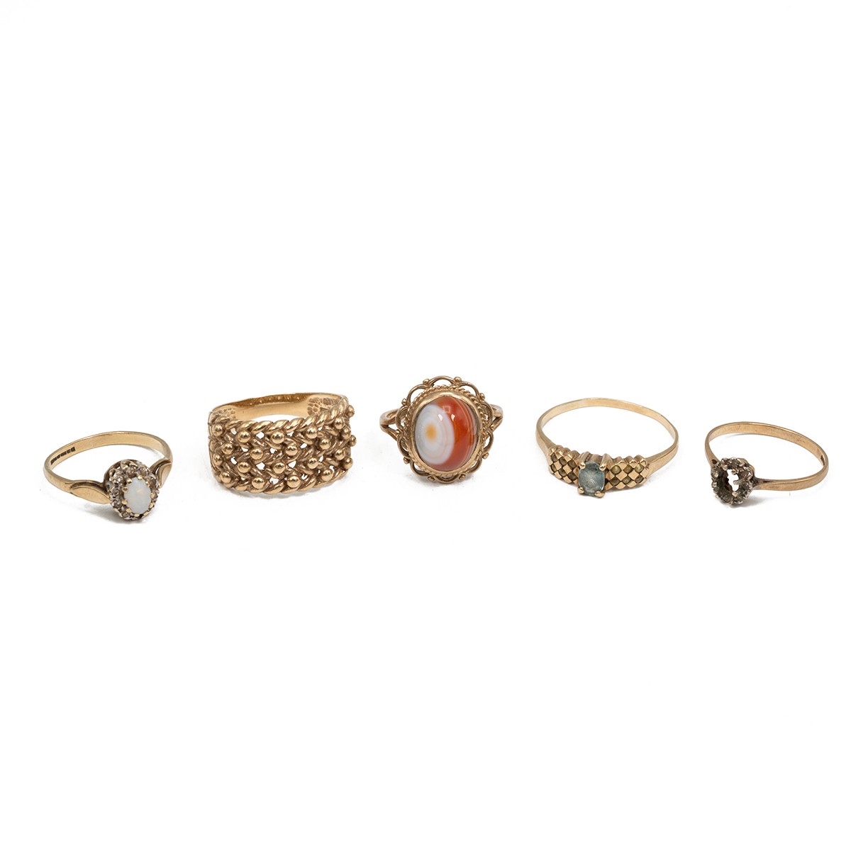 Five assorted 9ct gold gem-set rings, including a knotted ring, an agate ring, and an opal ring, etc., various sizes, gross weight 164 grams.