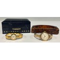 A 9ct gold cased 1930s wristwatch, silver dial,, Arabic numerals, manual stem wind Swiss movement, case Cheater 1933, later expanding bracelet, W E Watt's Derby box, 22.3g gross; Tissot lady's bracelet watch. boxd