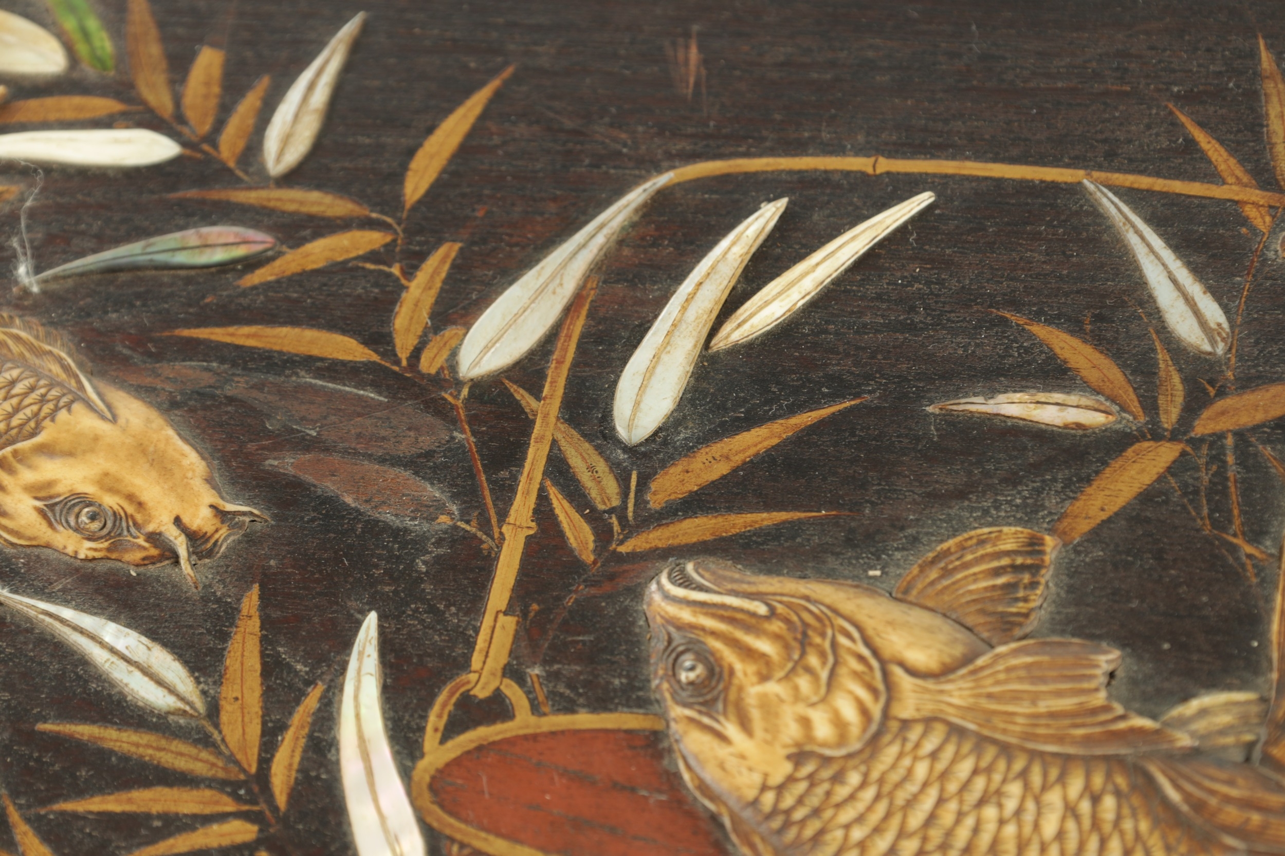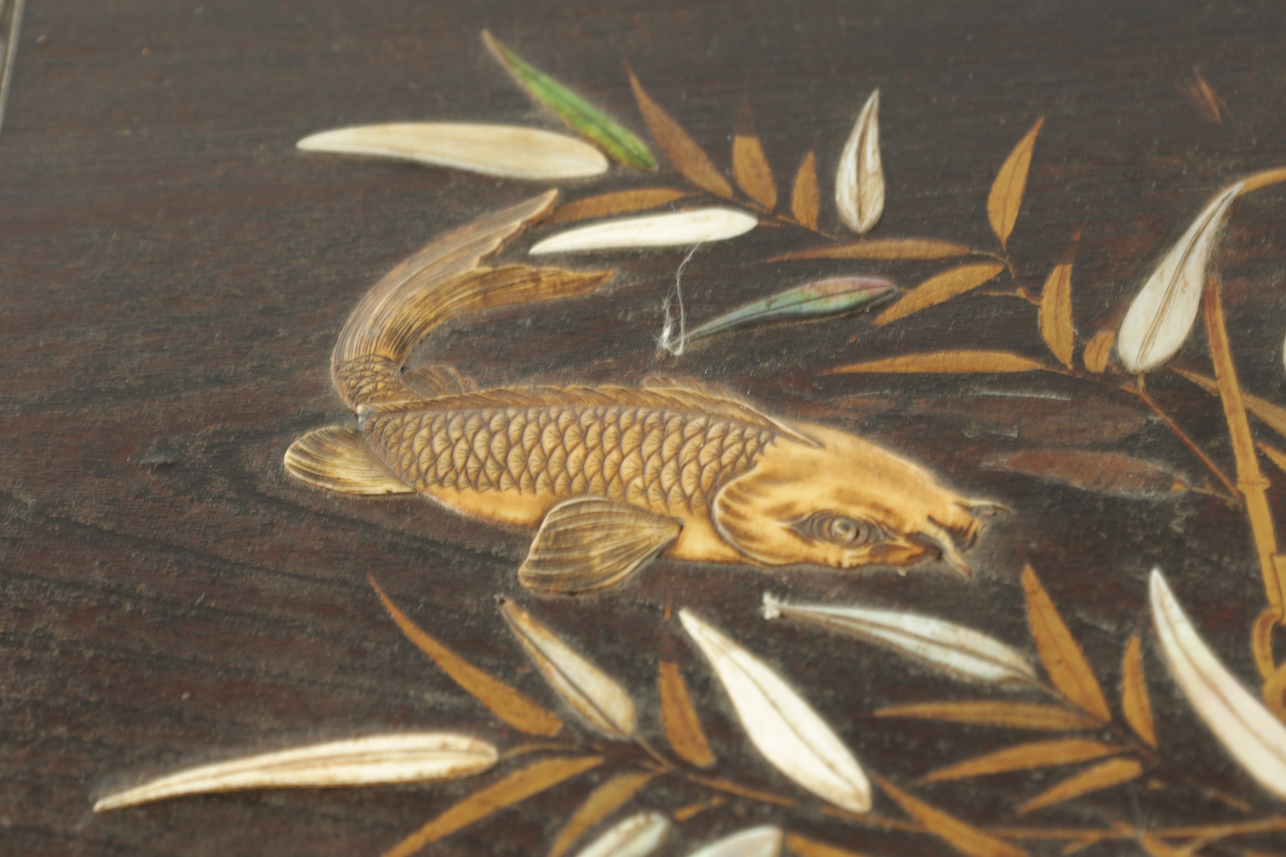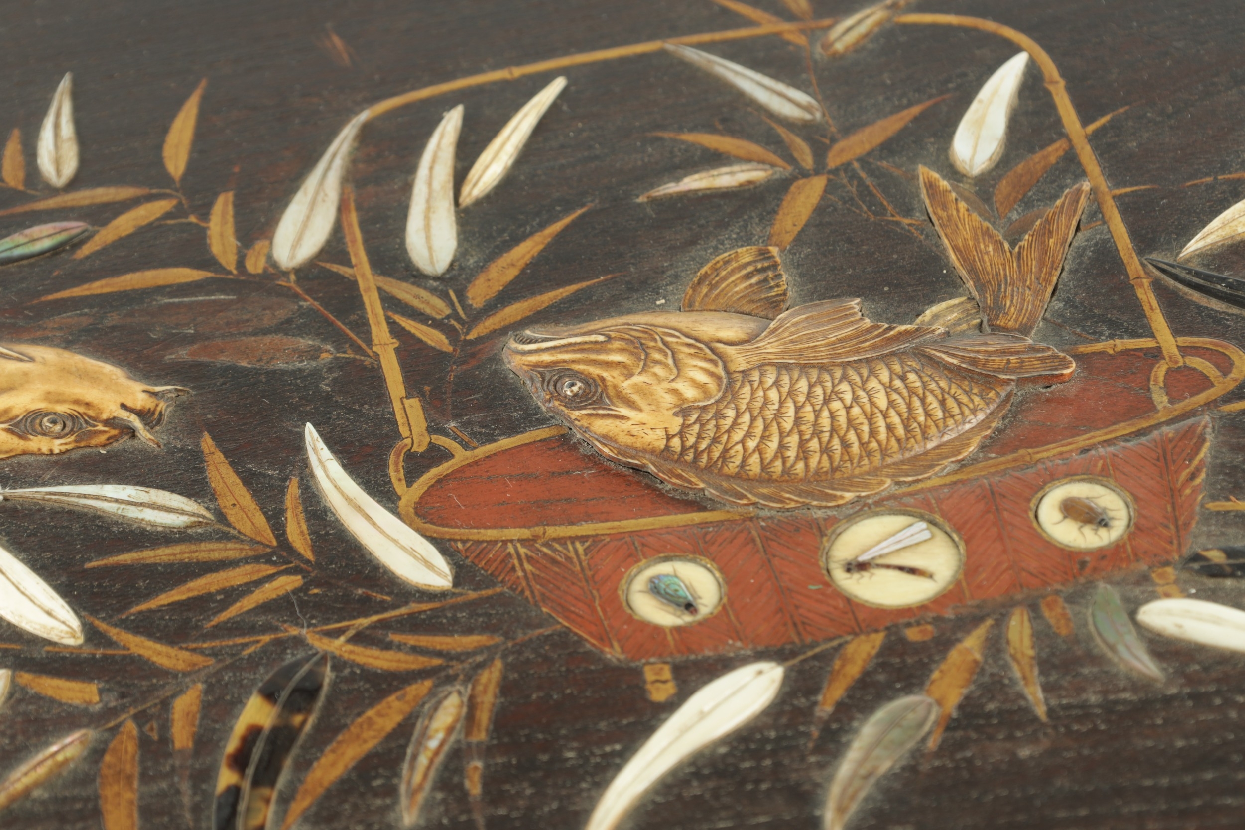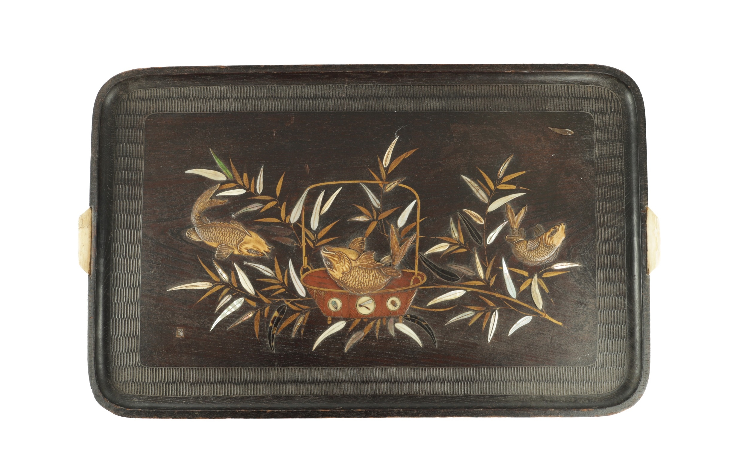 A JAPANESE MEIJI PERIOD SHIBIYAMA INLAID HARDWOOD TRAY with Ivory, Mother of Pearl, and Lacquer Work inlaid decoration depicting fish and insects amongst a basket and leaf work Ivory Act 2018 Exemption Submission Reference - QVM3AT5F (64cm wide 38cm deep )
