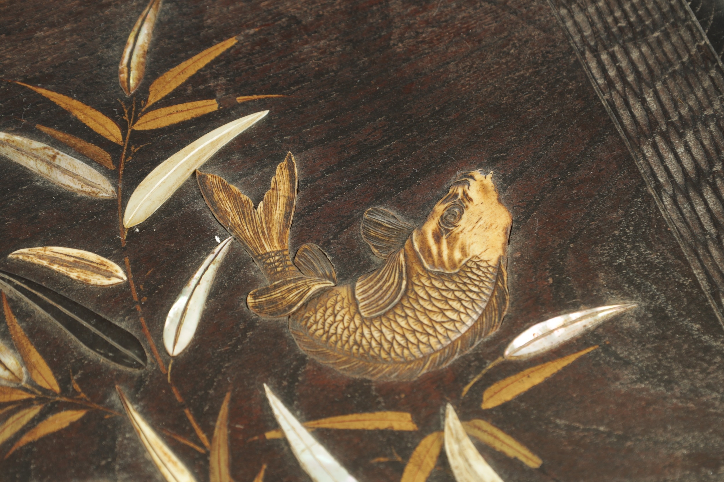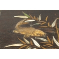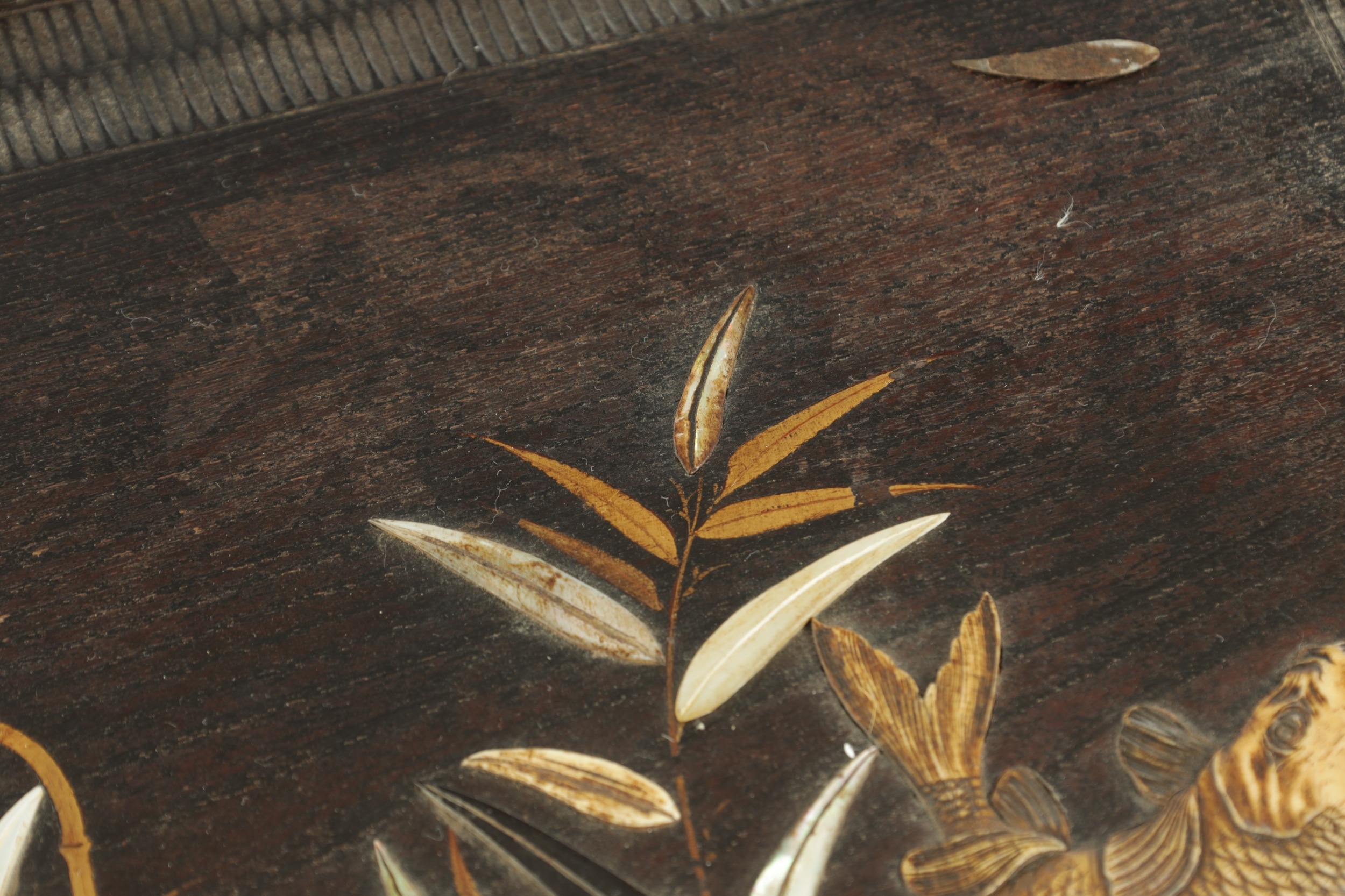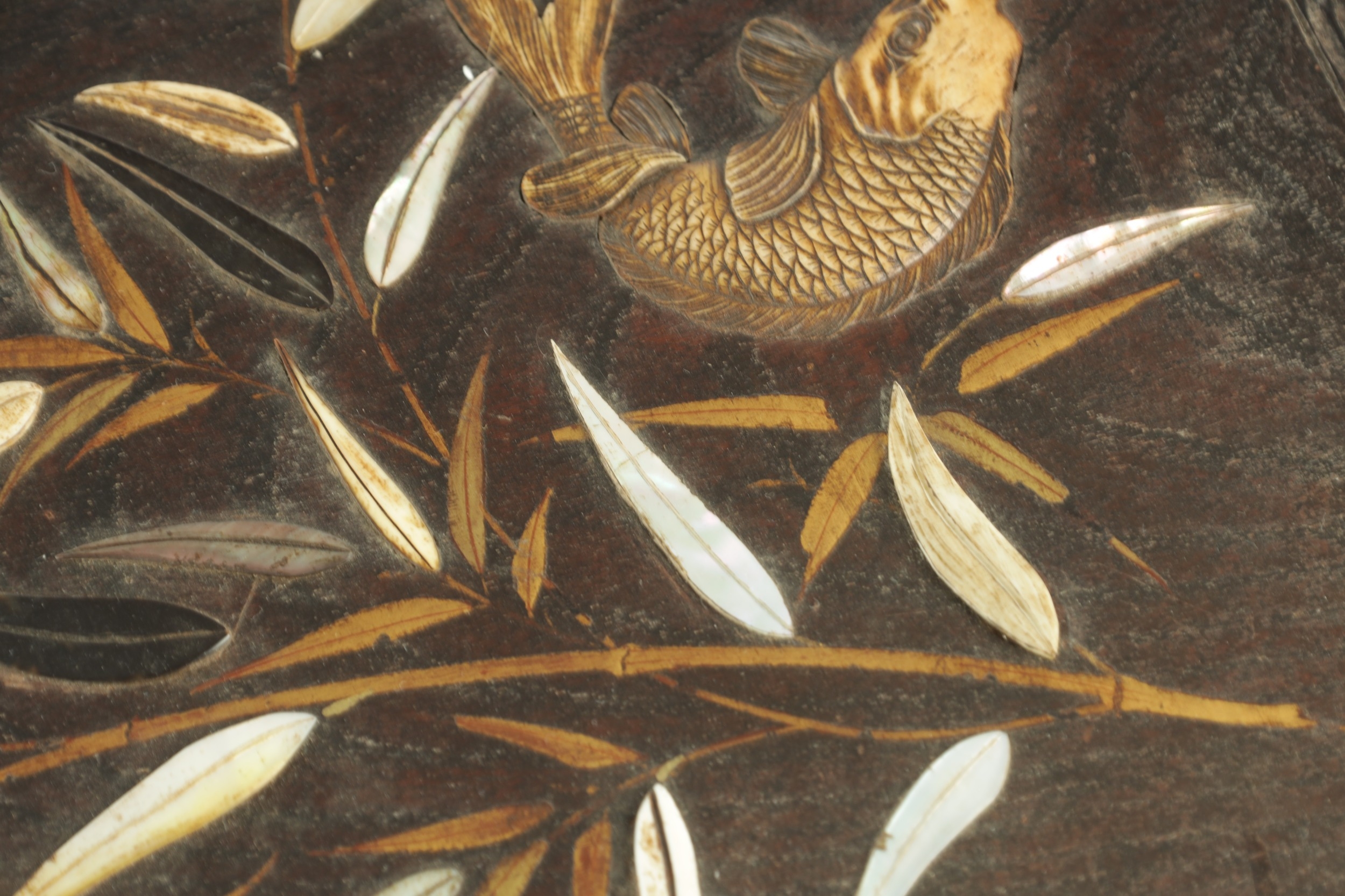 A JAPANESE MEIJI PERIOD SHIBIYAMA INLAID HARDWOOD TRAY with Ivory, Mother of Pearl, and Lacquer Work inlaid decoration depicting fish and insects amongst a basket and leaf work Ivory Act 2018 Exemption Submission Reference - QVM3AT5F (64cm wide 38cm deep )