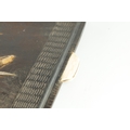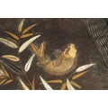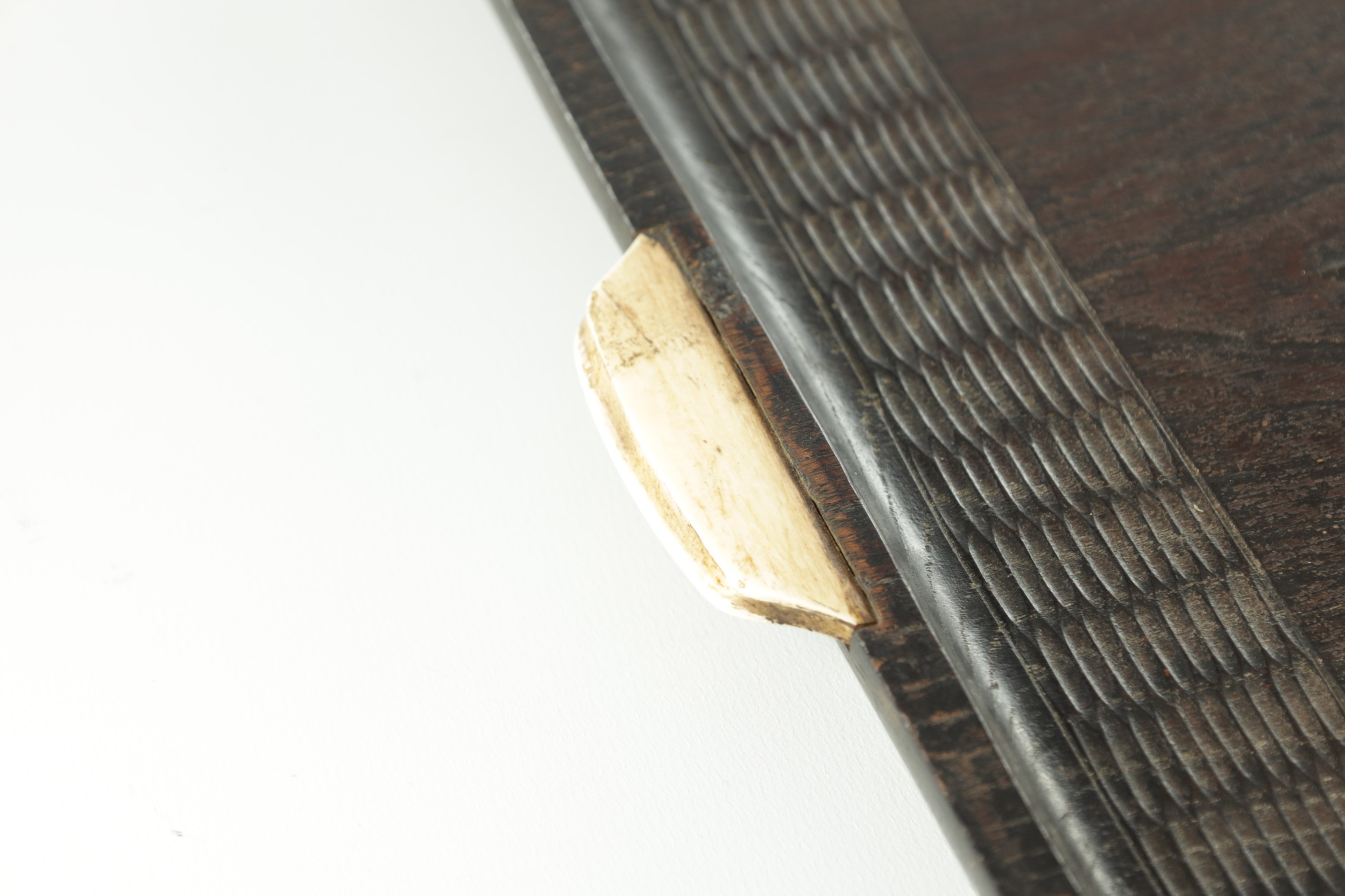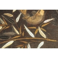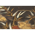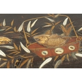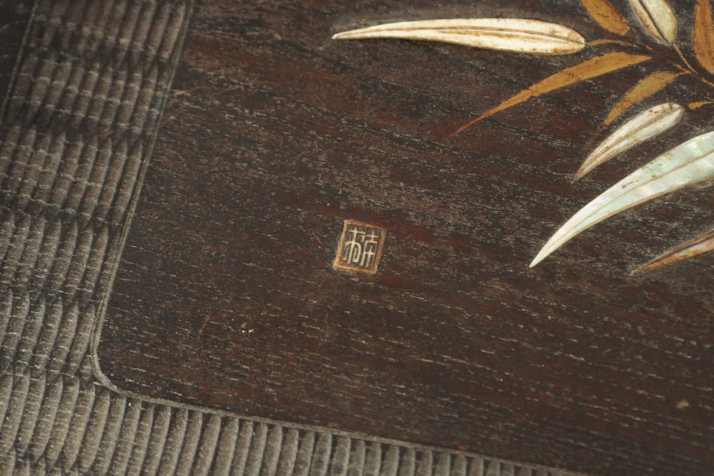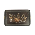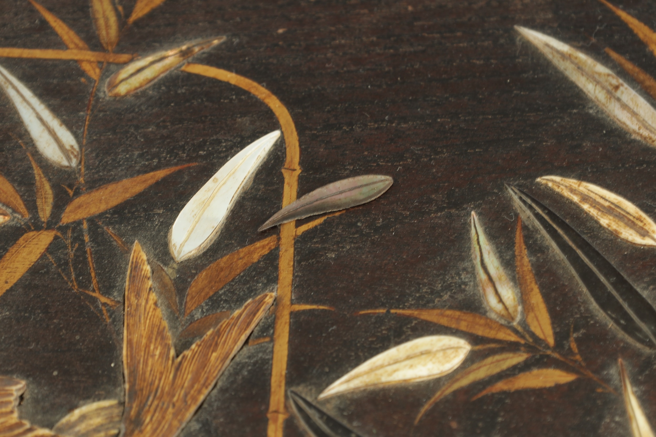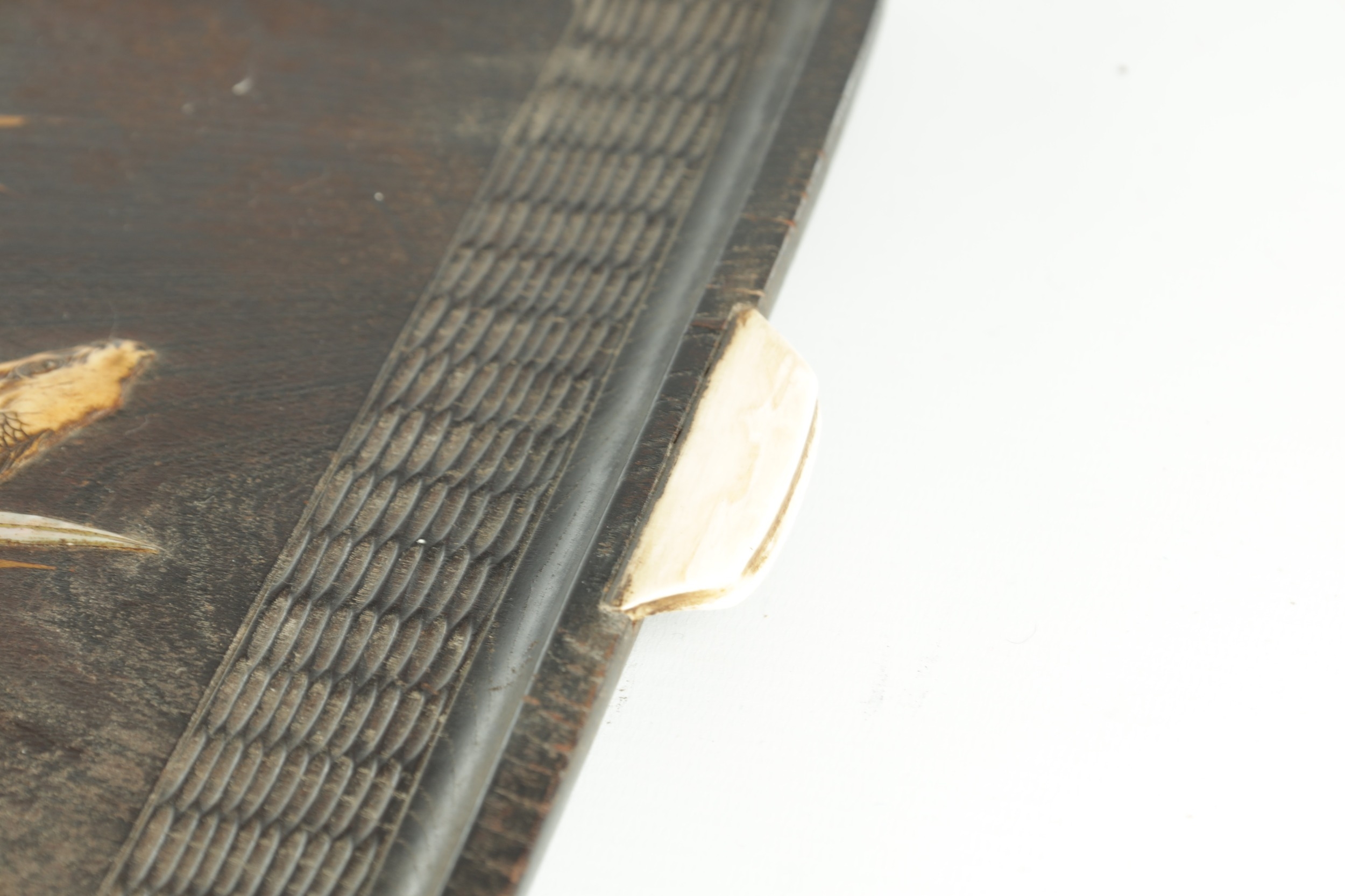 A JAPANESE MEIJI PERIOD SHIBIYAMA INLAID HARDWOOD TRAY with Ivory, Mother of Pearl, and Lacquer Work inlaid decoration depicting fish and insects amongst a basket and leaf work Ivory Act 2018 Exemption Submission Reference - QVM3AT5F (64cm wide 38cm deep )