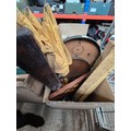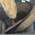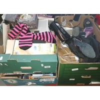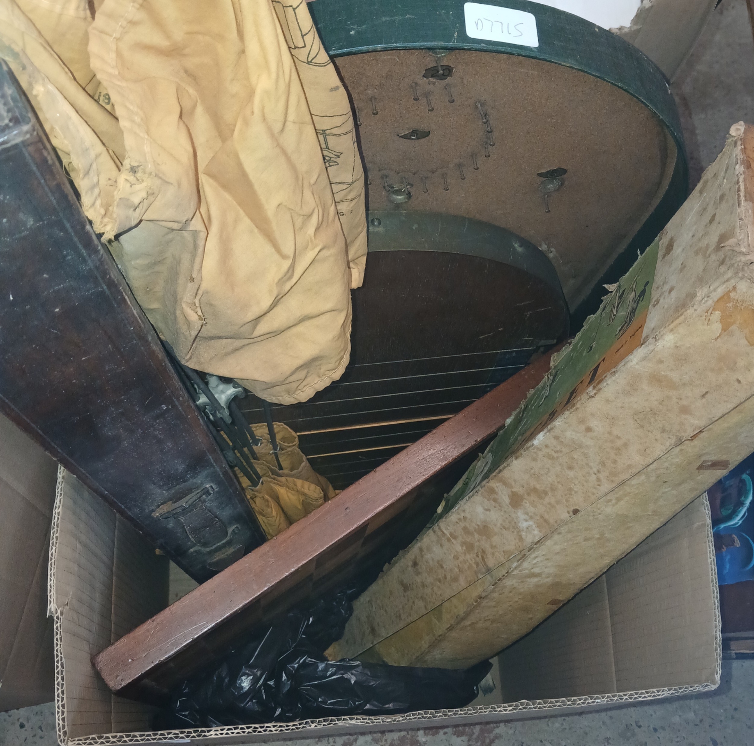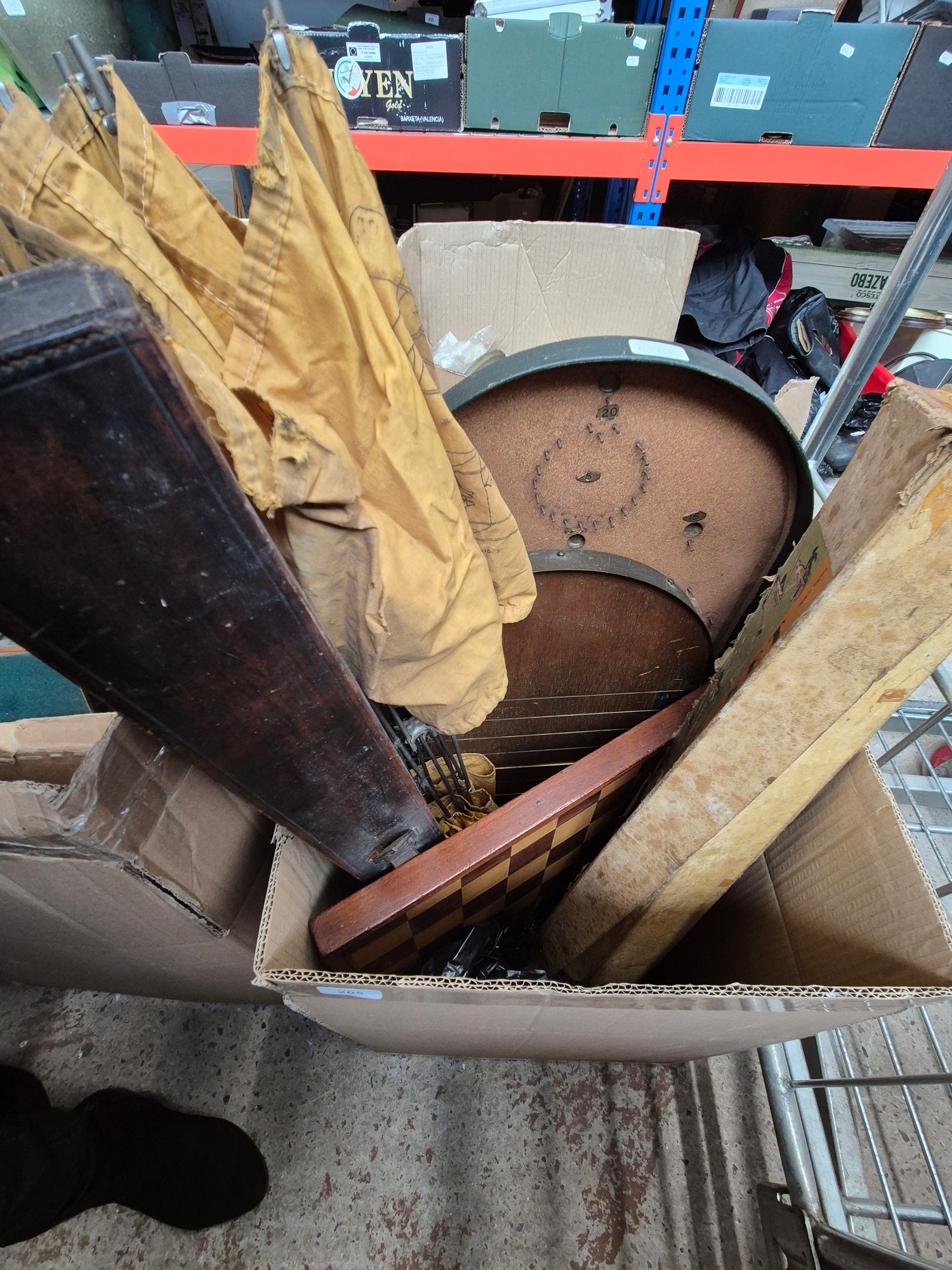 A mixed box to include bagatellle game, leather cased snooker cue, shove ha'penny board, box kite, etc