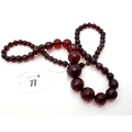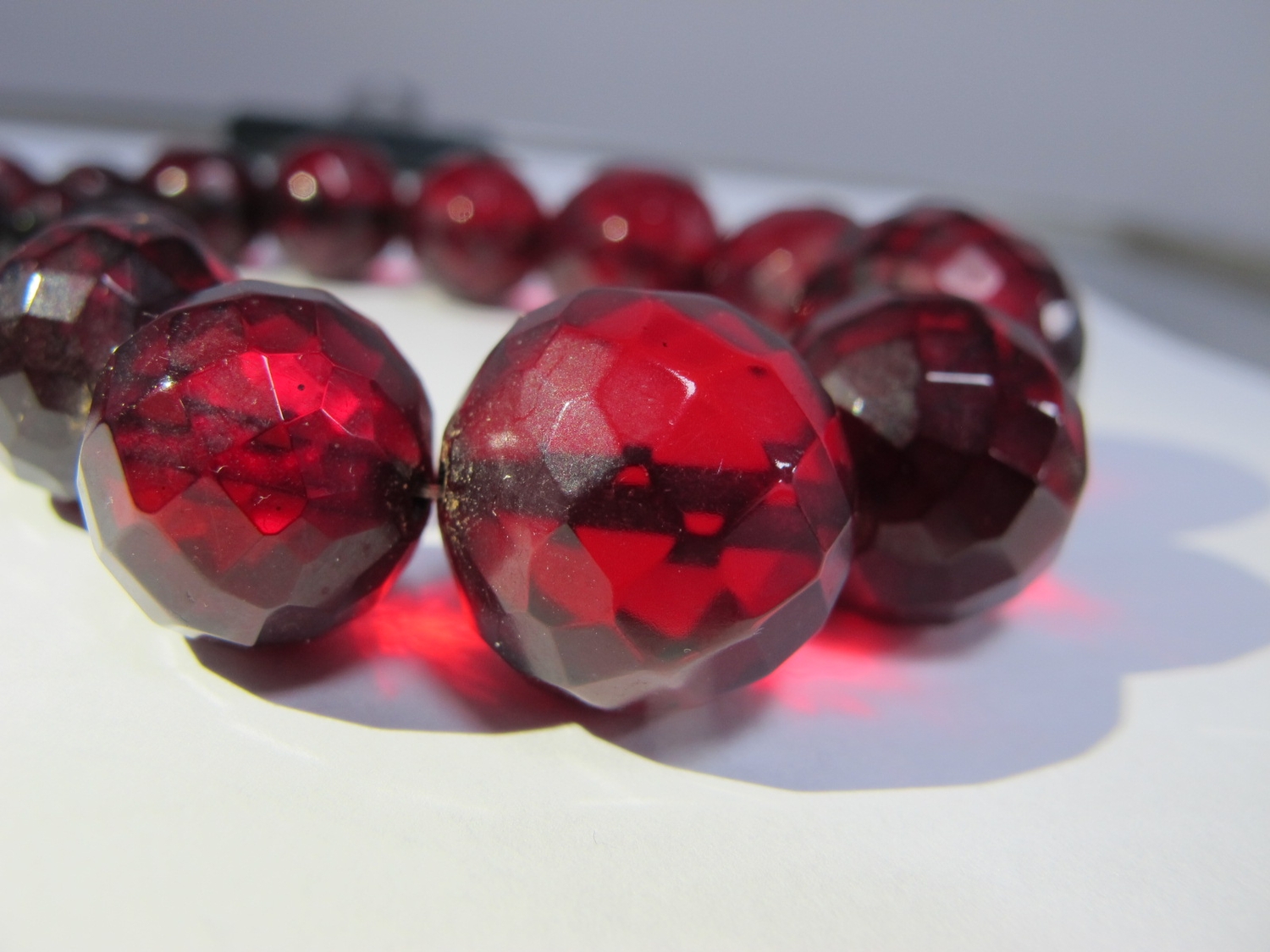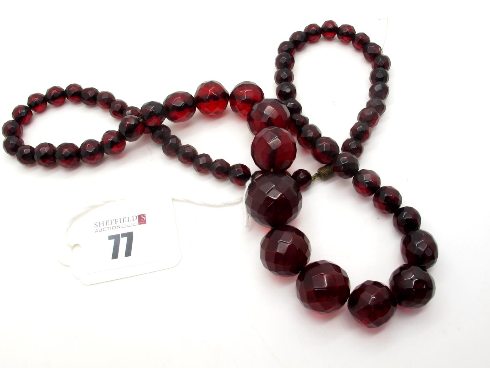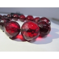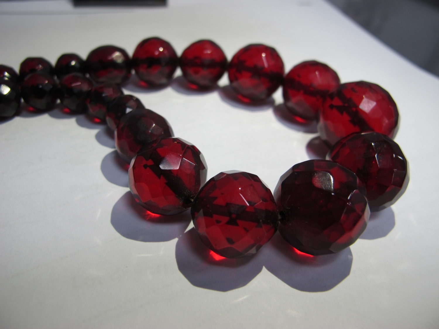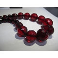 A Long Single Strand Faceted Cherry Amber Coloured Bead Necklace.