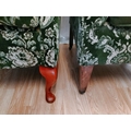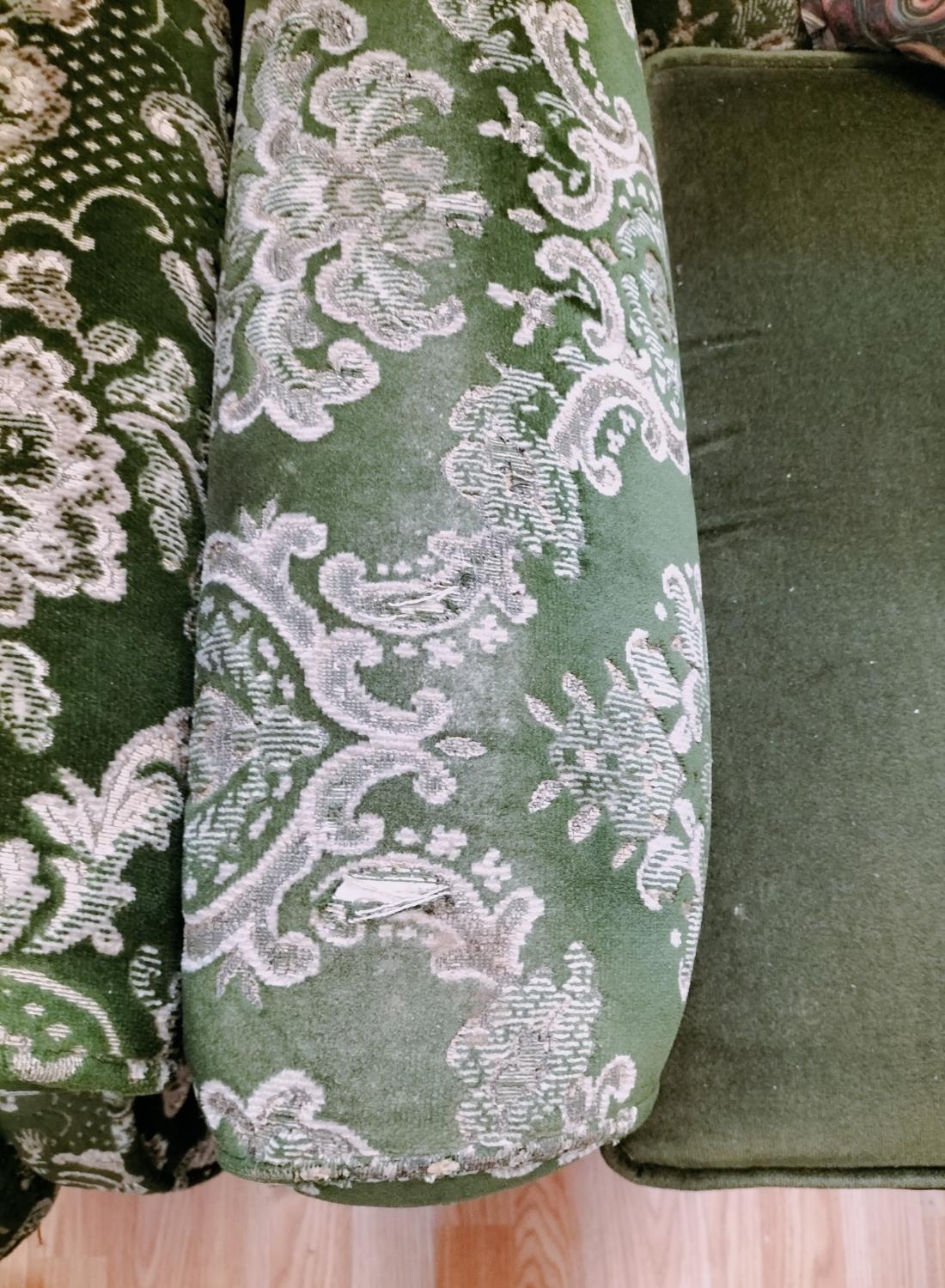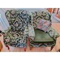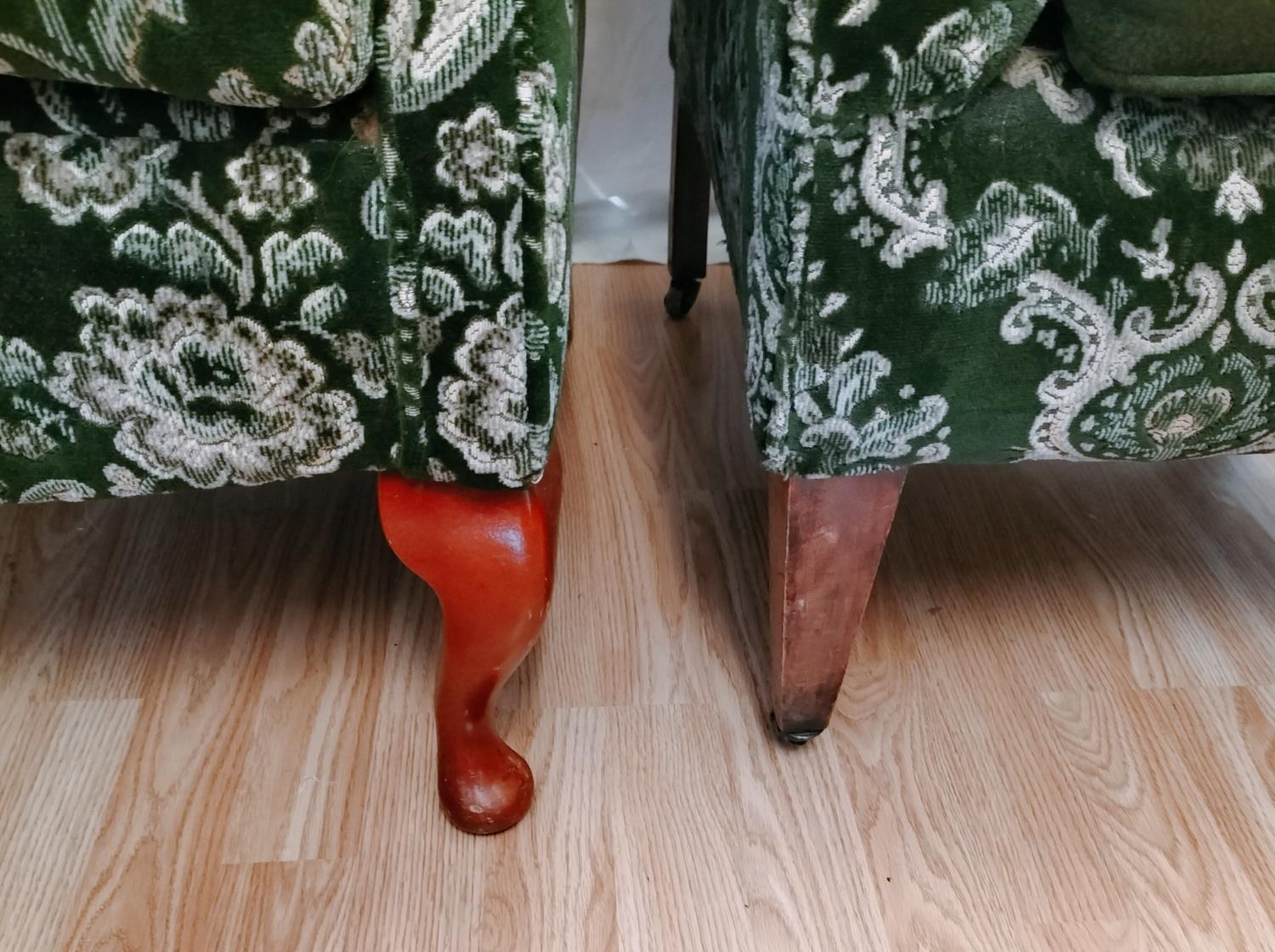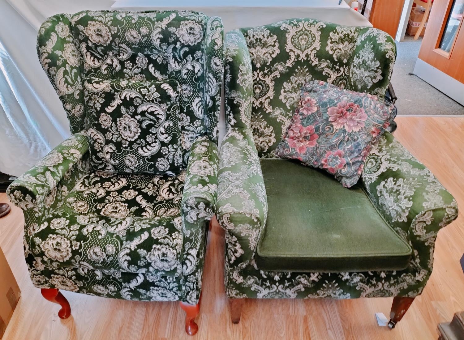 Wingback Green Fabric Chairs (2). One on Castors. One with Wear to Arm. 97cm High, 80cm x70cm. Seat Height 44cm. Collection Only.