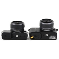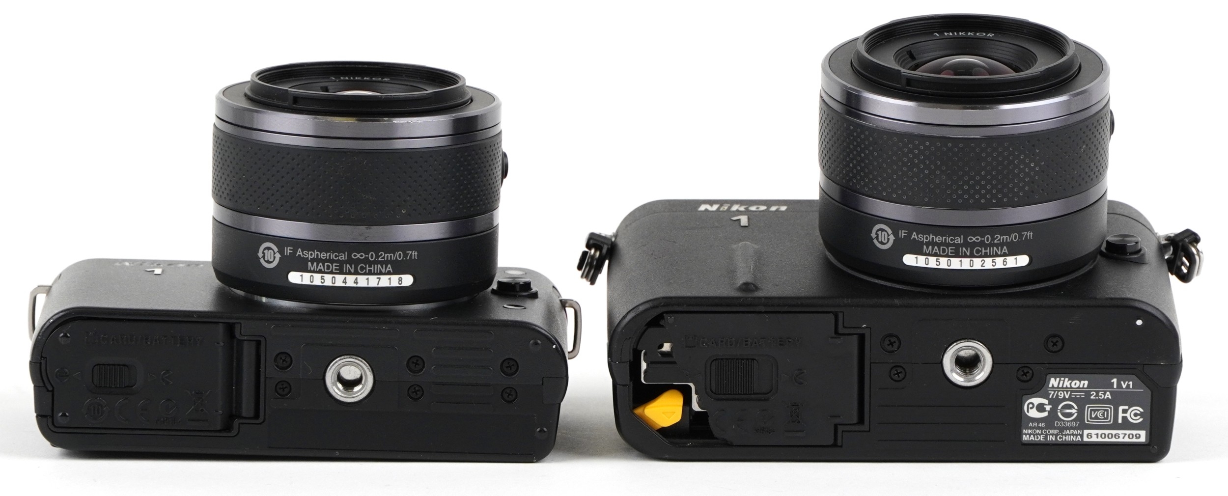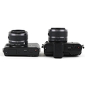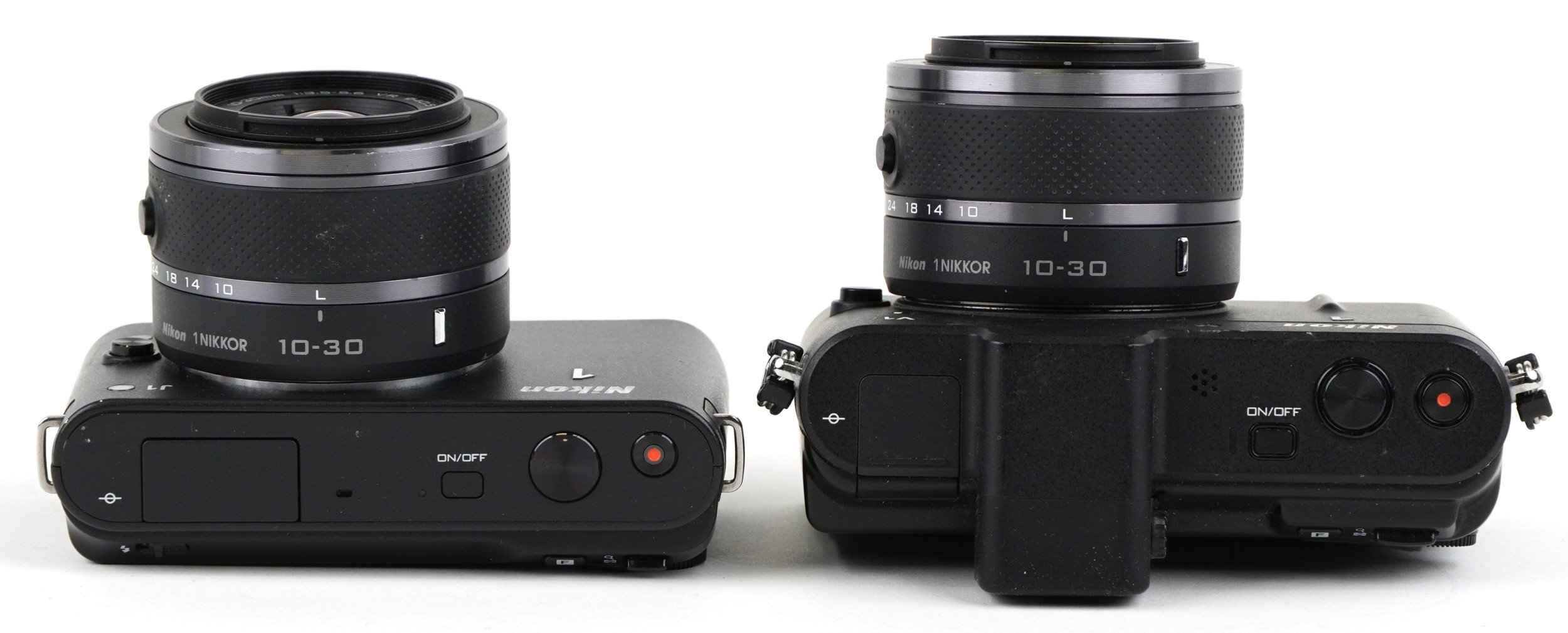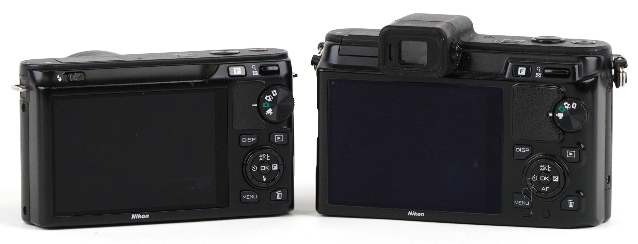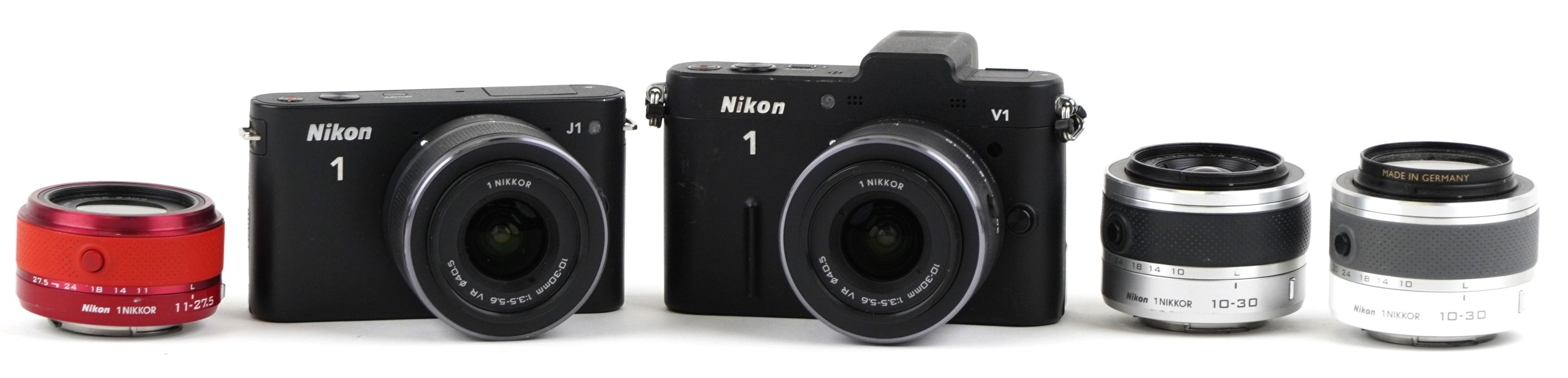 Two Nikon cameras with lenses comprising Nikon 1V1 and Nikon 1J1.