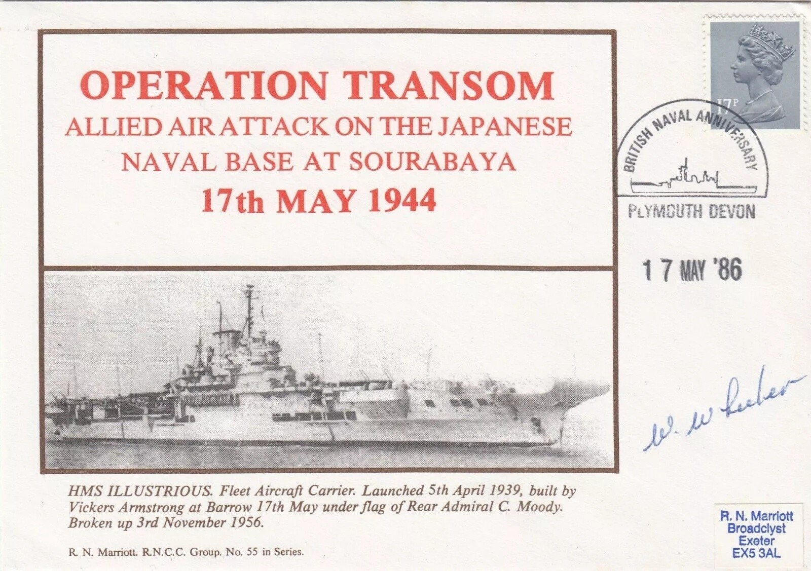 HMS Illustrious Air Attack on Japanese Naval Base at Sourabaya. Signed by W. W. Keeler. HMS Illustrious 17 May 86 Plymouth Operation Transom Allied Air Attack on Japanese Naval Base at Sourabaya. Personally Signed by W. W. Keeler on board at the time. Certified Copy 134 of 186 Reference Number RNCC55. Single Vendor RAF cover collection. Good condition. All autographs come with a Certificate of Authenticity. We combine postage on multiple winning lots and can ship worldwide. UK postage from £5.99, EU from £7.99, Rest of World from £9.99