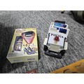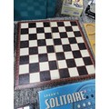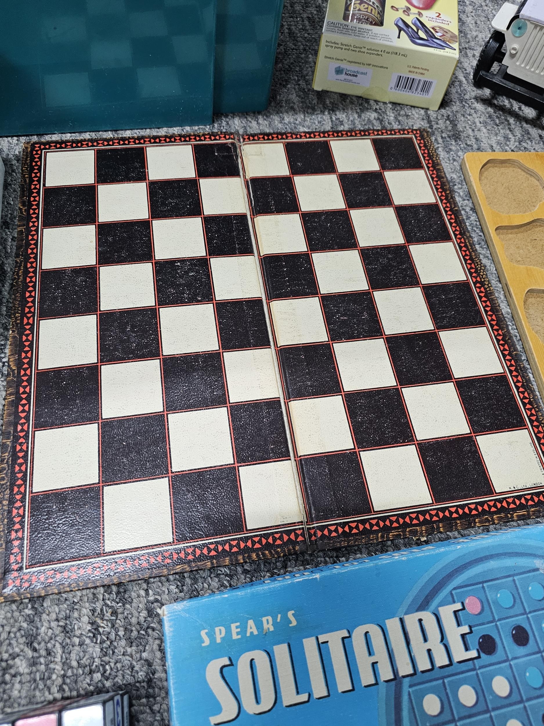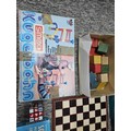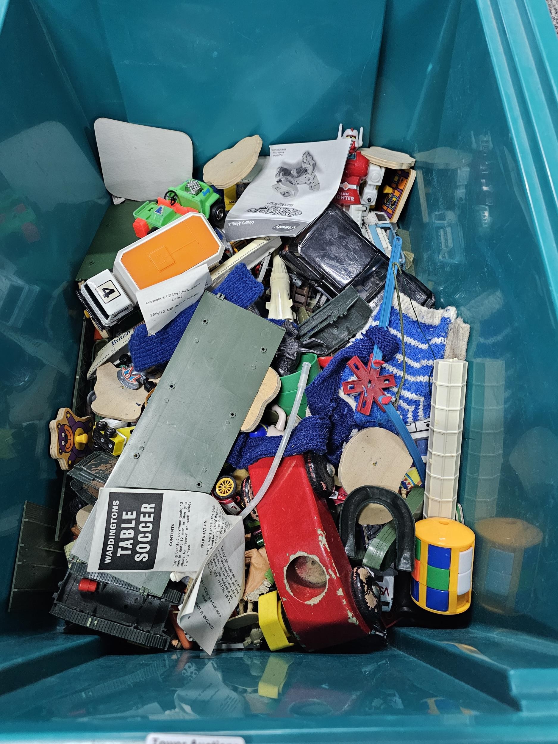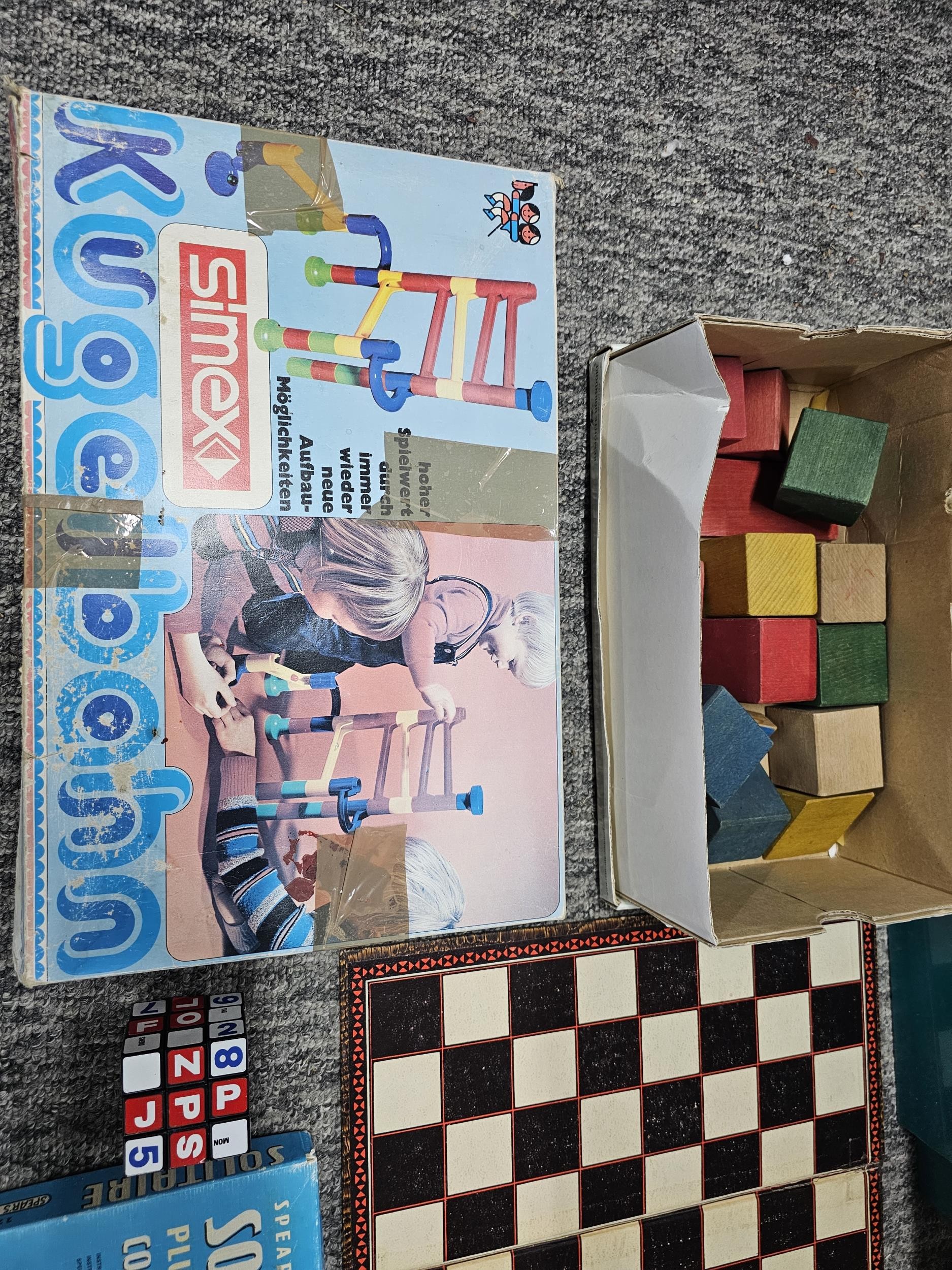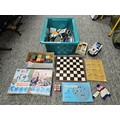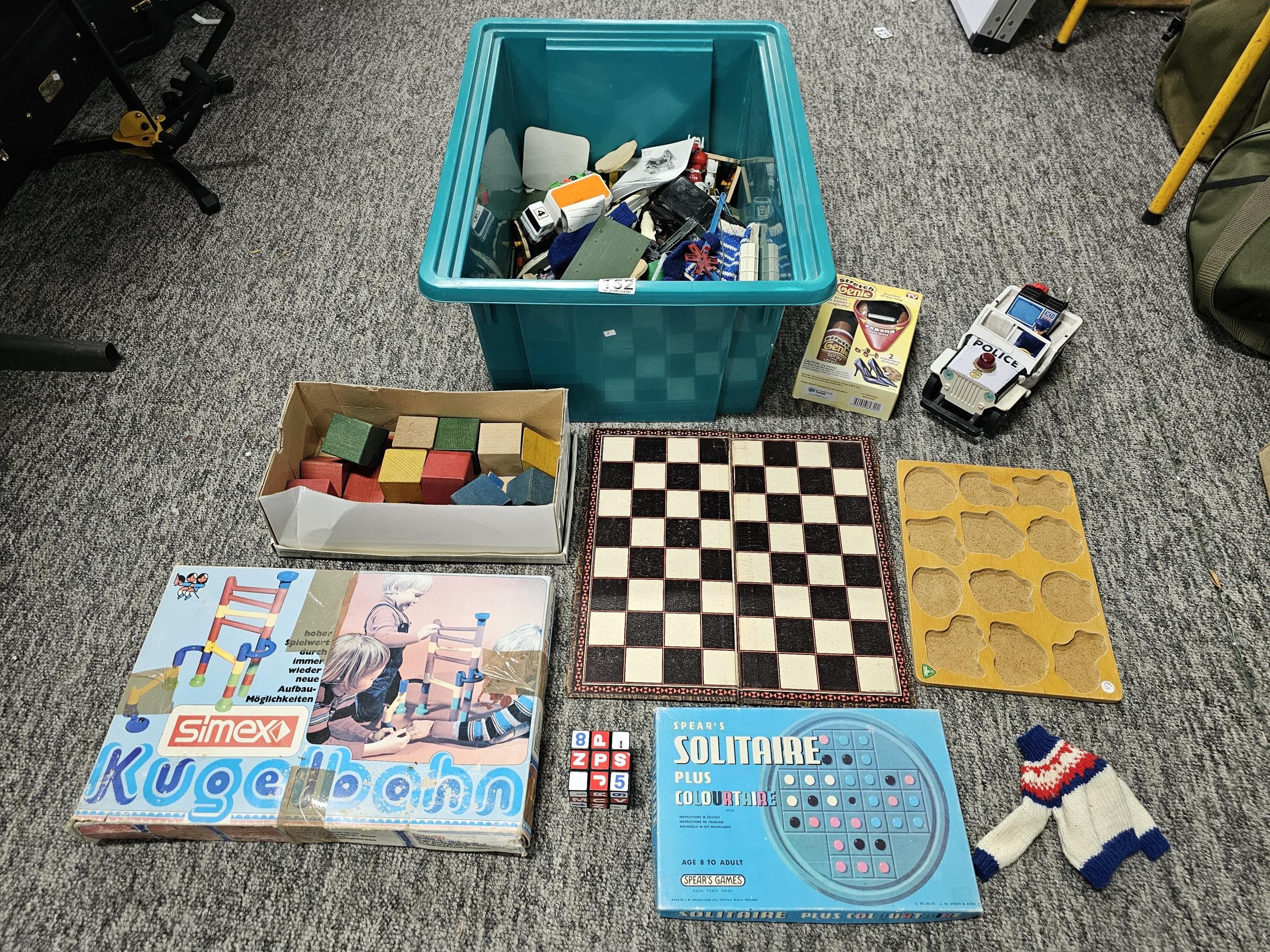 Green crate containing a large quantity of assorted toys to include wooden building blocks, chess board, boxed solitaire etc