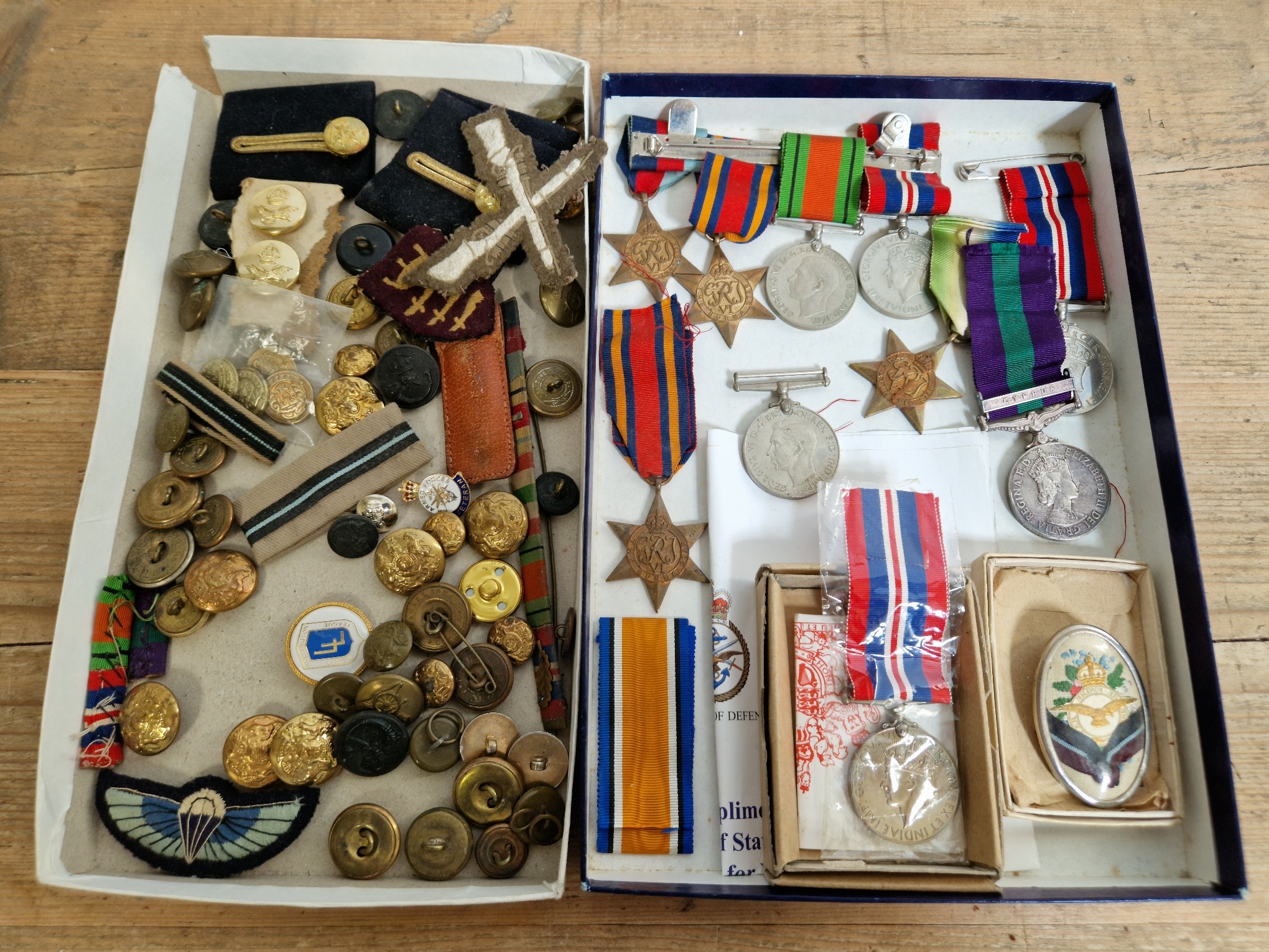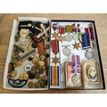 A tray of various medals to include four Star medals ( two The Burma Star, one The 1939- 1945 Star and one The Atlantic Star ), five George VI medals and one Elizabeth II silver medal awarded to 23248047 Fus. J. Dunn. Lancashire Fusiliers ( Cyprus ) together with a tray of various buttons and patches.