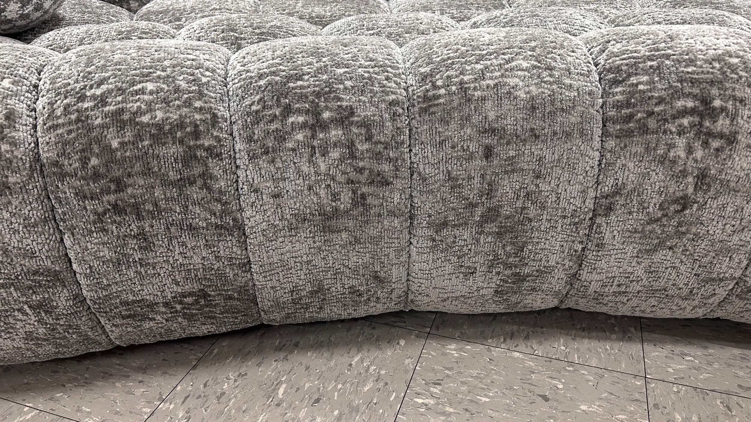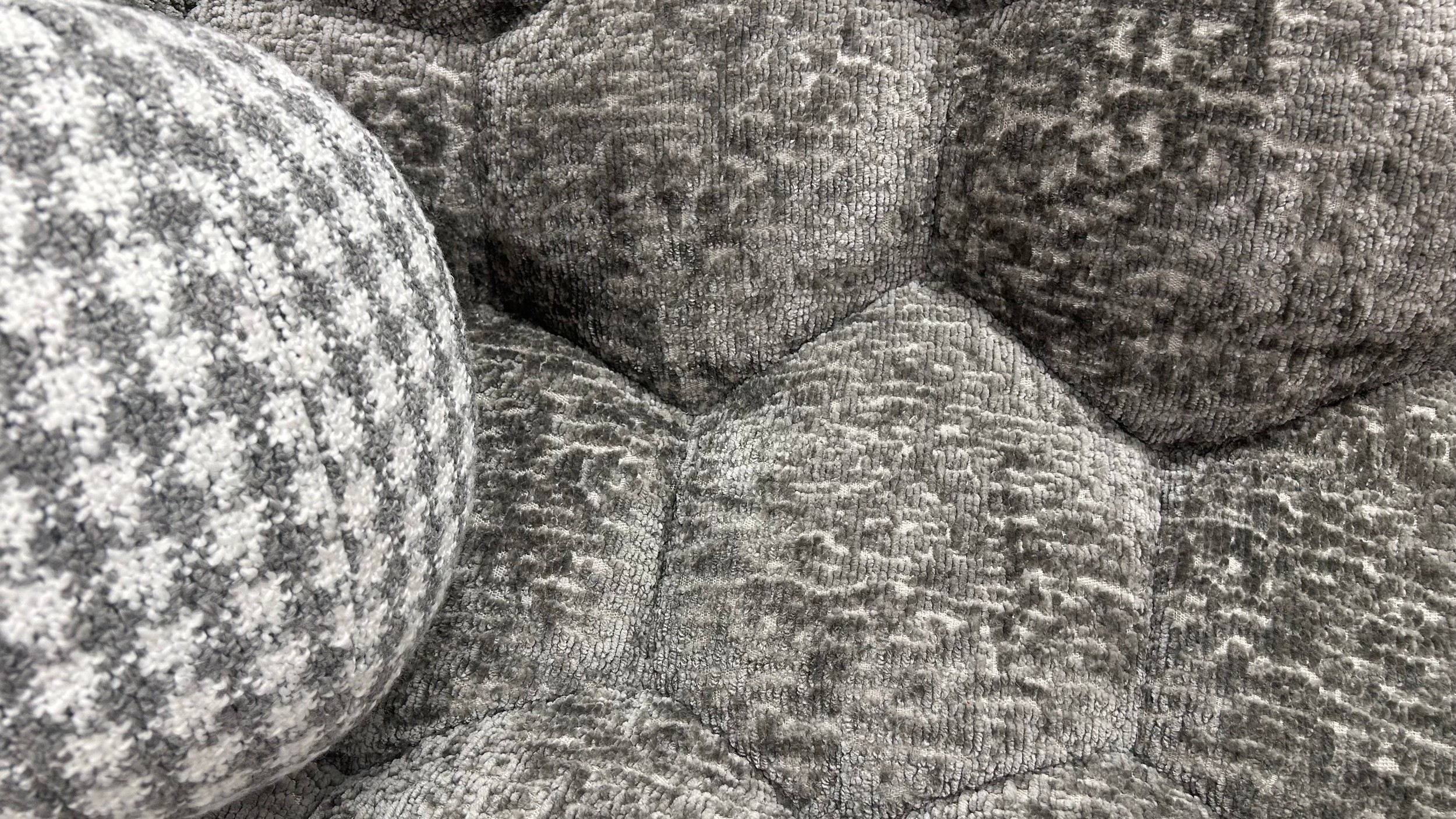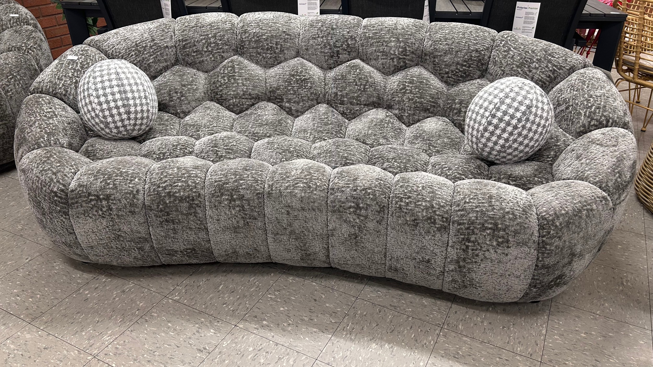 An Aero Bubble Grey Chenille Sofa with contrasting scatter cushions