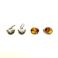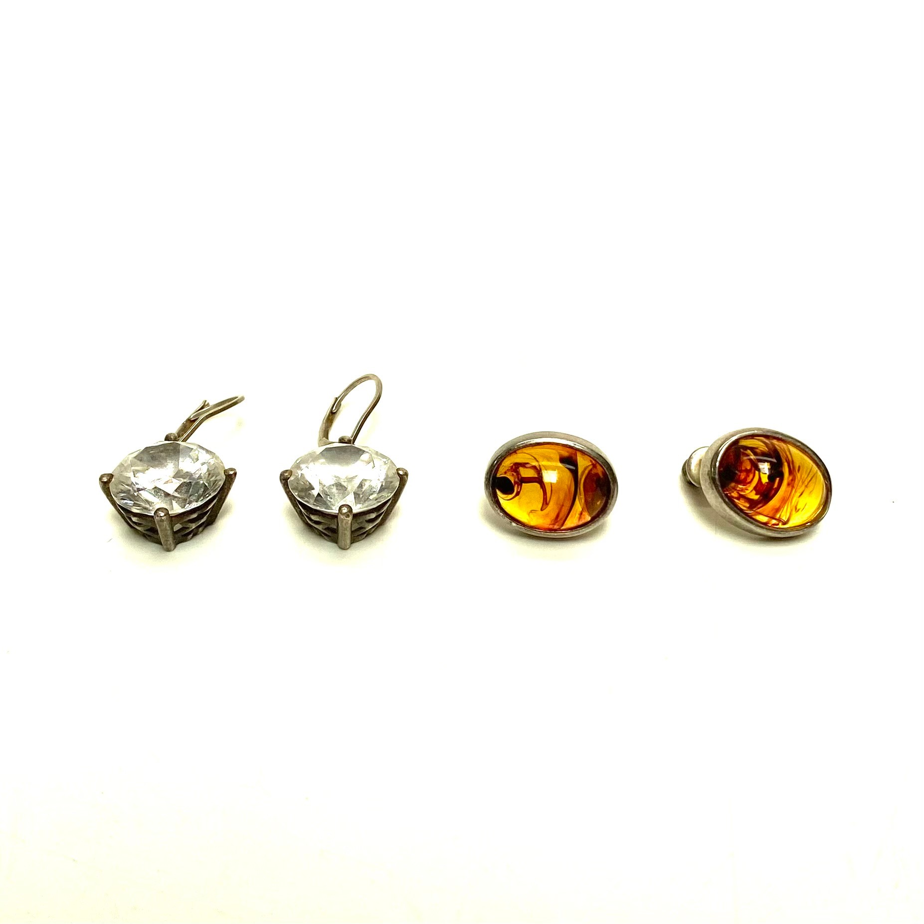 2 pairs of Silver earrings, one pair with Amber and one dangle style pair with large clear stones.