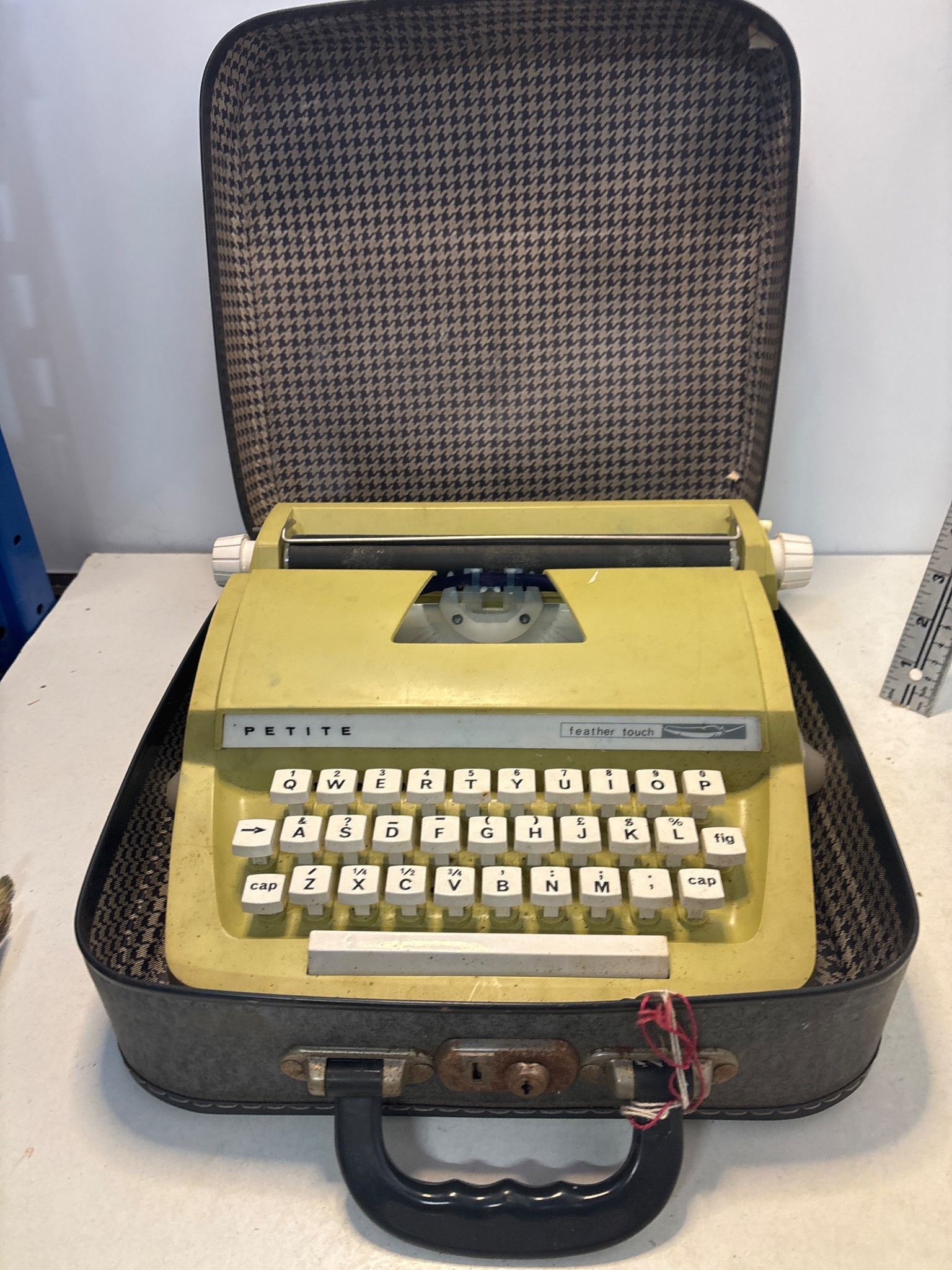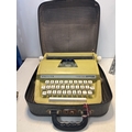 Petite manual typewriter in yellow with carrying case.