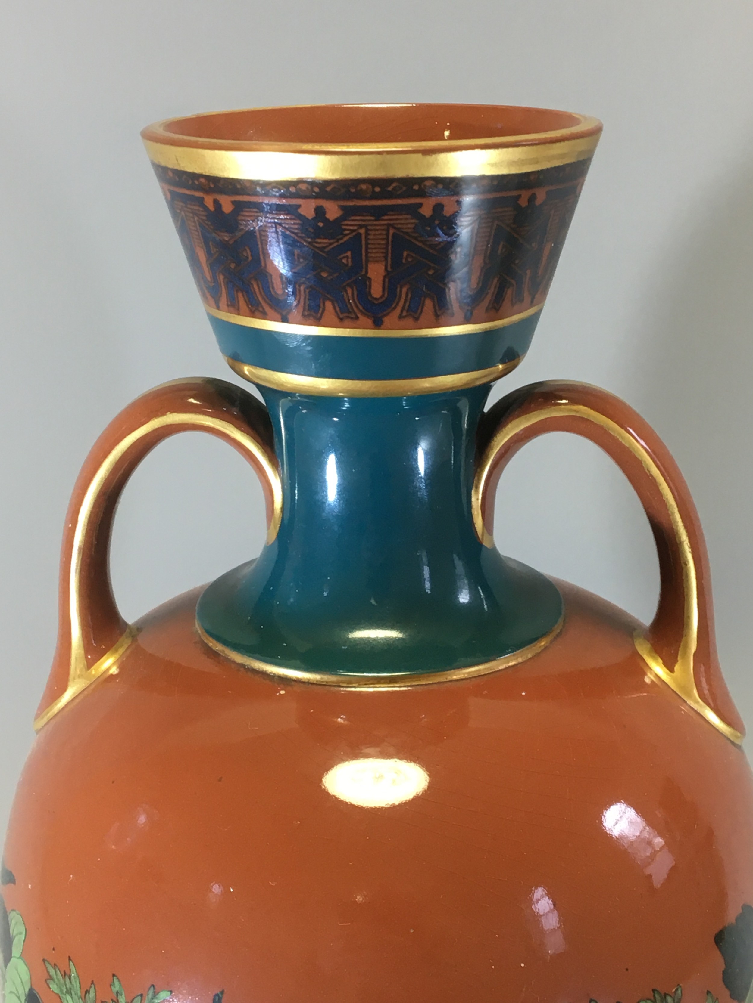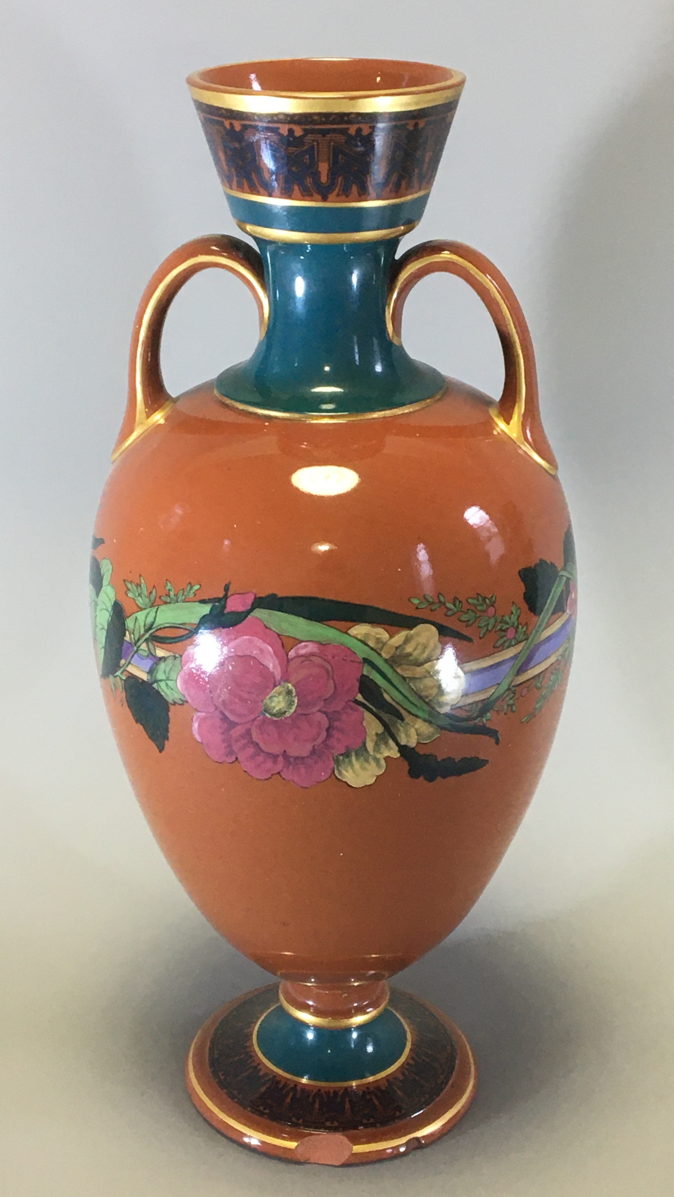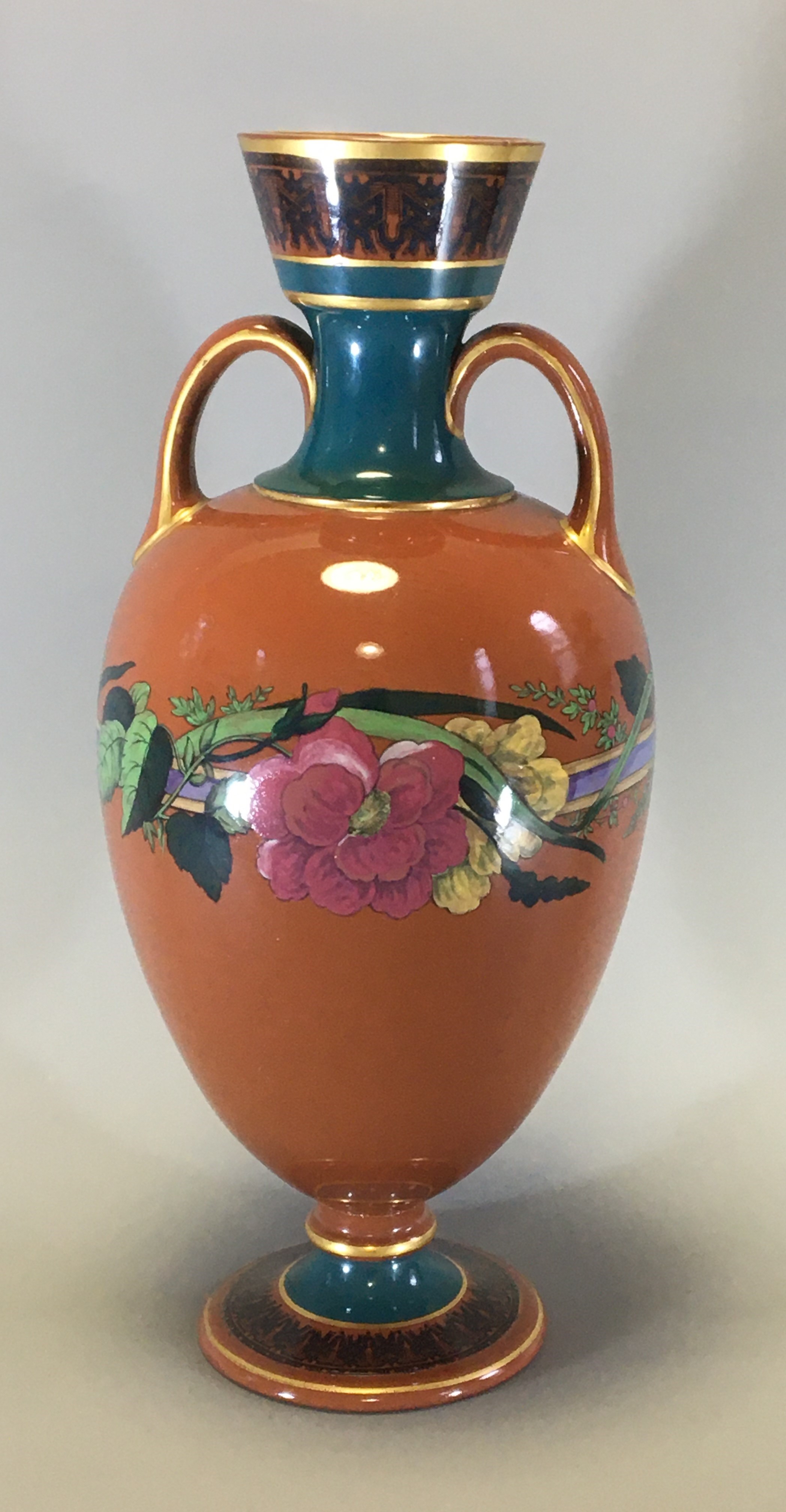 Tall and Unusual Davenport Longport Staffs Amphora Shaped Vase. Floral Swag Motif on a Terracotta Ground. Gilt Decoration with Greek Style interlocking Pattern.