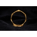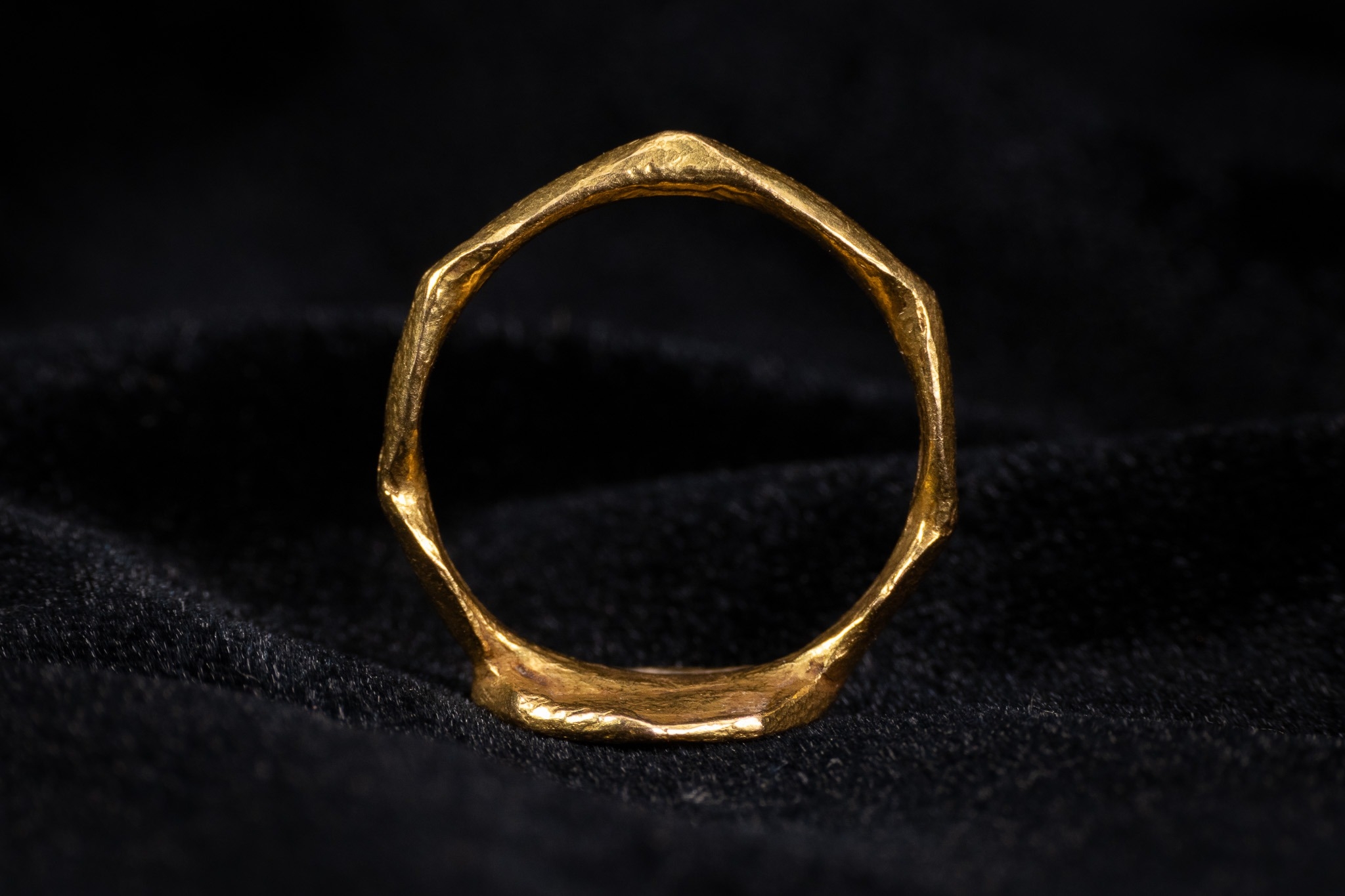 A hand-wrought high-carat yellow gold signet ring of the Byzantine period. The object features a flat, irregularly octagonal bezel joined to a faceted shank with an octagonal cross-section and a hammered finish. The bezel is deeply engraved in intaglio with a cruciform monogram, a design used for personal identification and as a seal. The central cross features flaring terminals. Within the four fields created by the cross are engraved Greek characters: a C at the top, a Theta (Ã�) to the left, a K to the right, and a Delta (Ãâ) or Alpha (A) at the base. This specific arrangement of characters is typically interpreted as the proper name Theodoros.
