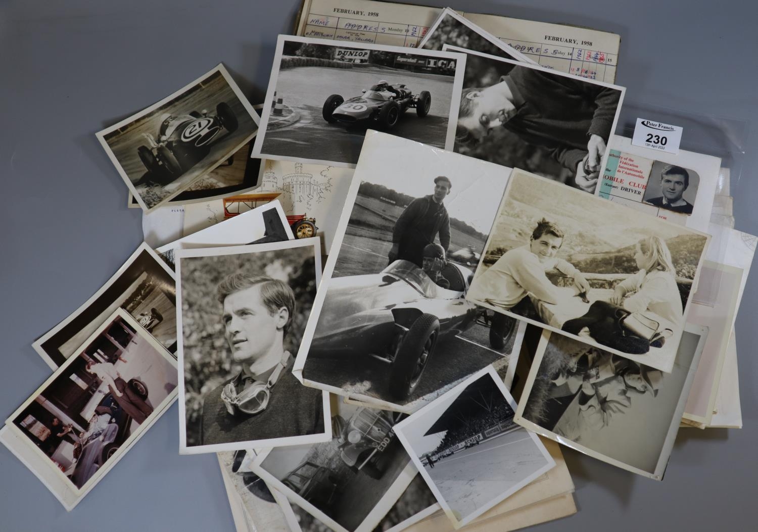 Collection of motor racing ephemera relating to Jack R Lewis of Stroud, Gloucestershire, including his FIA Royal Automobile Club competitor driver licence, photographs of various cars to include Brabham, BRM, and others, motor cycle photographs, portraits, etc. Together with assorted correspondents, much of it to his wife from different countries including Pow(?), Kitzbuhel, etc. All addressed to Miss Andrea Larson.
