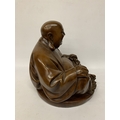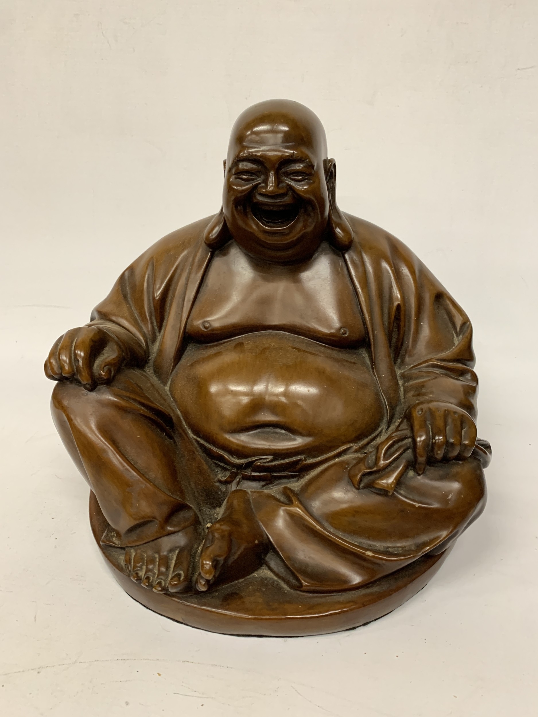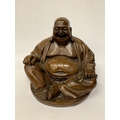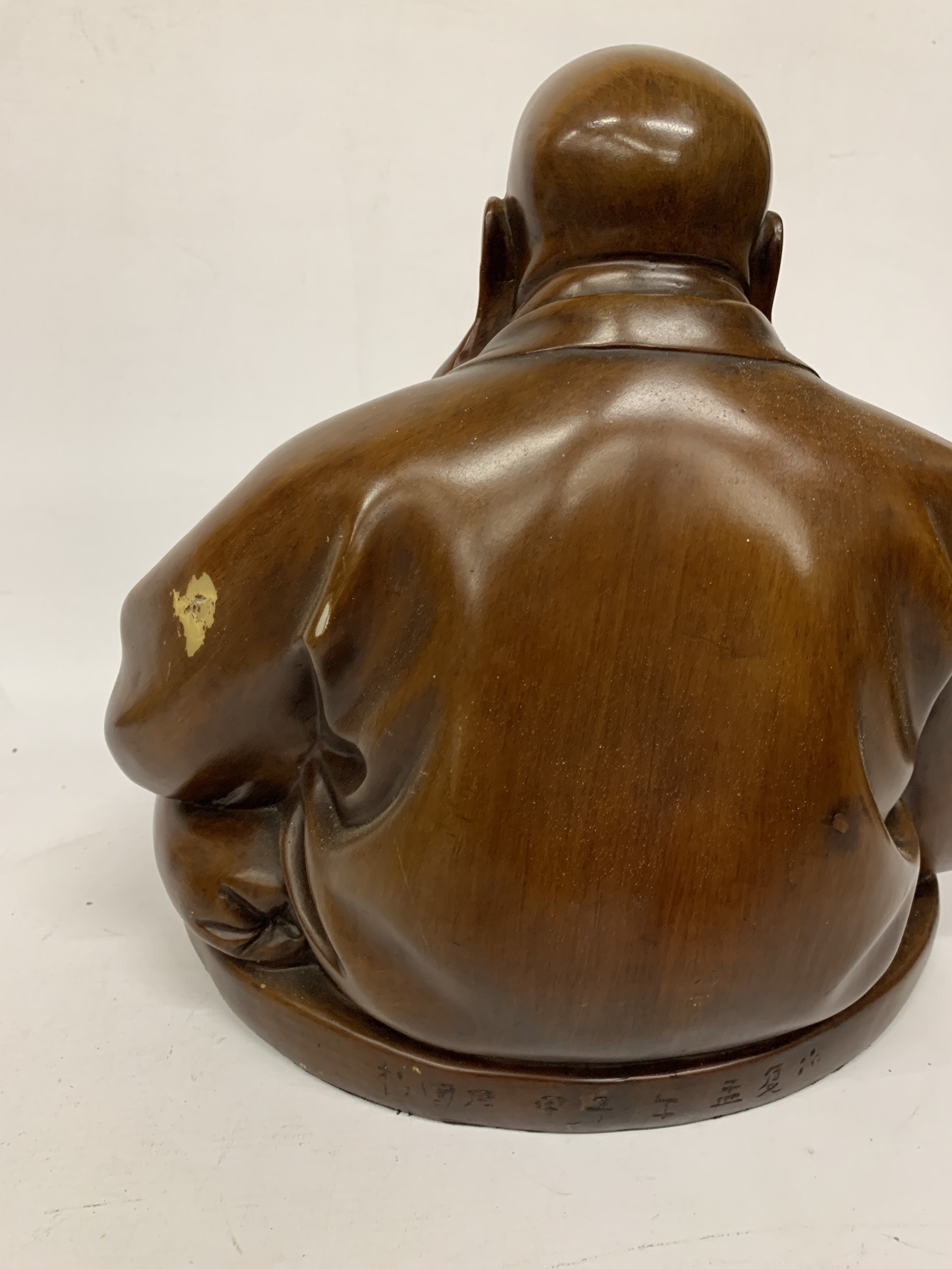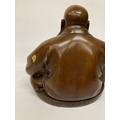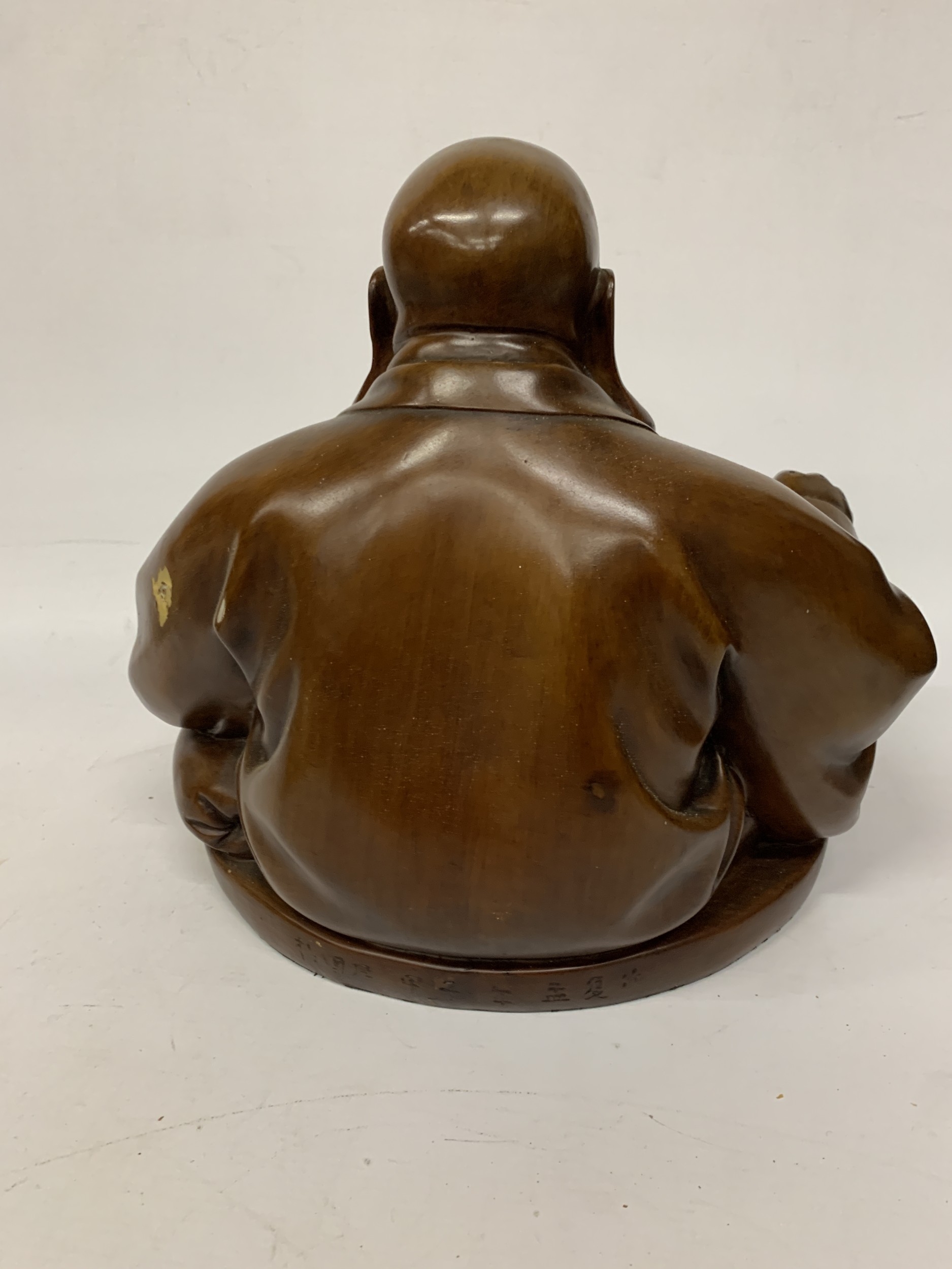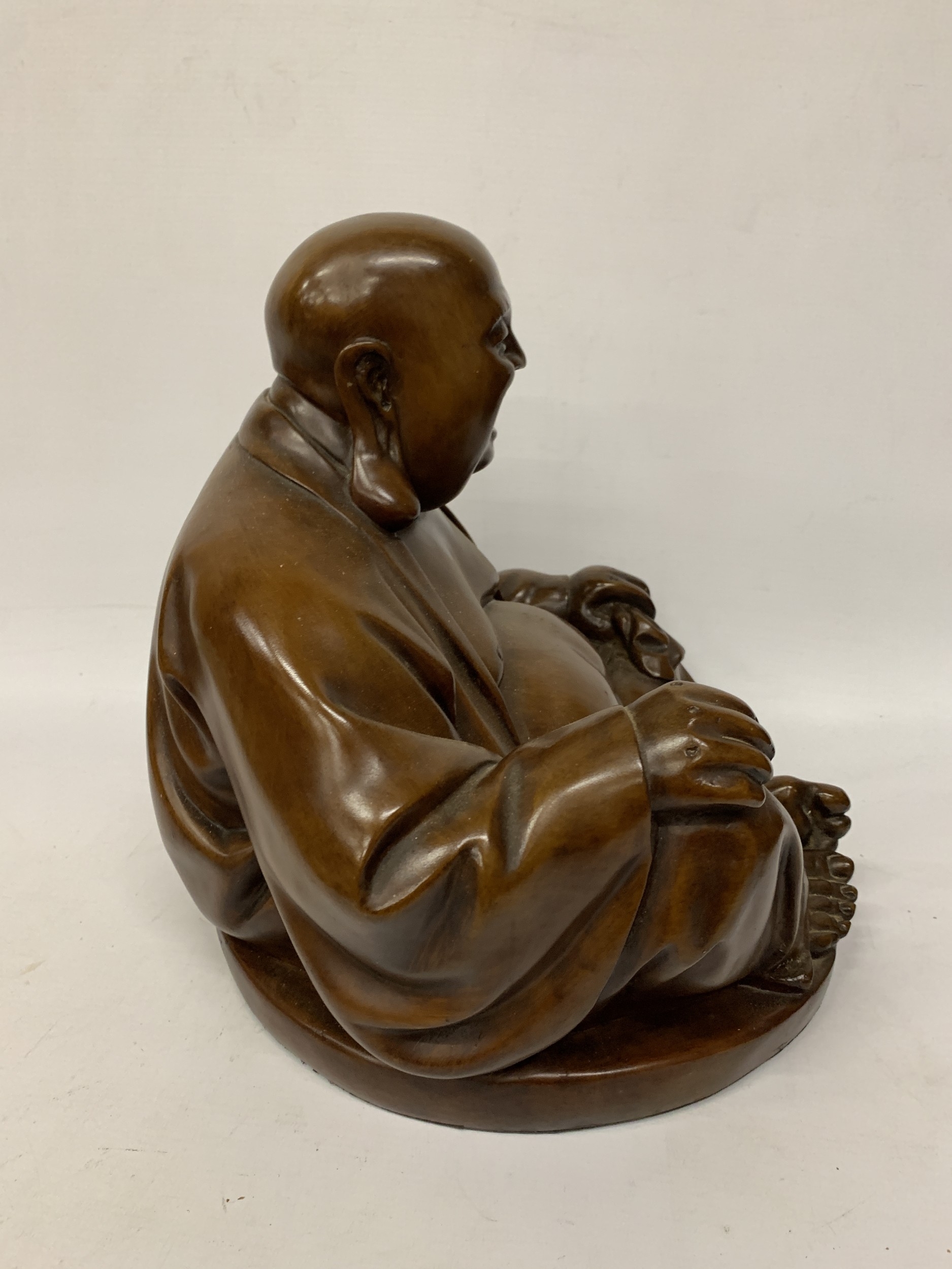 A VINTAGE CARVED WOODEN FIGURE OF A LAUGHING BUDDHA - APPROX. 32 CM (H)