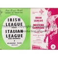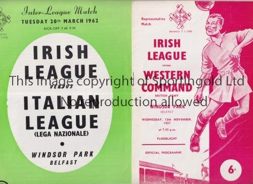 IRISH LEAGUE Two home programmes for matches played at Windsor Park, Belfast v Western Command 13/11/1957 and v Italian League 20/3/1962, staple removed. Good