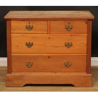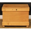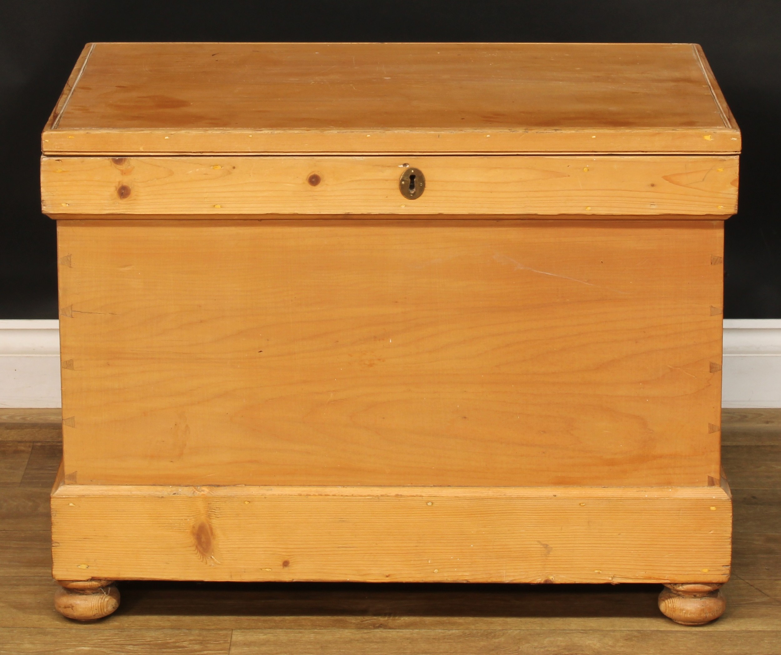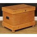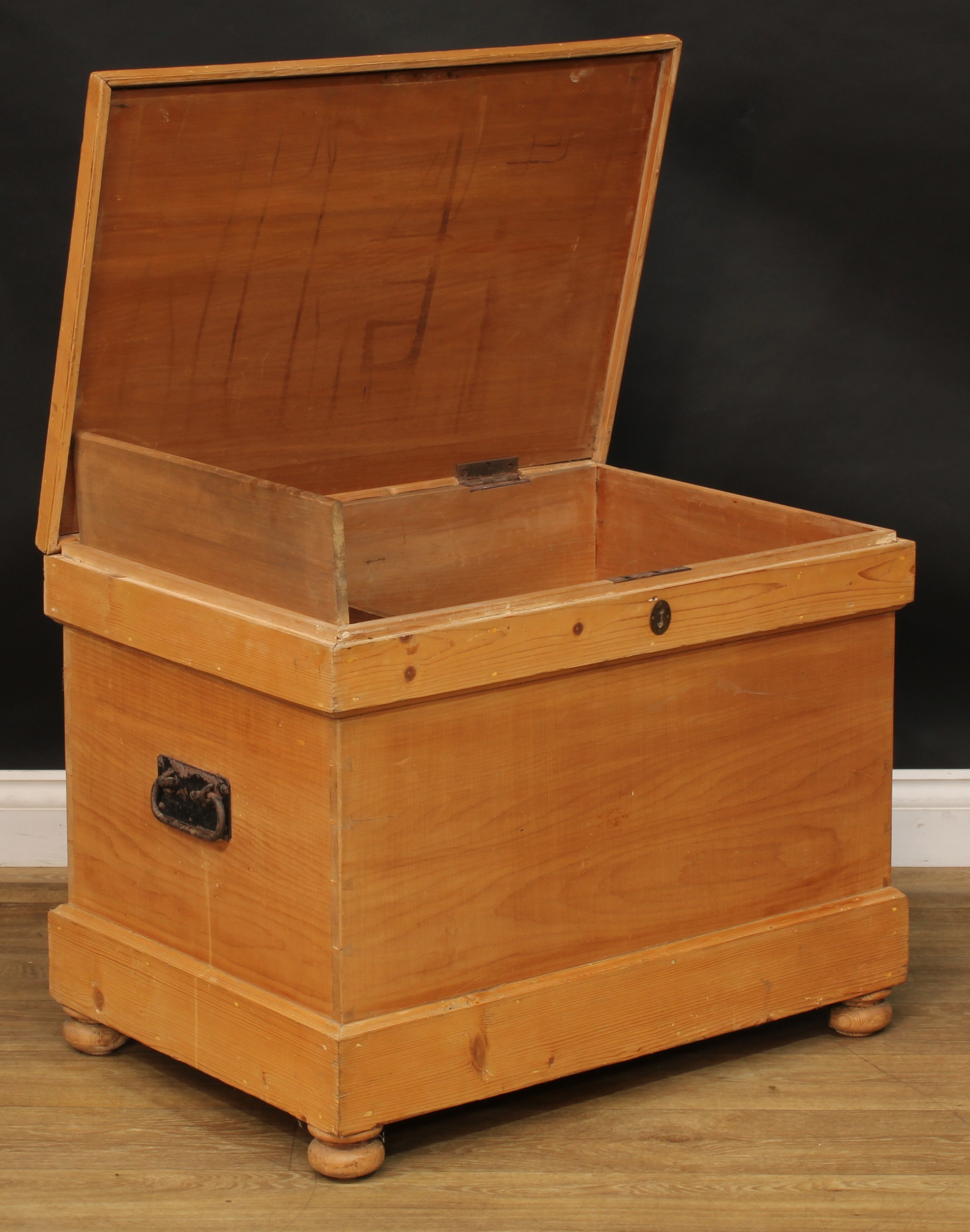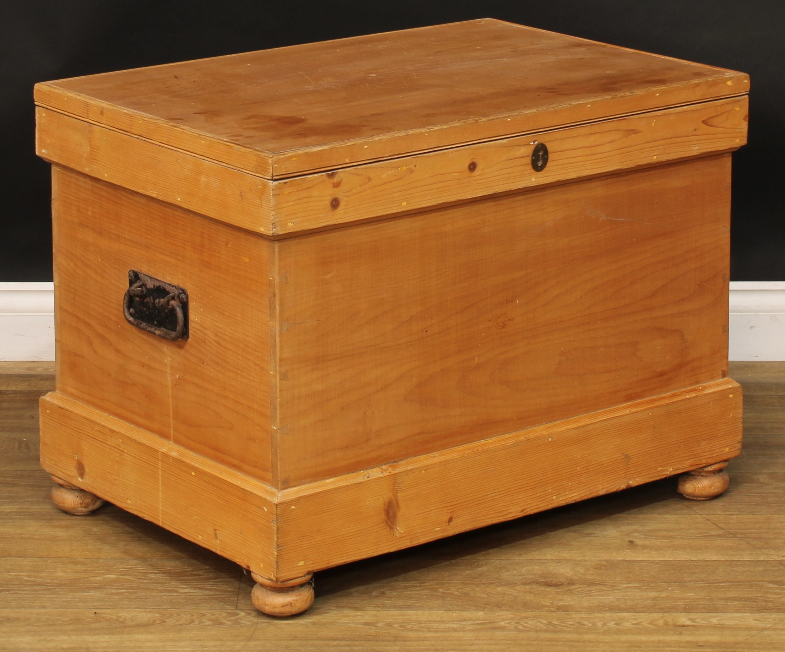 A late 19th/early 20th century pine blanket chest, hinged top enclosing a till and two small drawers, carry handles to sides, turned feet, 56.5cm high, 75.5cm wide, 52cm deep