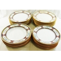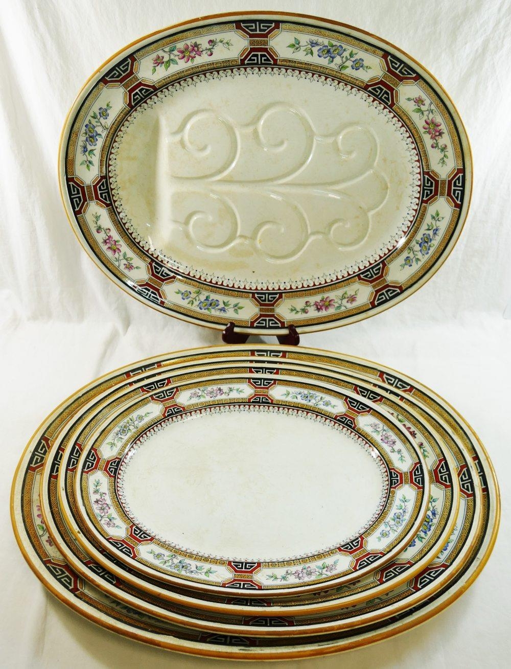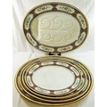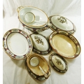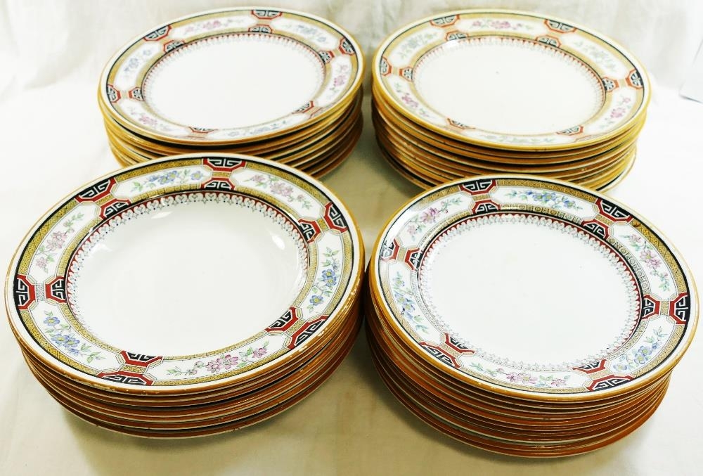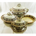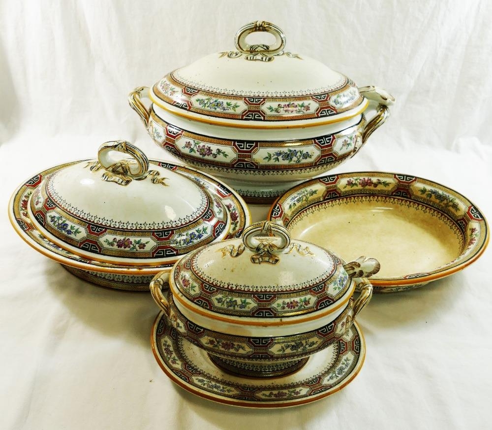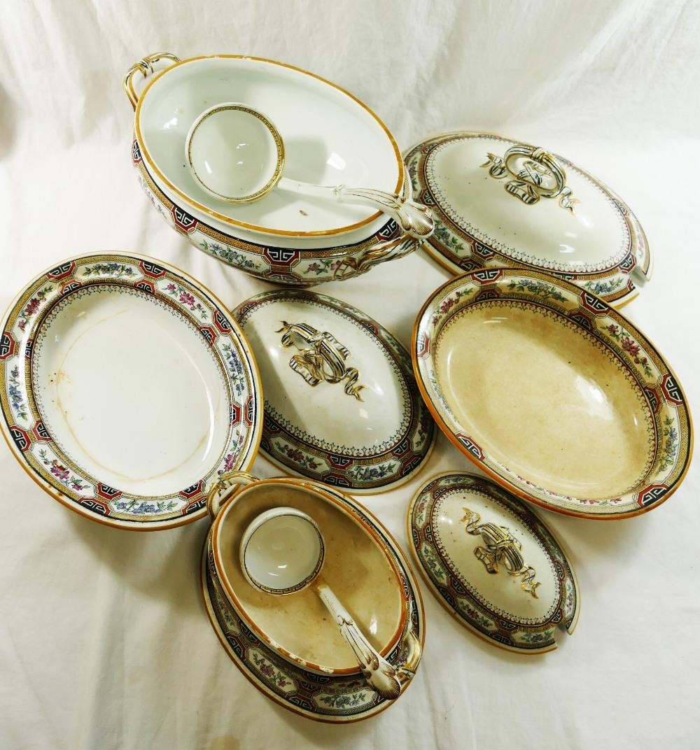 A large quantity of Minton 'Chinese Key' dinnerware comprised of two large oval serving plates, 55cm long, and three graduated smaller oval plates, a soup tureen and stand, a sauce tureen and stand, each with unassociated ladle, a vegetable tureen, 19 dinner plates, ten side plates, seven soup plates and one oval bowl