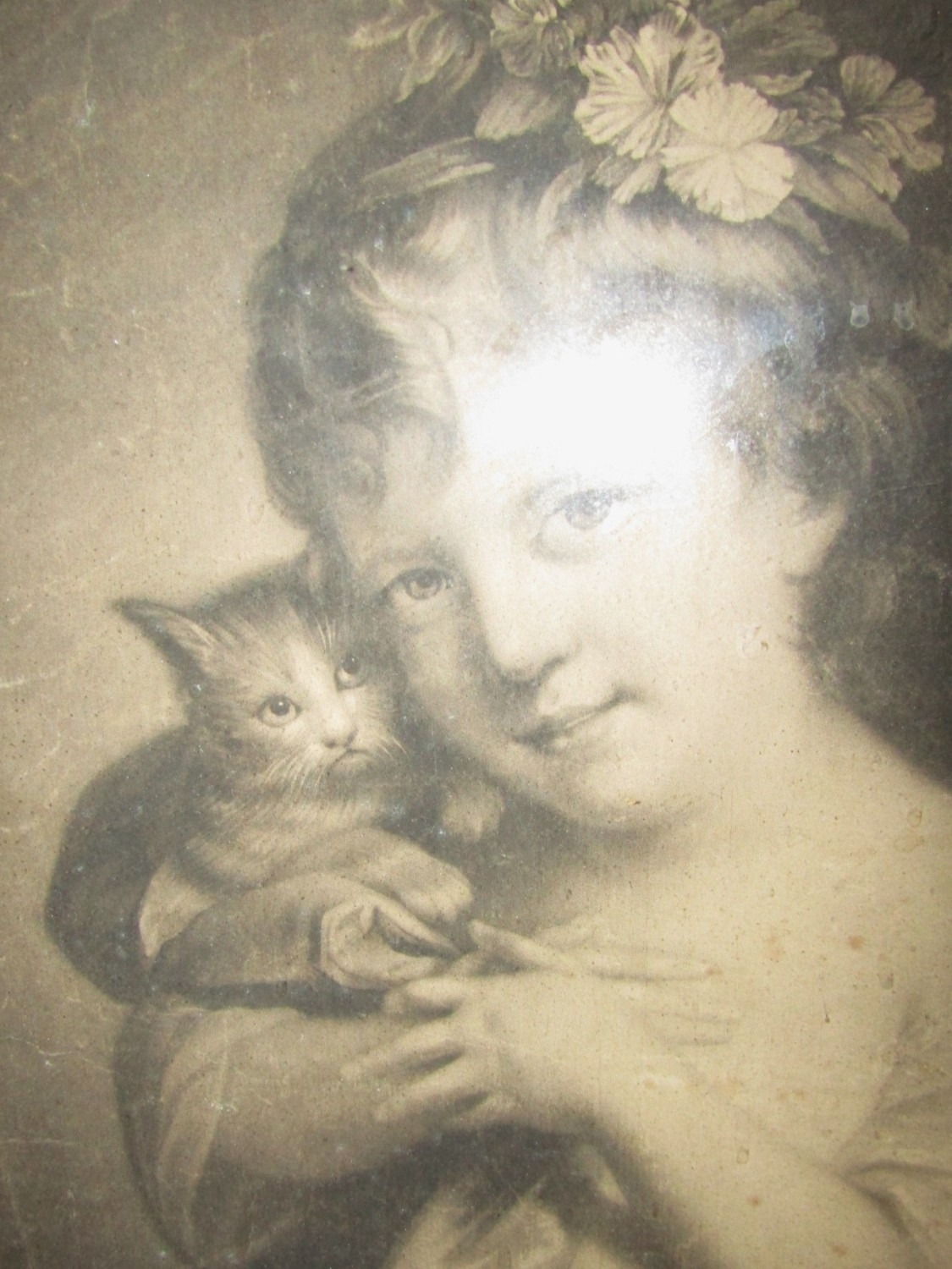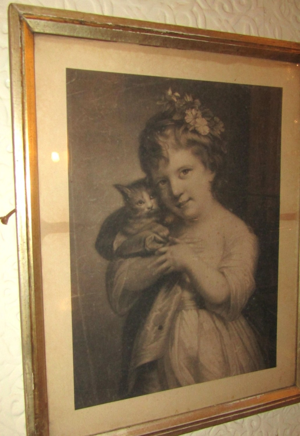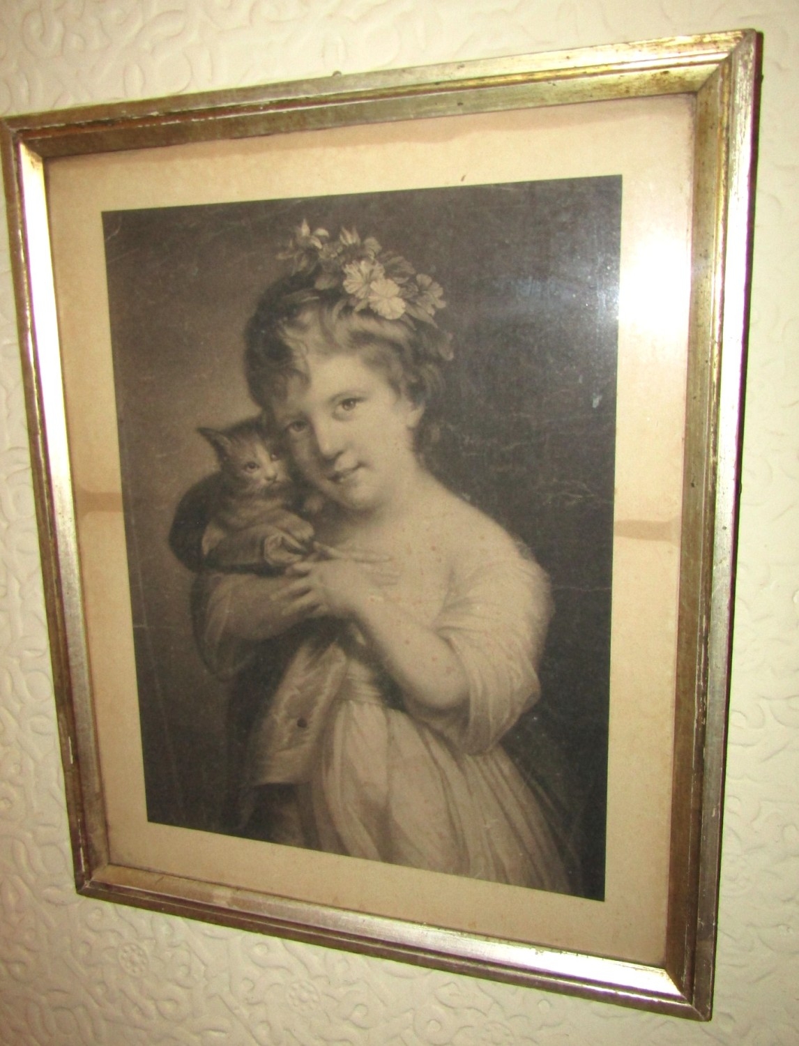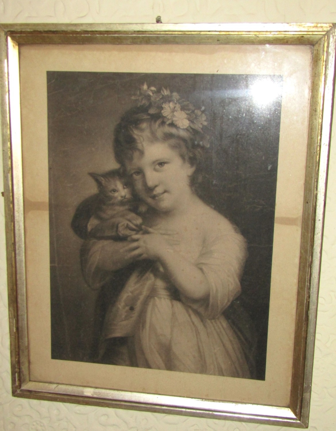 Irish School Antique Engraving Girl with Kitten Contained Within Silver Gilt Frame Regency Approximately 20 Inches High x 15 Inches Wide