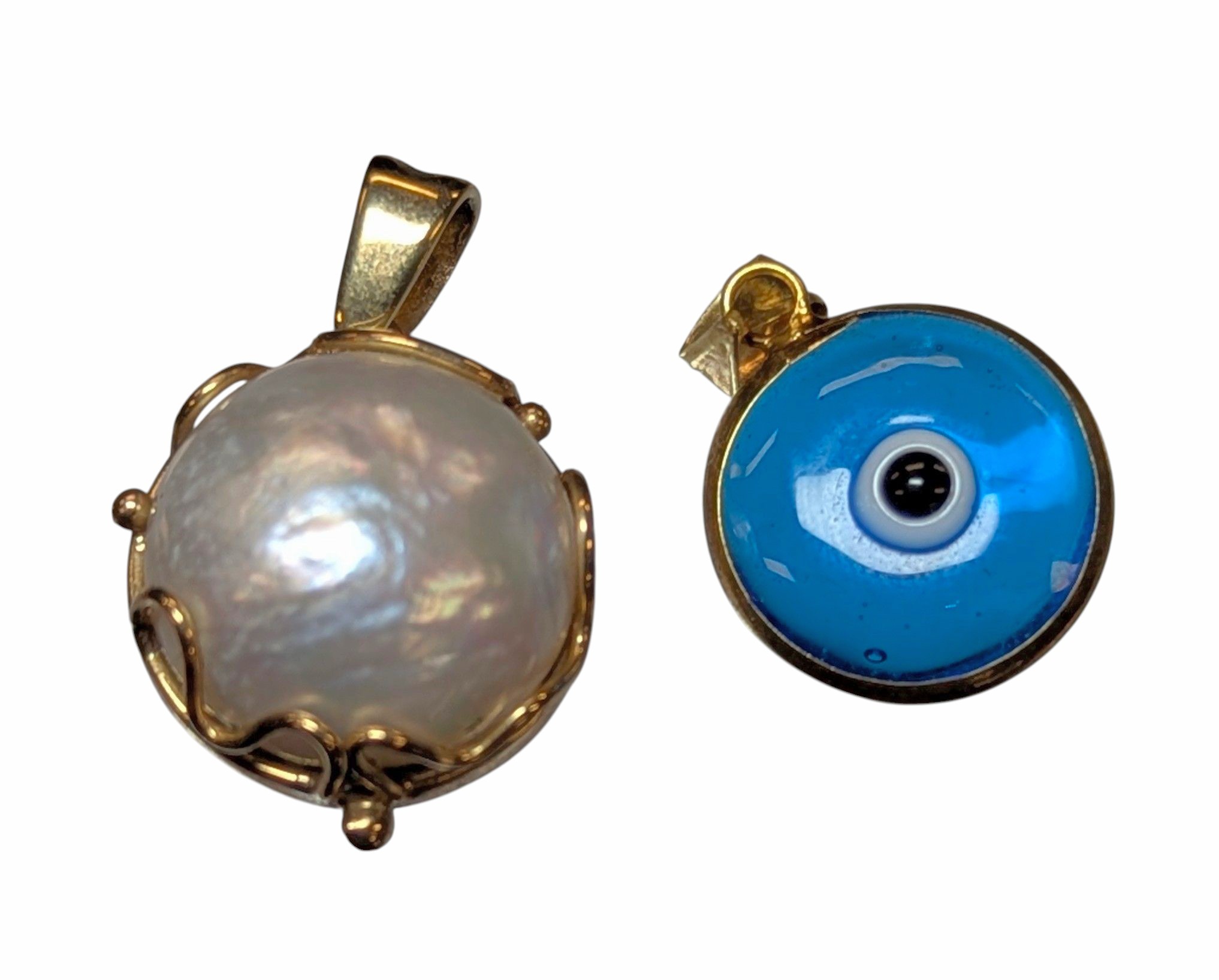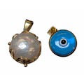 A 9ct gold mounted mabe pearl pendant and a 14ct gold mounted Turkish eye design blue glass pendant,