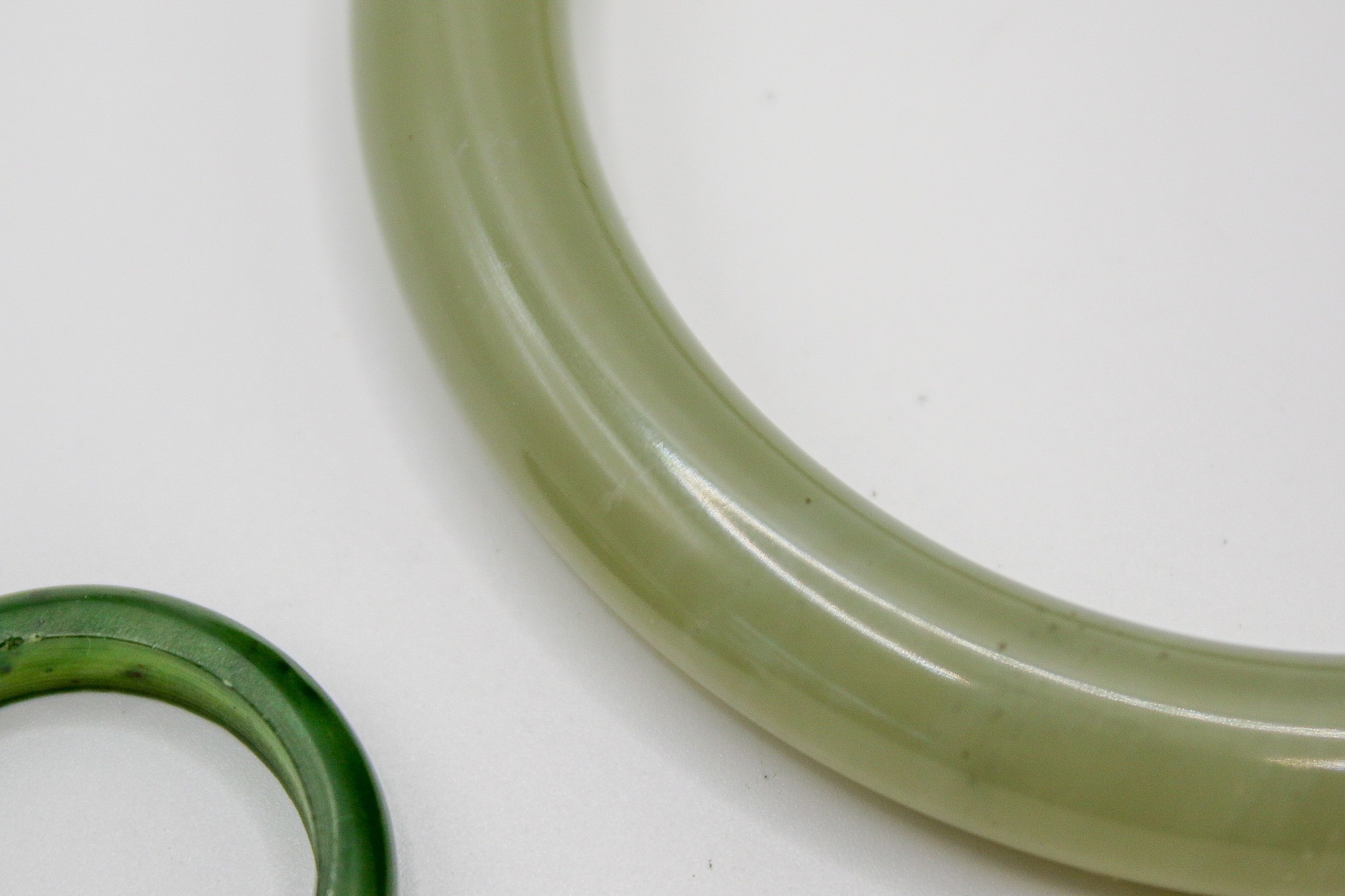 A pale green jade bangle and a ring. The bangle with pale cloudy sections and a couple of darker spots, width 0.9mm, to the inside and with polished convex outside, inner diameter 1.8cm, size R. Aquired in China in the 1980s.