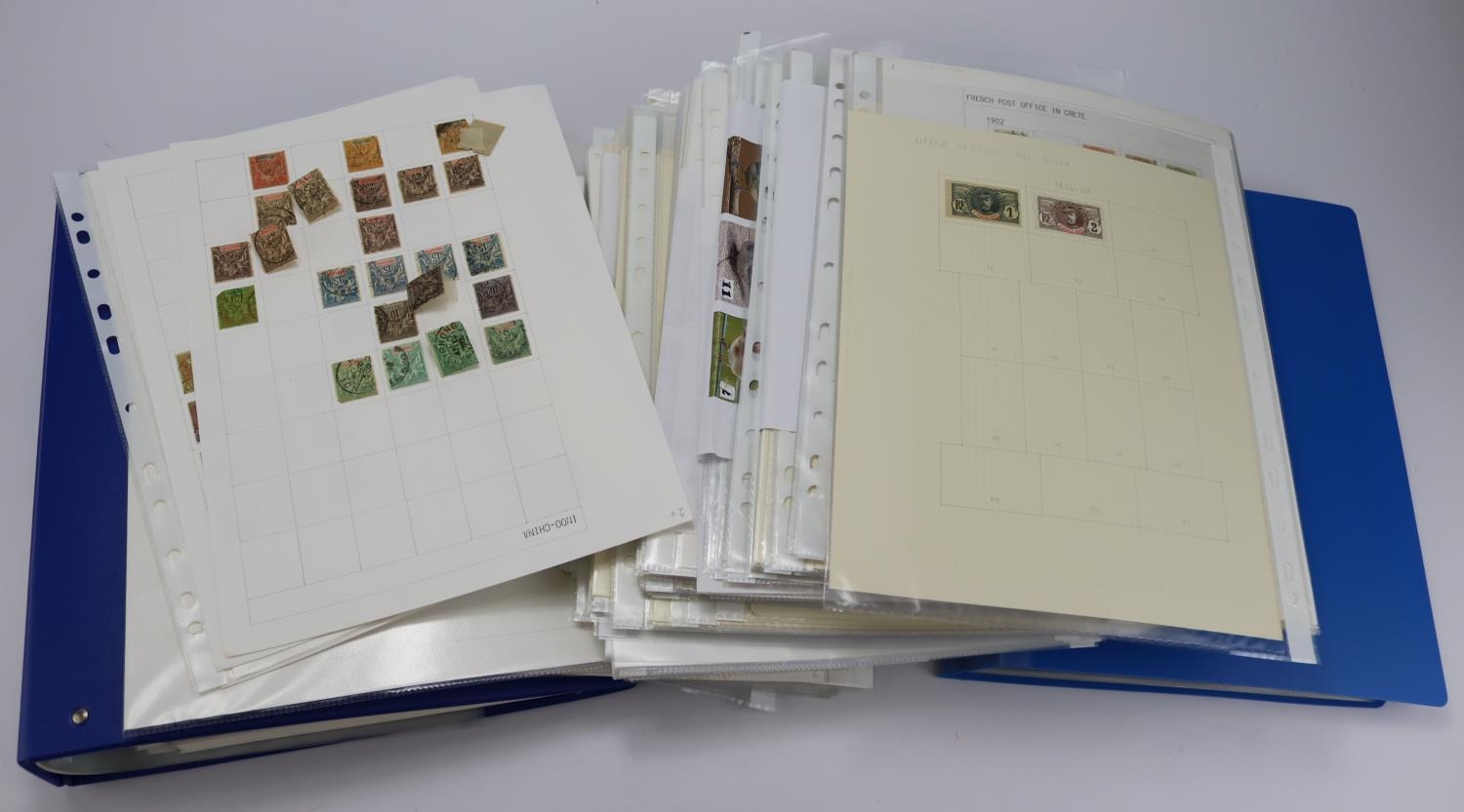 France and French Colonies, up to late 1950's, duplicated used France in binder with emphasis on early material, lacking the high catalogue values but a few better non-definitives noted. Wide coverage of French Colonies, well laid out on albums pages, a mix of mint & used, the latter usually the low values of a set. The occasional complete set m & u. Approx 120 album pages in GC, likewise in binder. Housed in a black box. (qty)