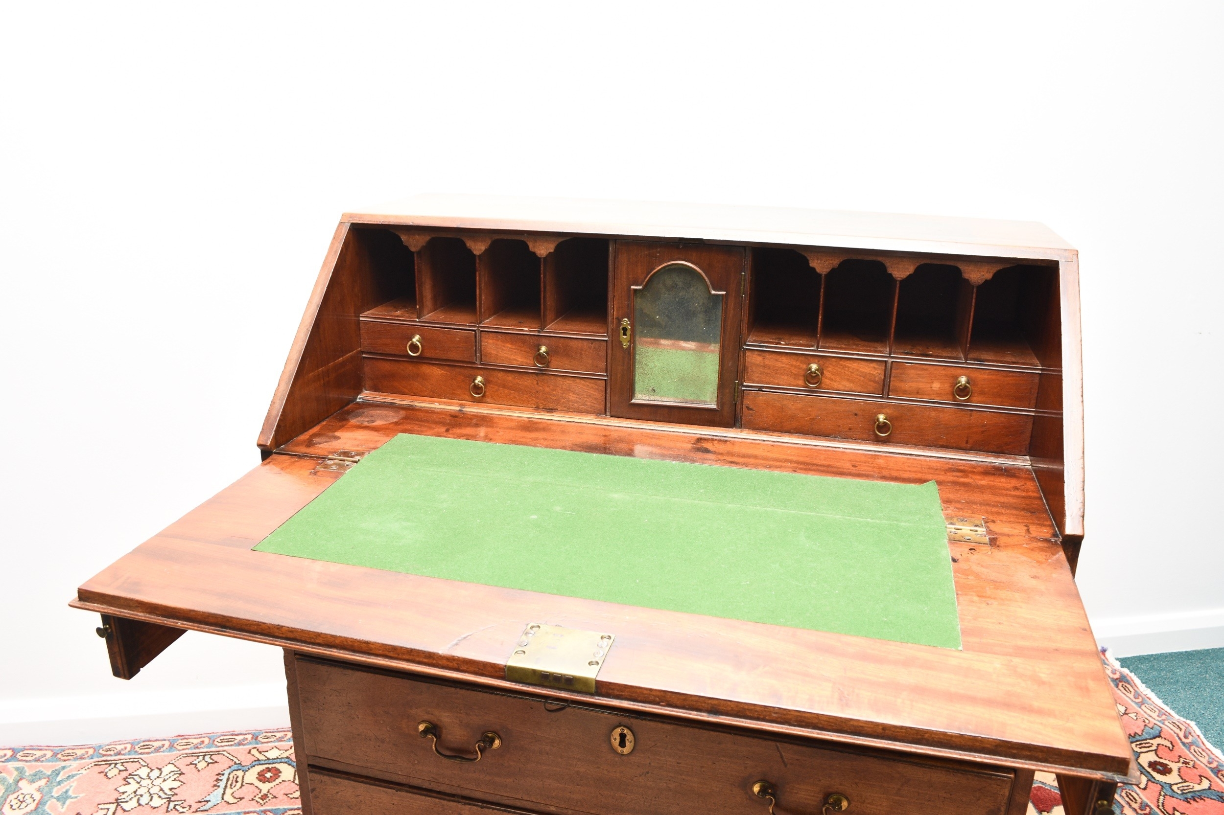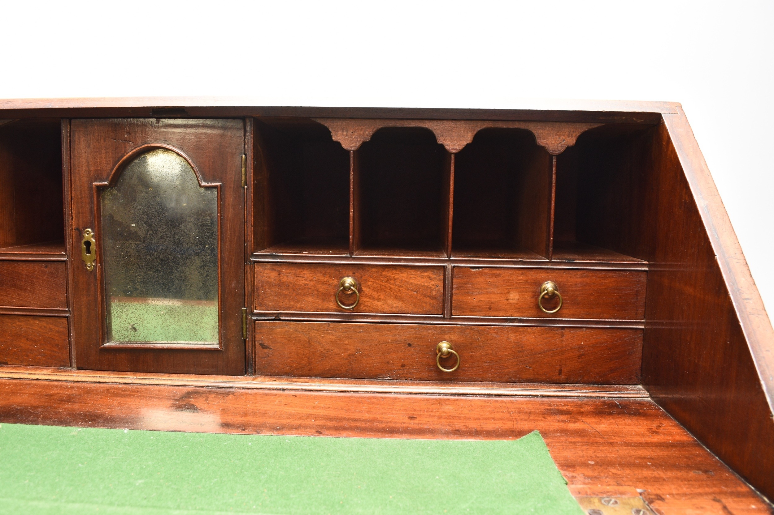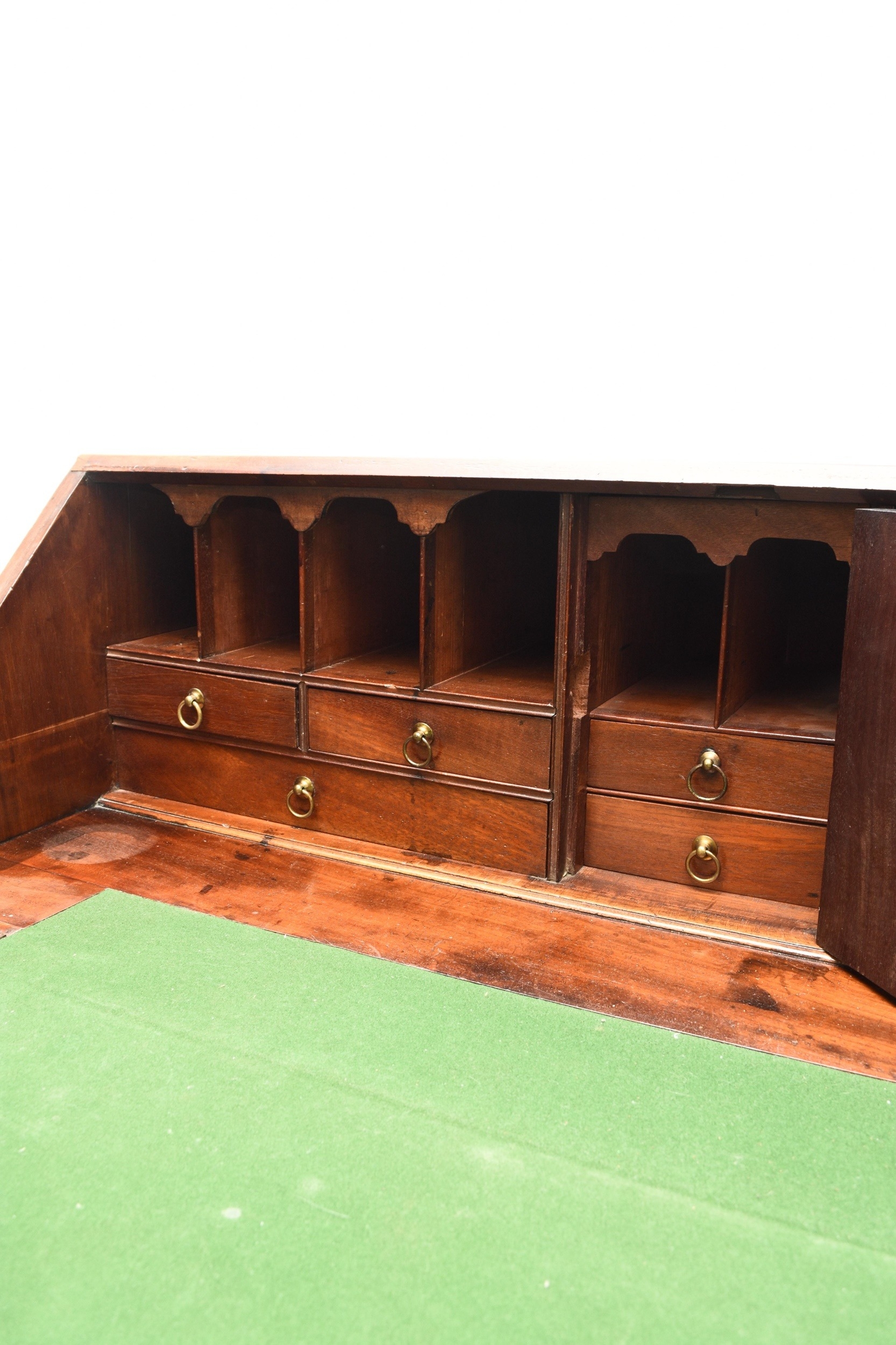 A George III mahogany bureau The cross-banded fall front enclosing a fitted interior with six drawers and eight pigeonholes arranged around a central mirror-fronted cupboard, above four graduated long drawers, raised on bracket feet, with key. 97cm wide x 52cm deep x 107cm high Wirswall Hall, Whitchurch, Shropshire. Condition:Generally good with some cosmetic marks and signs of age and use. Top has some old staining. Left side has a fine split. The fall front is slightly warped. The interior is good with a later replaced baize skiver. No evidence of worm.
