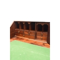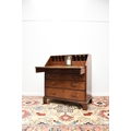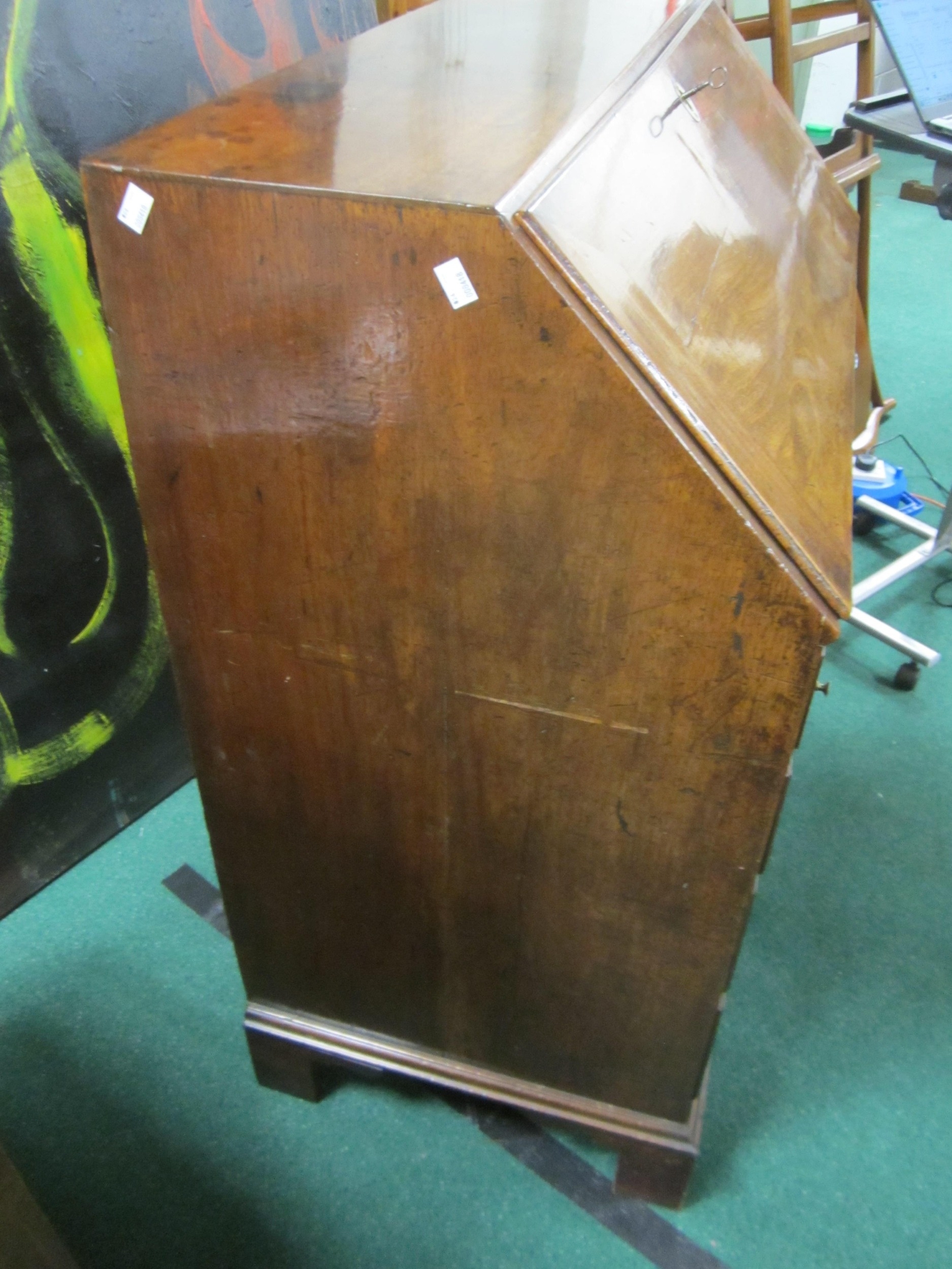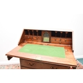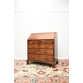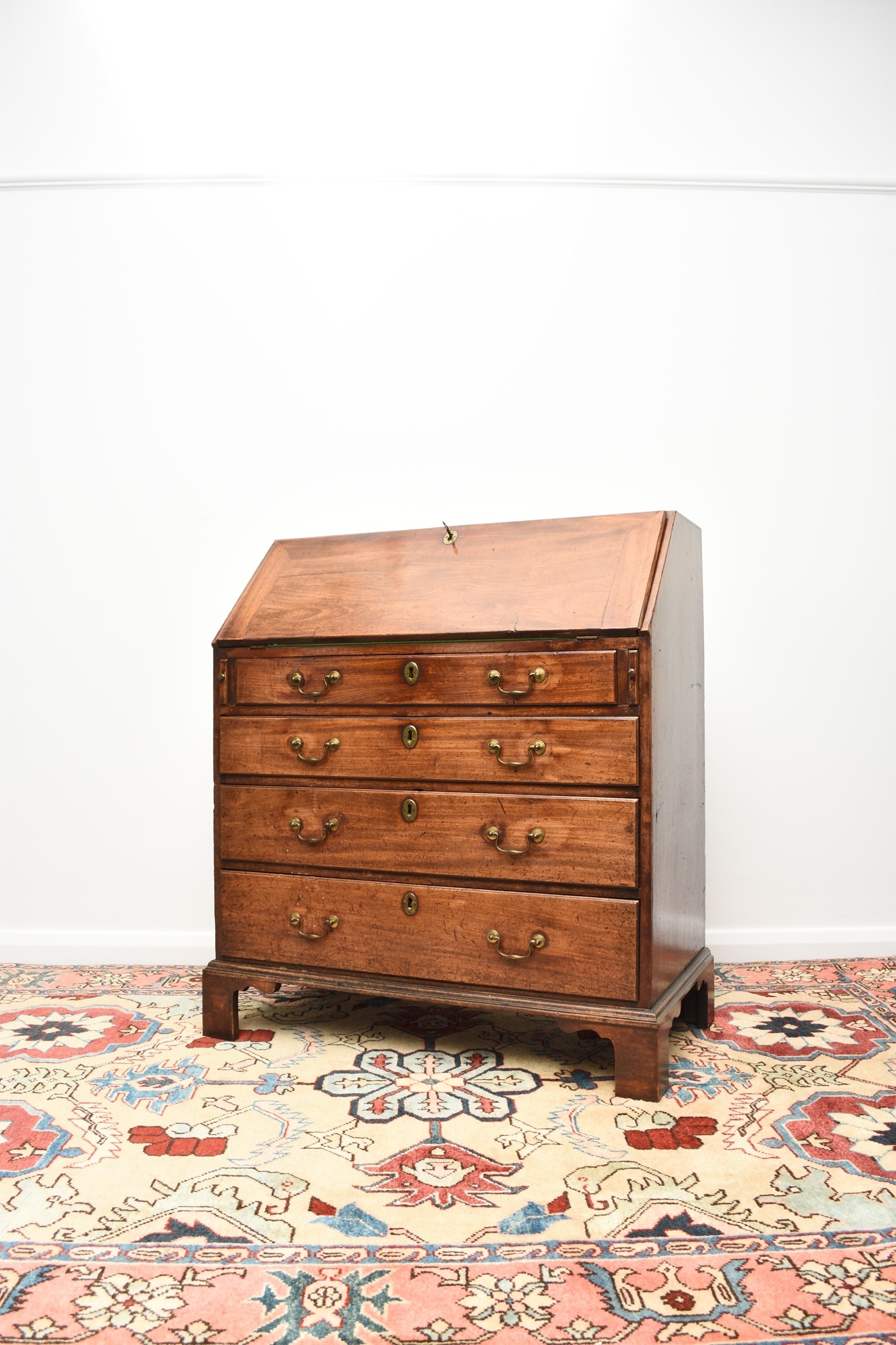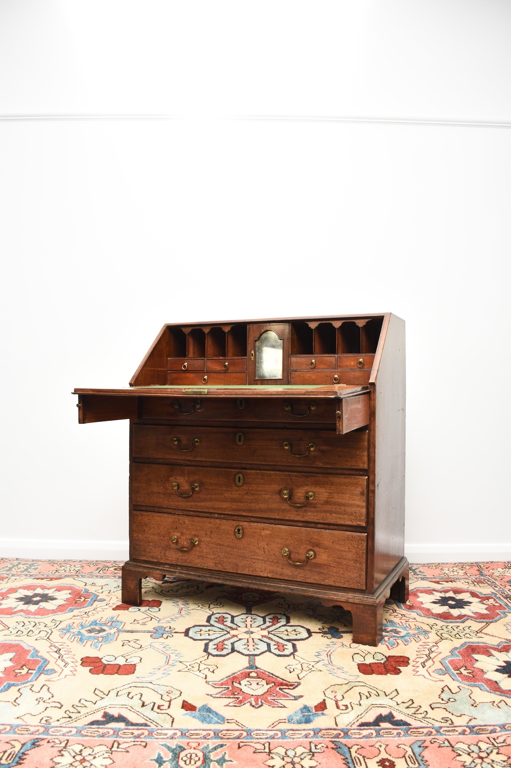 A George III mahogany bureau The cross-banded fall front enclosing a fitted interior with six drawers and eight pigeonholes arranged around a central mirror-fronted cupboard, above four graduated long drawers, raised on bracket feet, with key. 97cm wide x 52cm deep x 107cm high Wirswall Hall, Whitchurch, Shropshire. Condition:Generally good with some cosmetic marks and signs of age and use. Top has some old staining. Left side has a fine split. The fall front is slightly warped. The interior is good with a later replaced baize skiver. No evidence of worm.