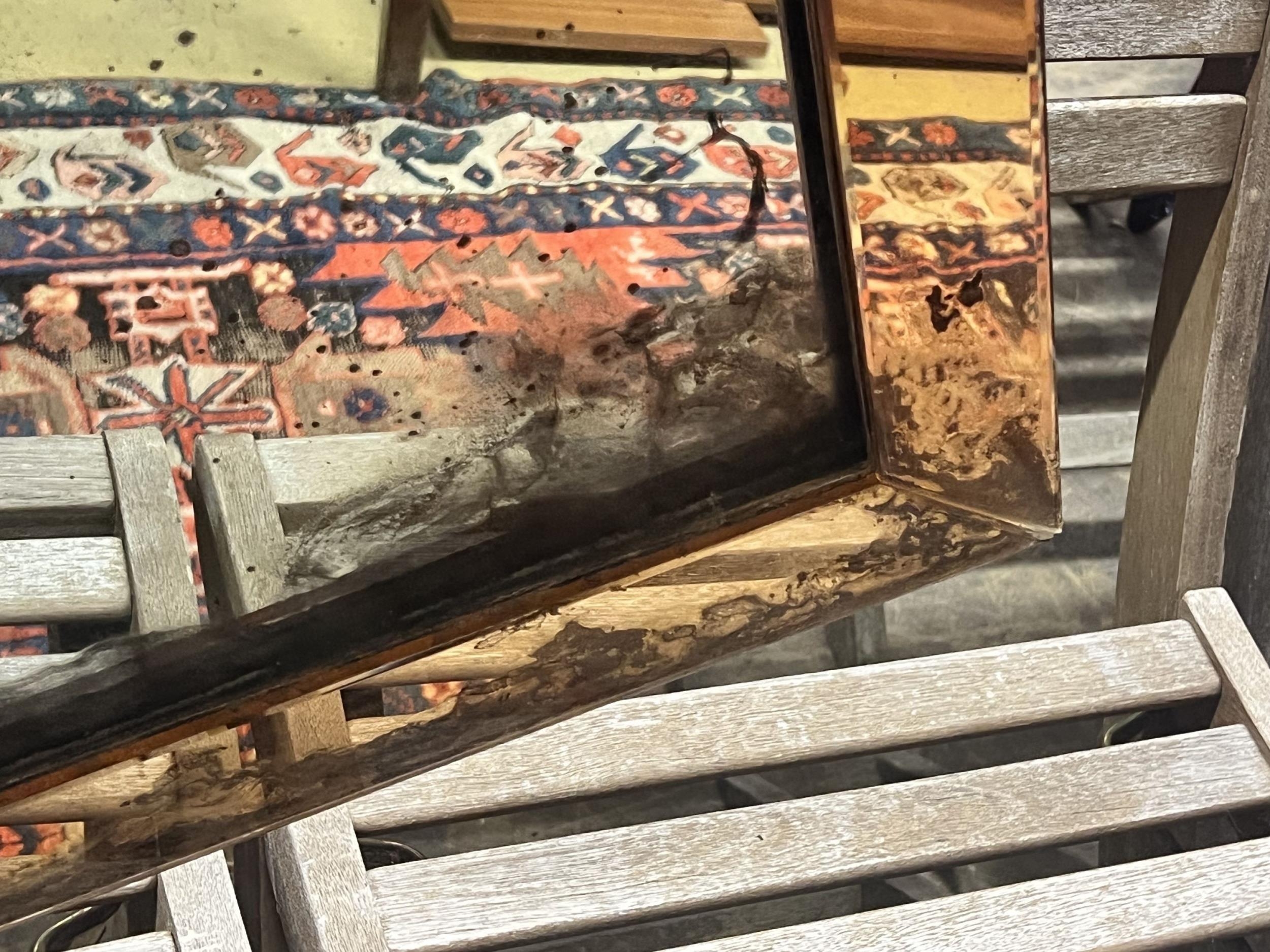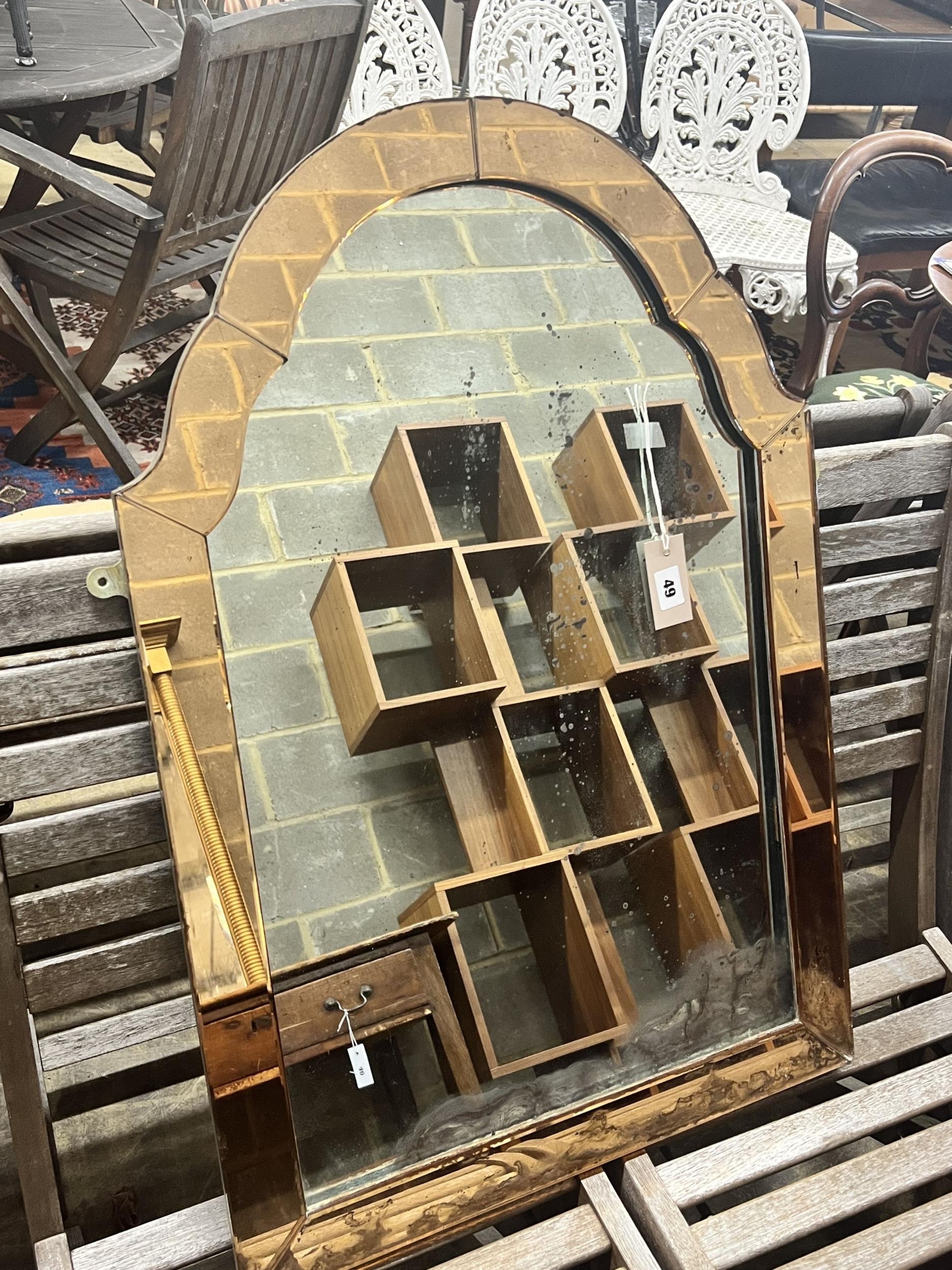 An Art Deco style peach and clear glass wall mirror, width 55cm height 80cm