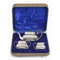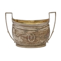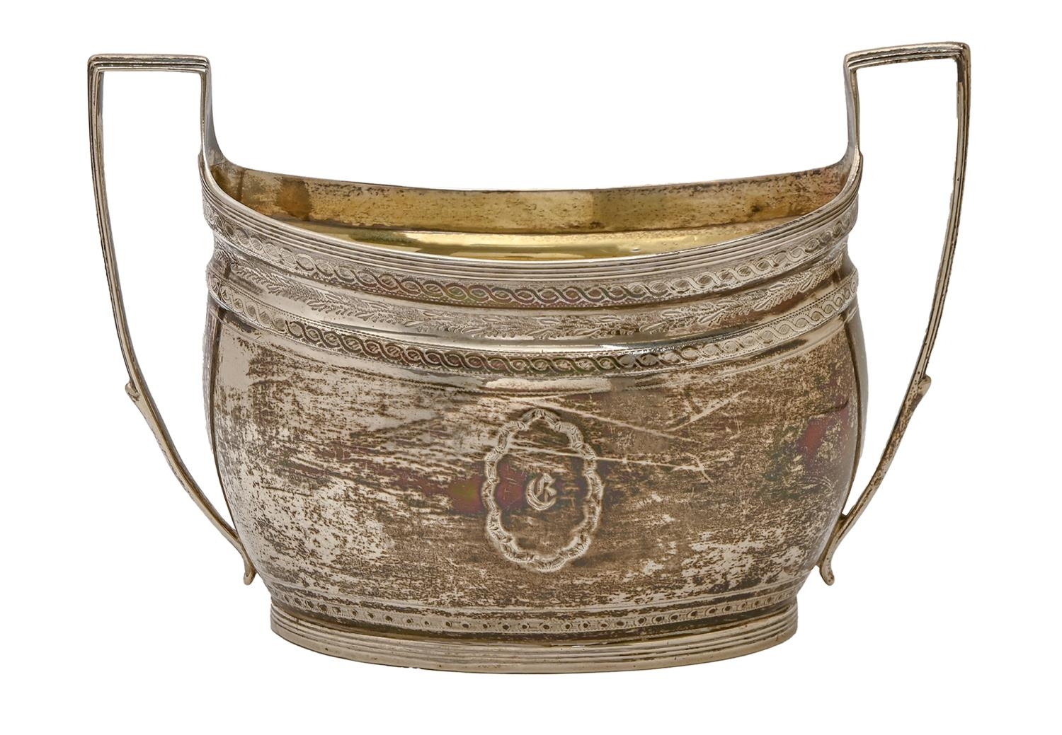 A George III silver sugar bowl, with reeded rim and engraved with guilloche and beading, reeded angular handles, engraved with initial C, 17cm over handles, by Thomas Wallis, London 1800, 7oz 5dwt