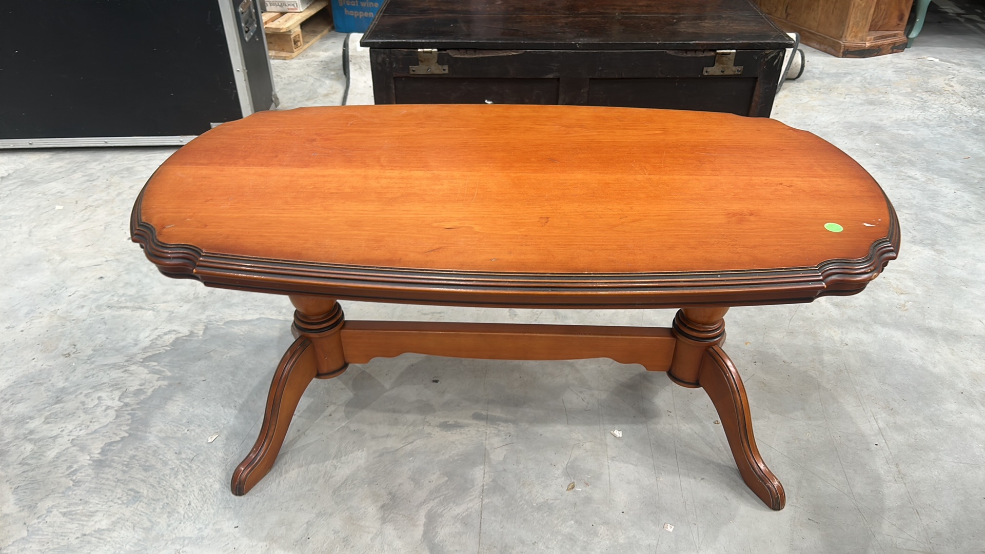 Oval timber coffee table with serpentine-moulded edge top, twin turned column supports united by stretcher, terminating in splayed tripod feet.