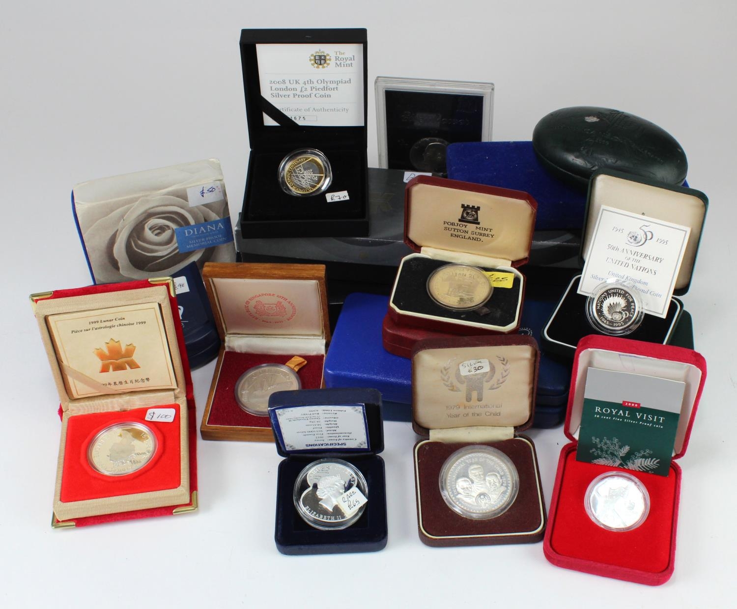 Selection of mainly world Silver Proof / BU boxed issues. A good selection with better types seen includes GB Two Pounds, Crowns etc. Needs viewing