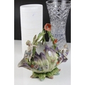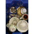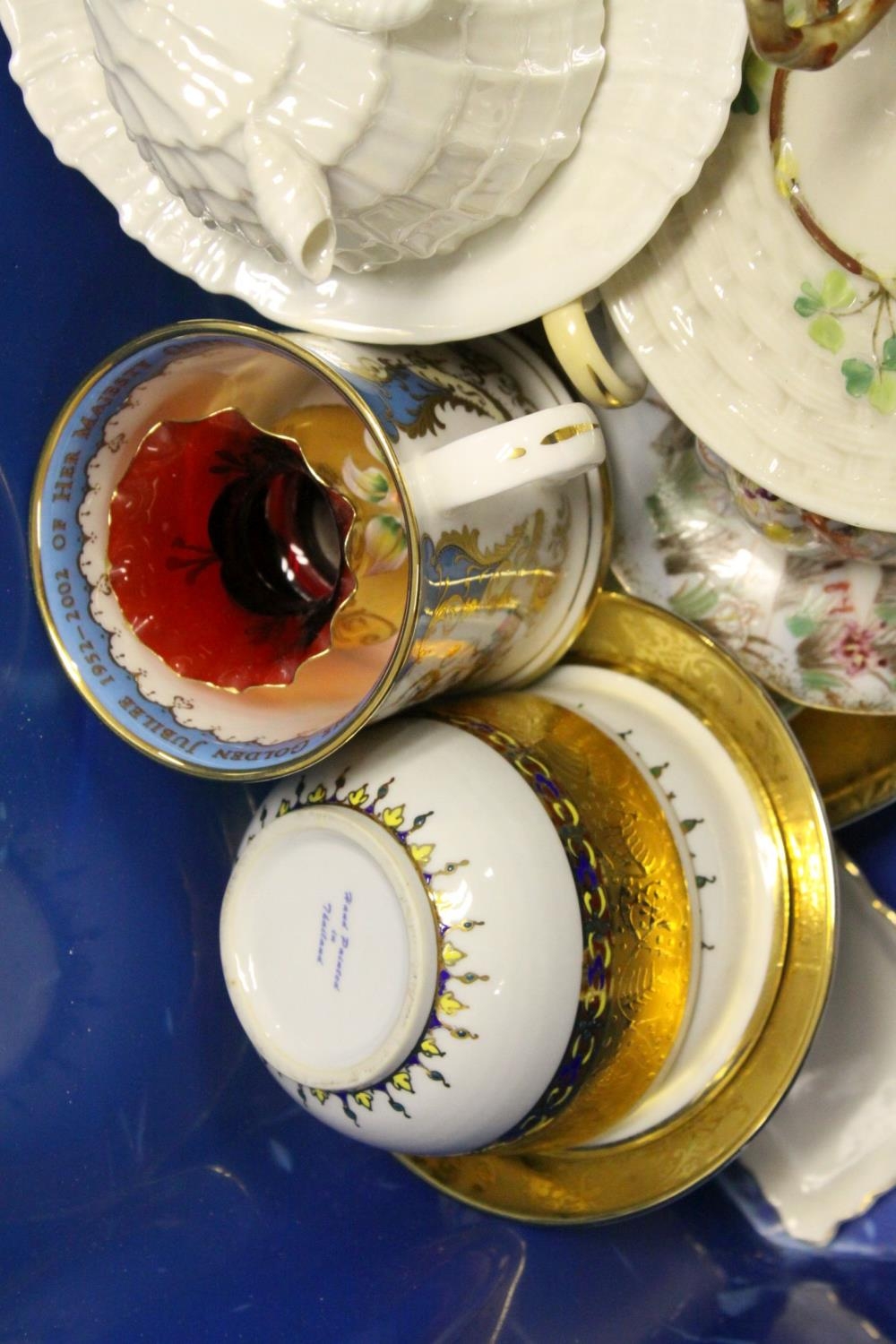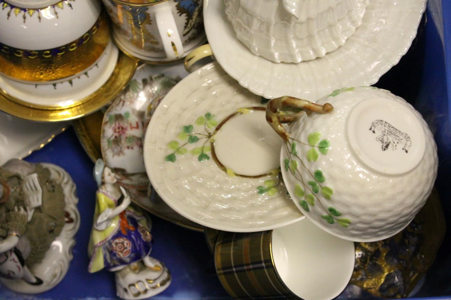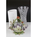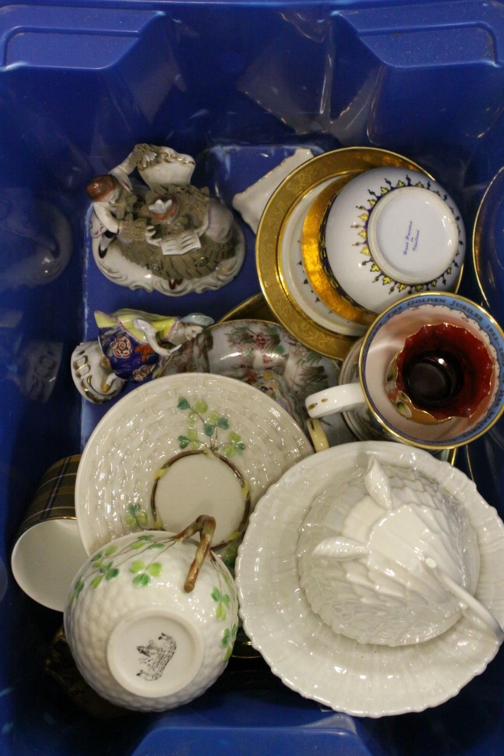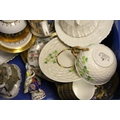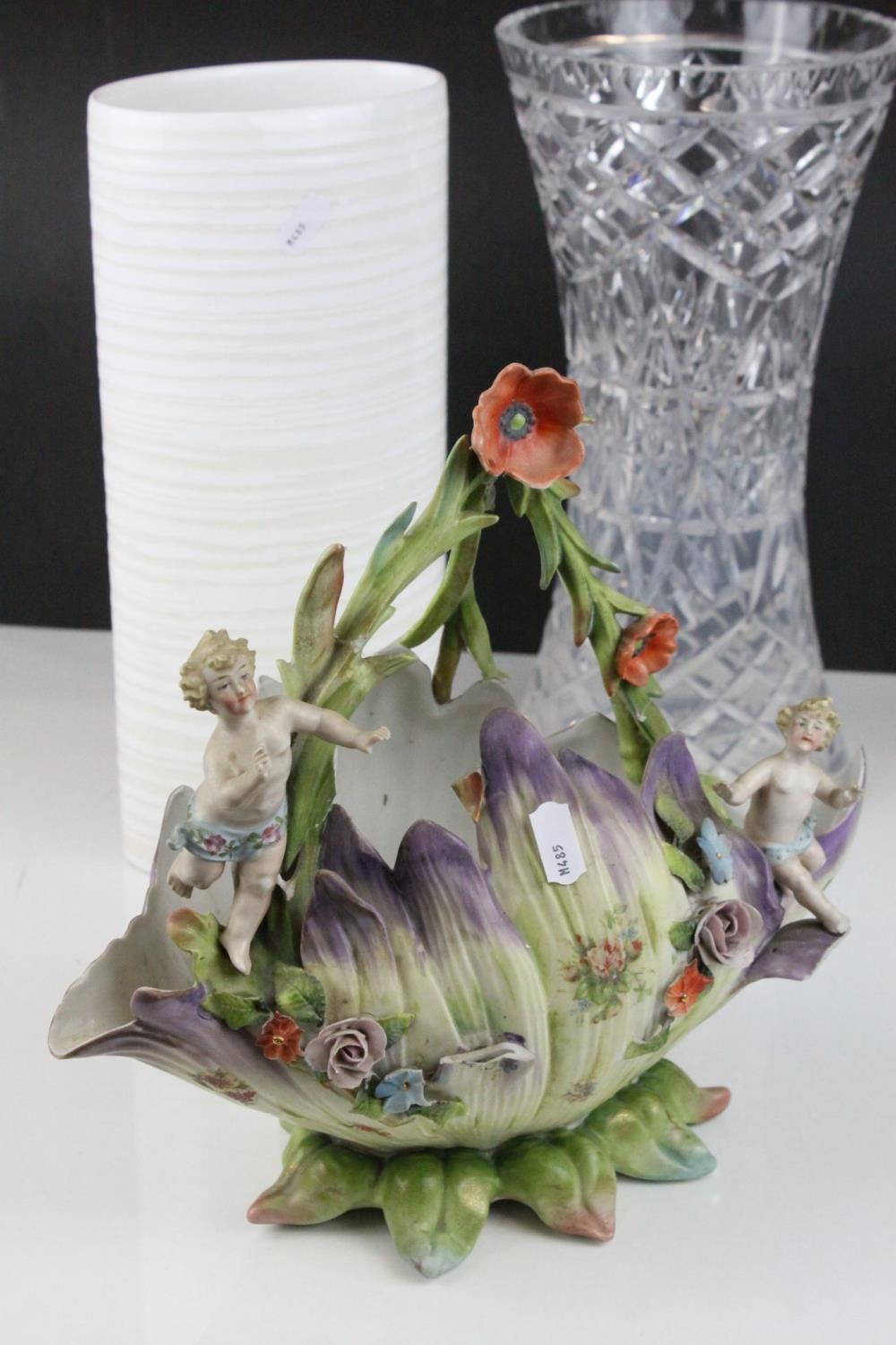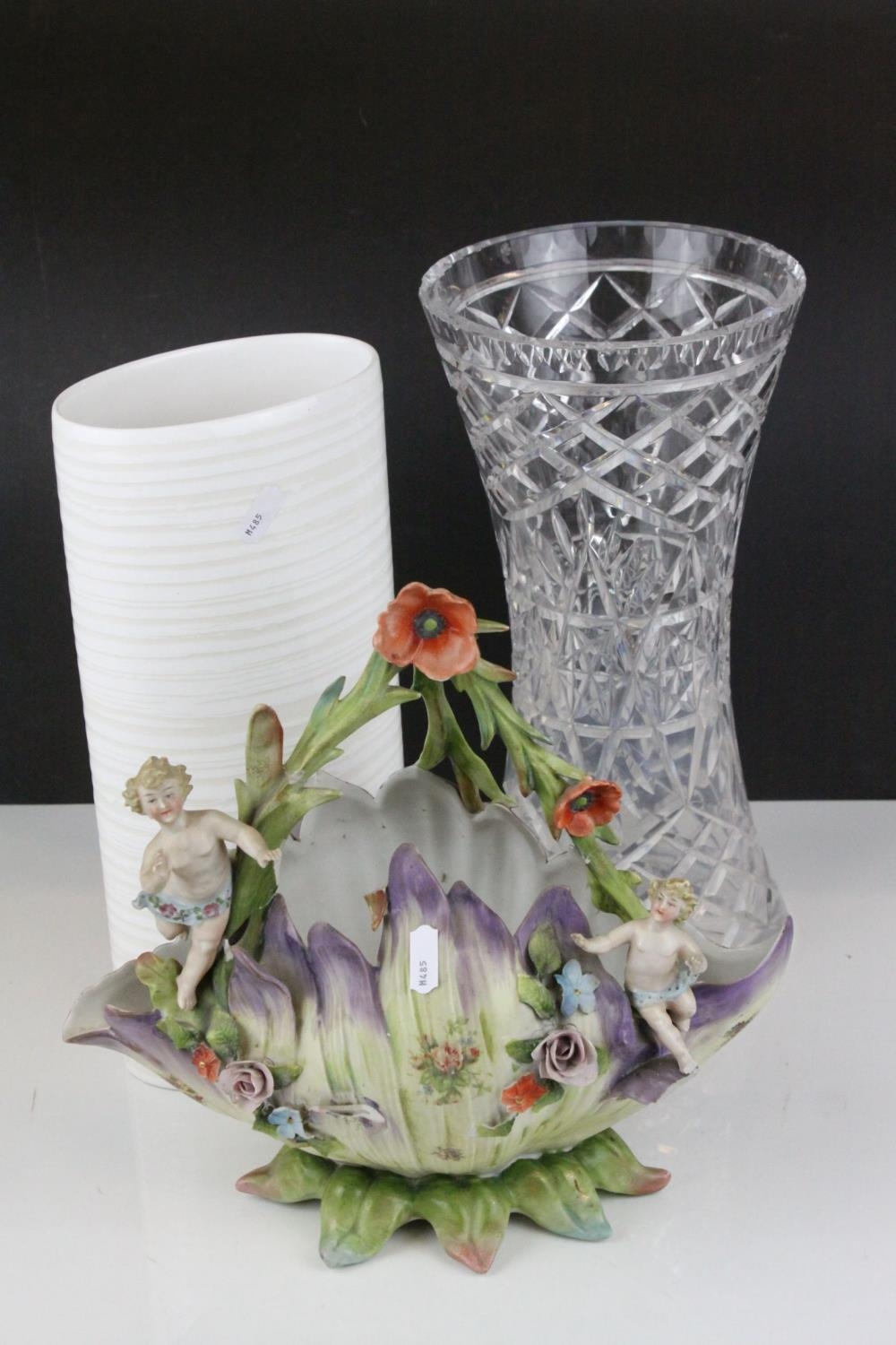 Mixed Lot of Ceramics and Glassware including Belleek Cabinet Cup and Saucer, other Cabinet Cups and Saucers, Cherub and Floral Encrusted Bowl, Large Cut Glass Vase, etc