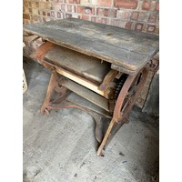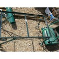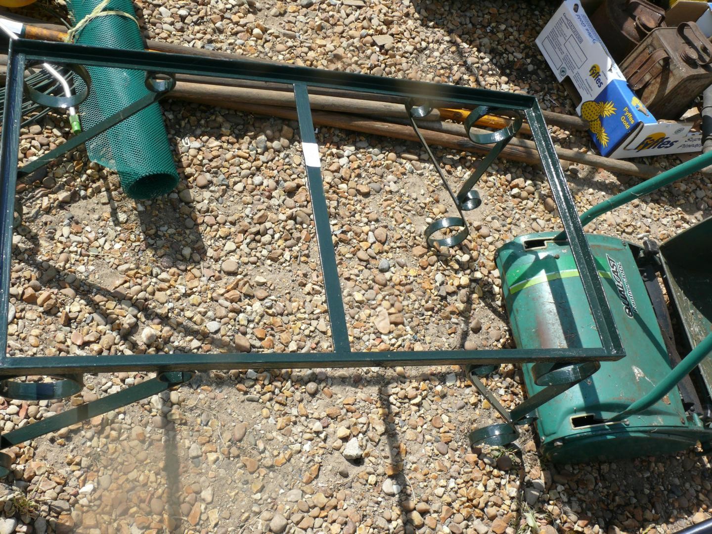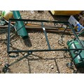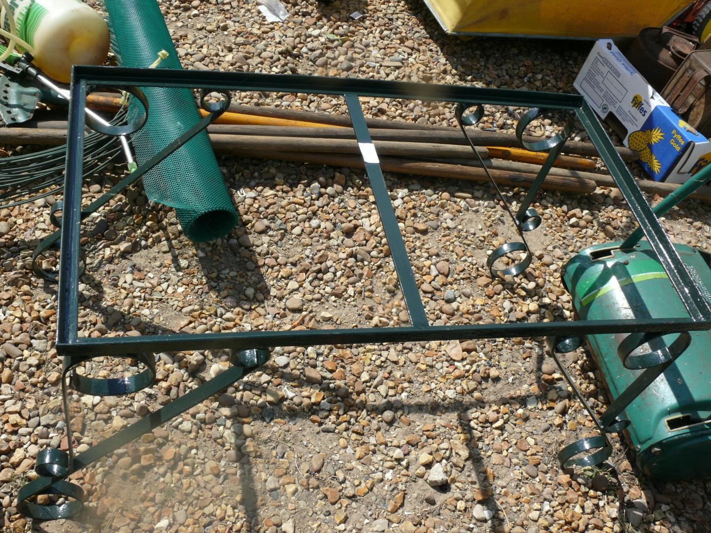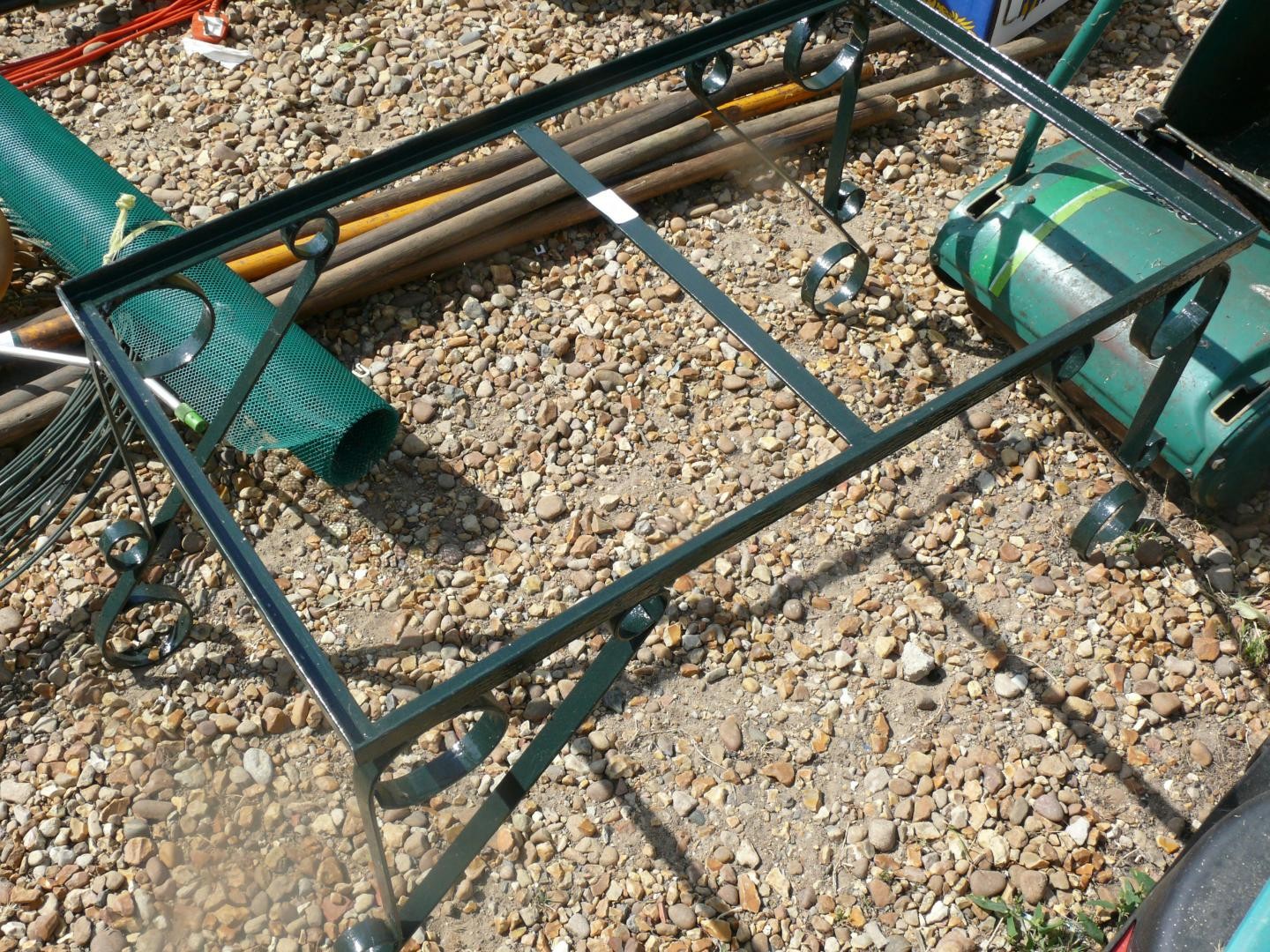 Wrought iron green painted table base for garden or indoors. Appears new & needs a wood or glass top