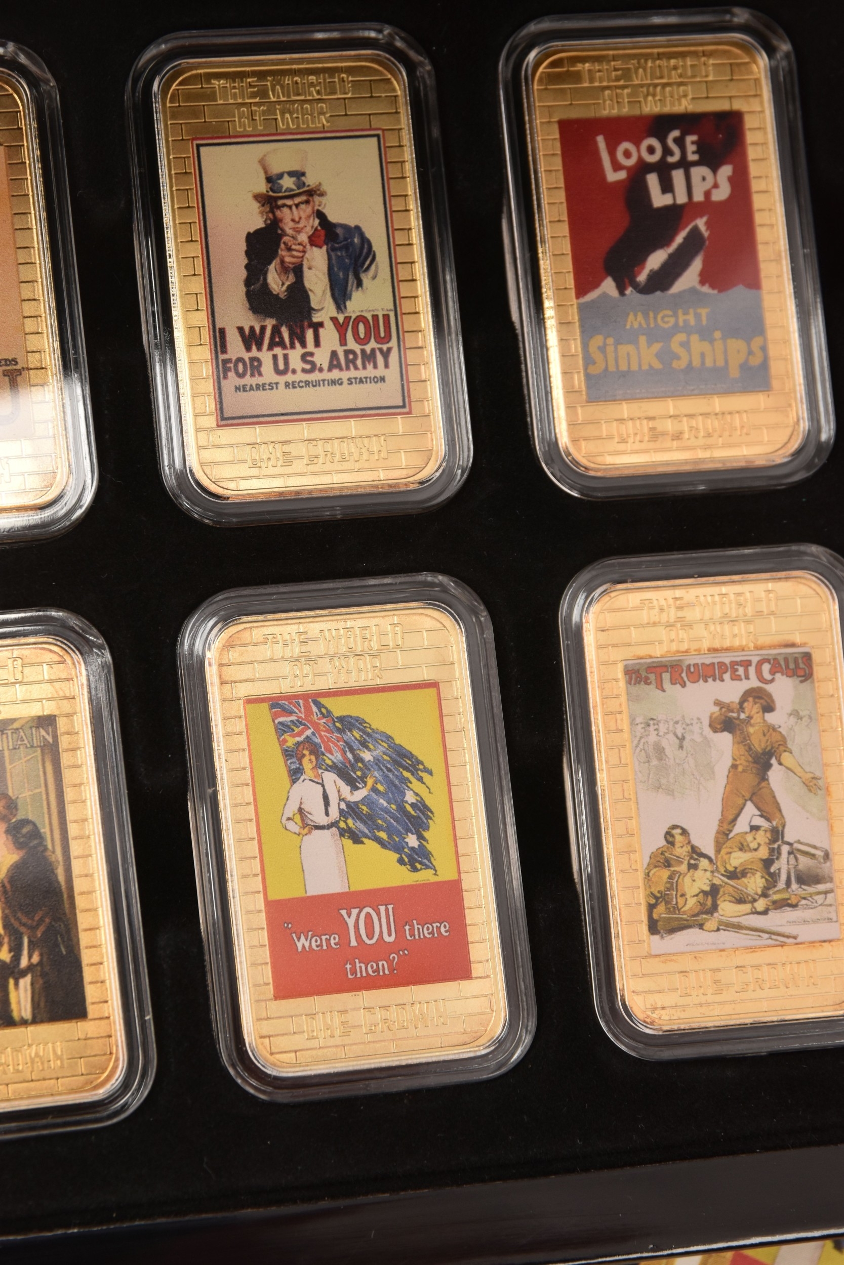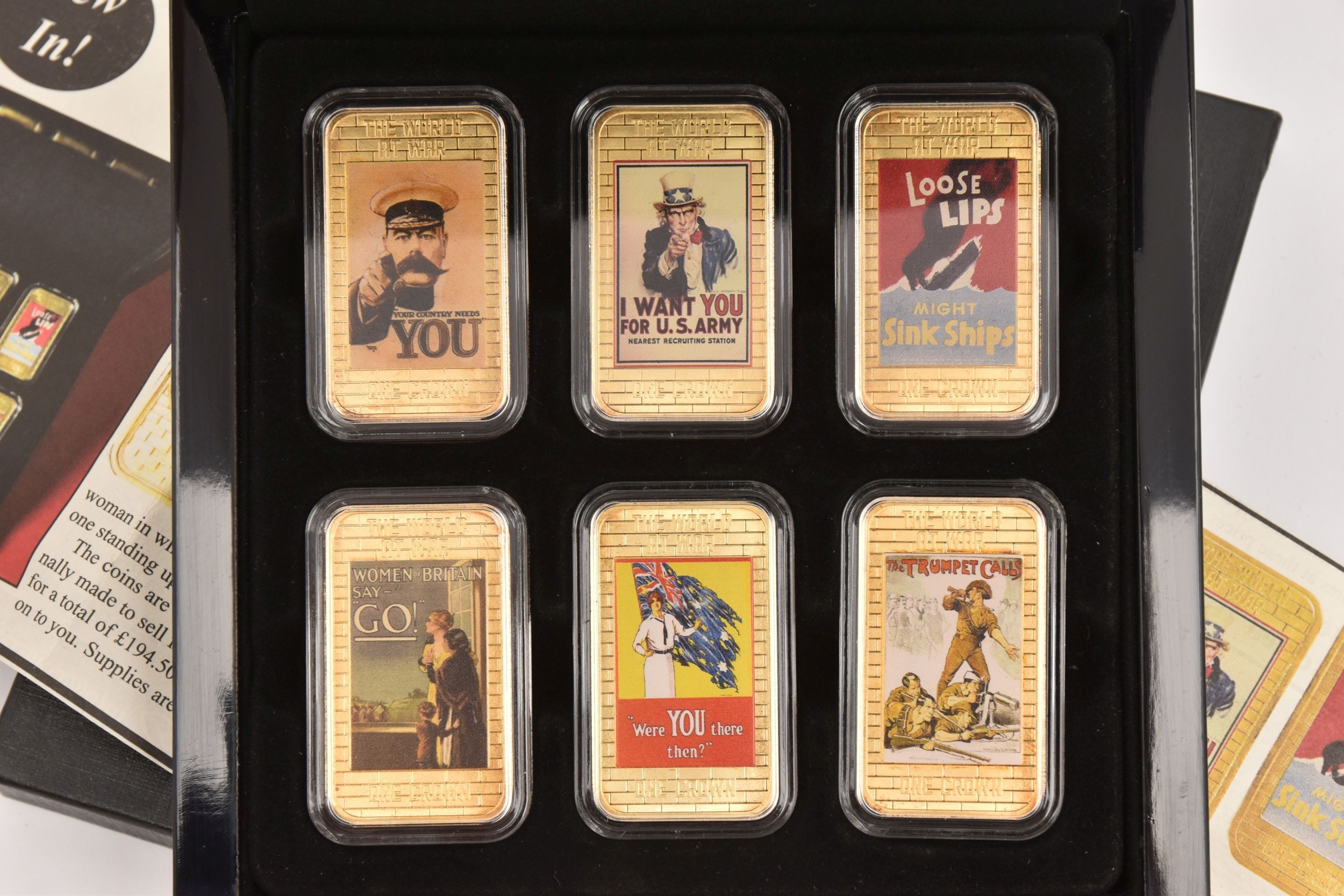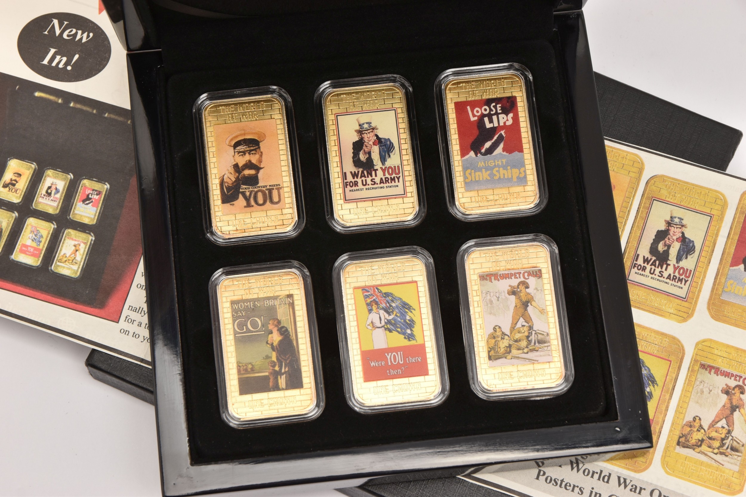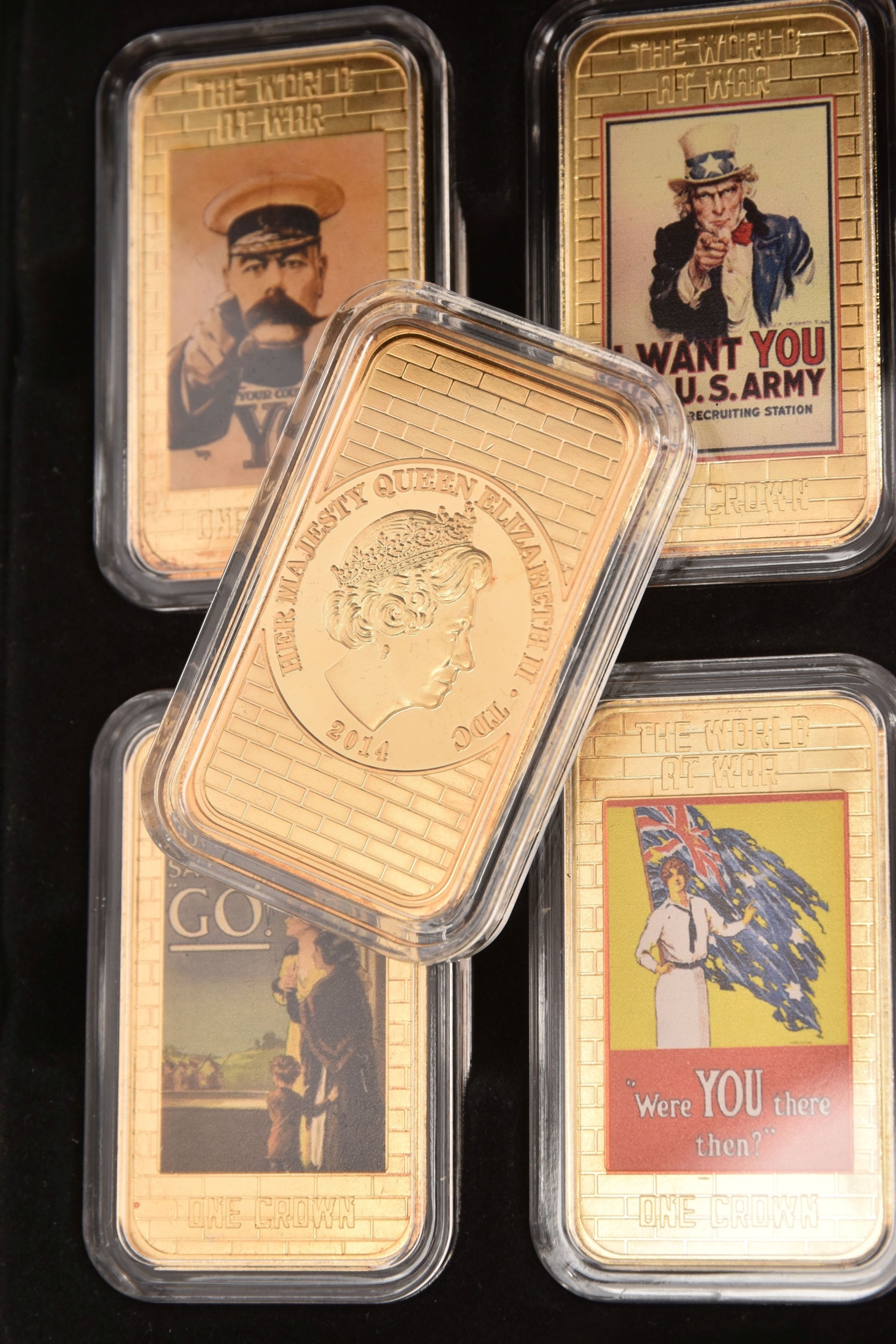 WORLS WAR 1 POSTER COINS IN CASE SET, this consists of six ingots from 2014 valued at one crown, the obverse has a portrait of Elizabeth II, the reverses have colour renditions of WW1 recruitment posters, these are gold plated and are complete with original fitted box in mint condition.