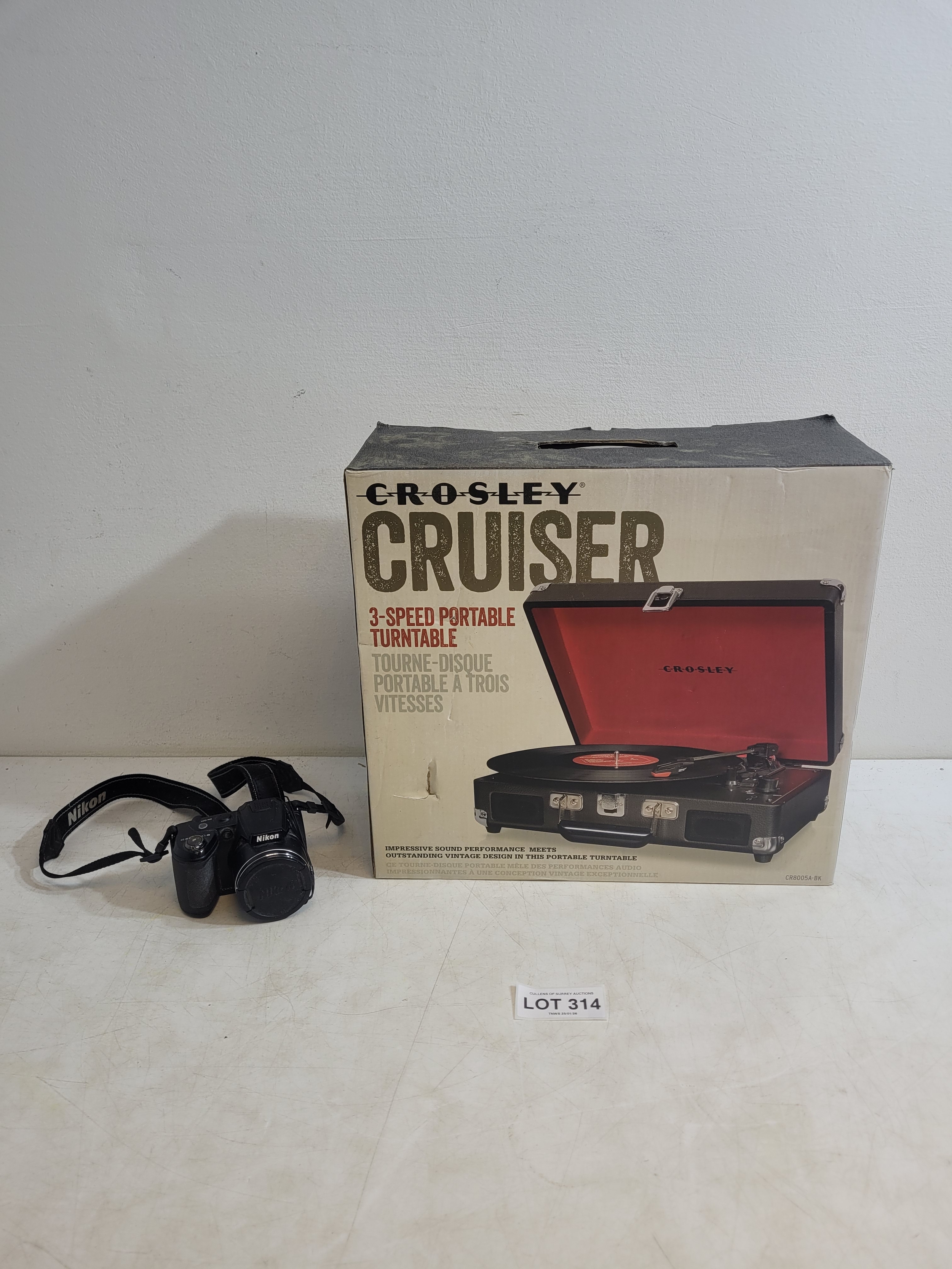New in box Crosley cruiser 3 speed portable turntable and a Nikon Coolpix L310 camera