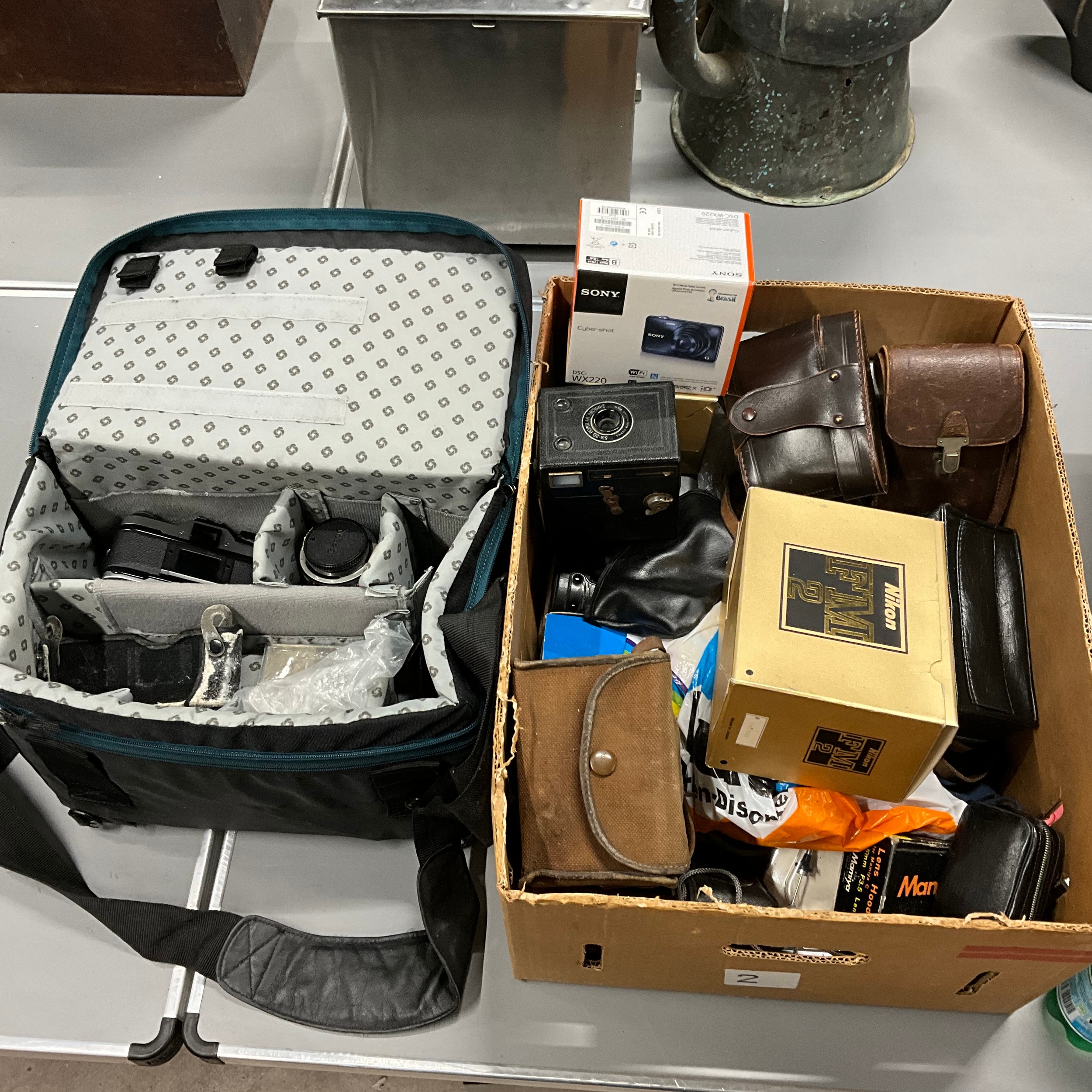Collection of various cameras to include GB-Kershaw 630, Six-20 Popular Brownie, Nikon, Cannon and others plus camera bag.