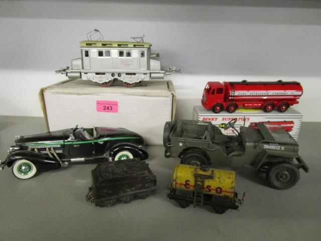 A selection of diecast model vehicles and other toys to include a boxed Atlas edition Dinky Supertoys Leyland Esso Octopus Tanker model number 943, a Series Hornby tram car, a Franklin Mint 1935 Auburn Boattail Speedster