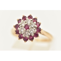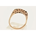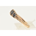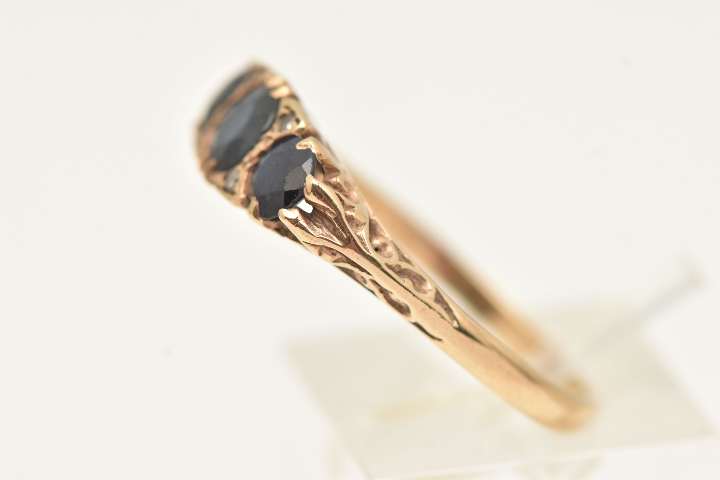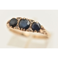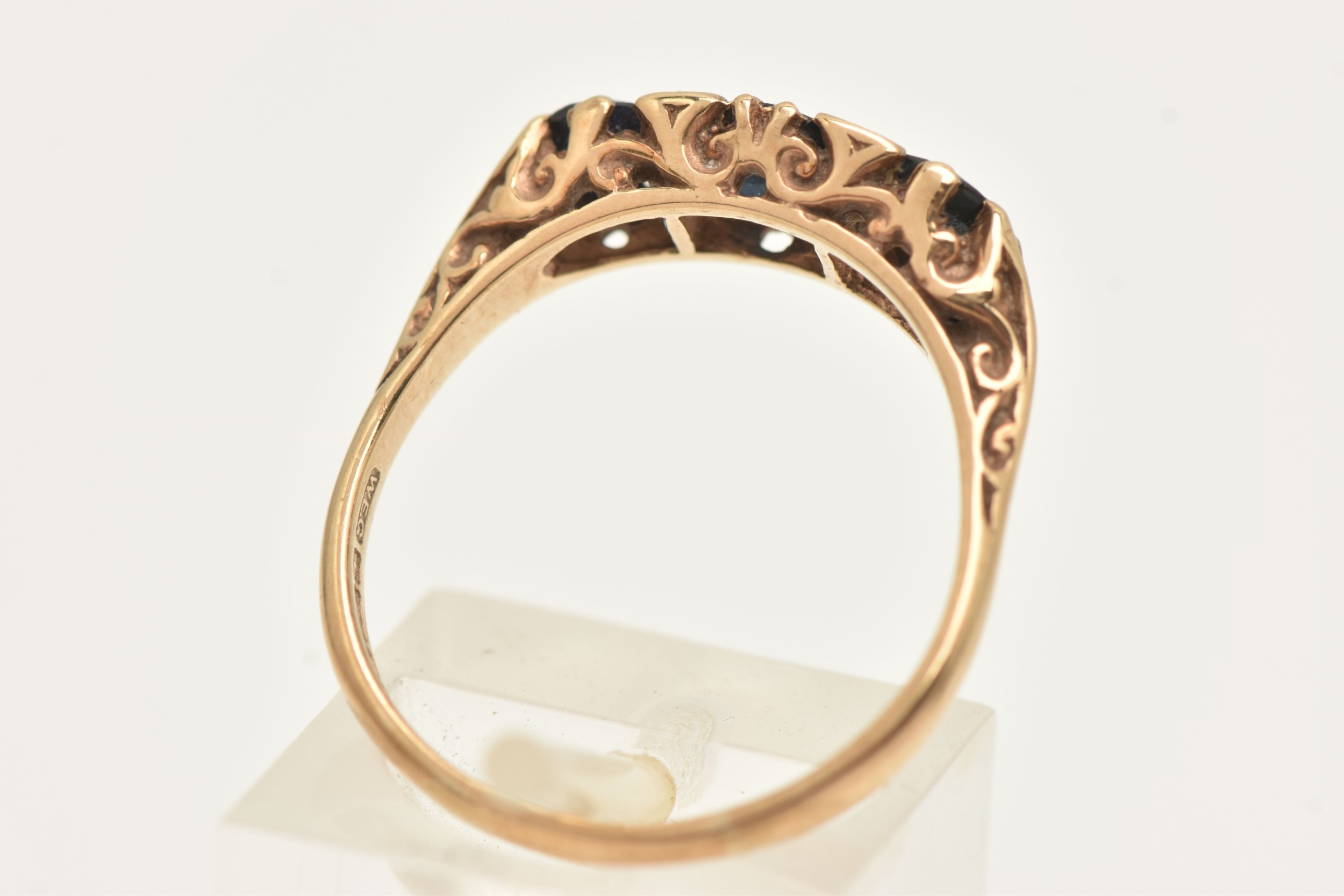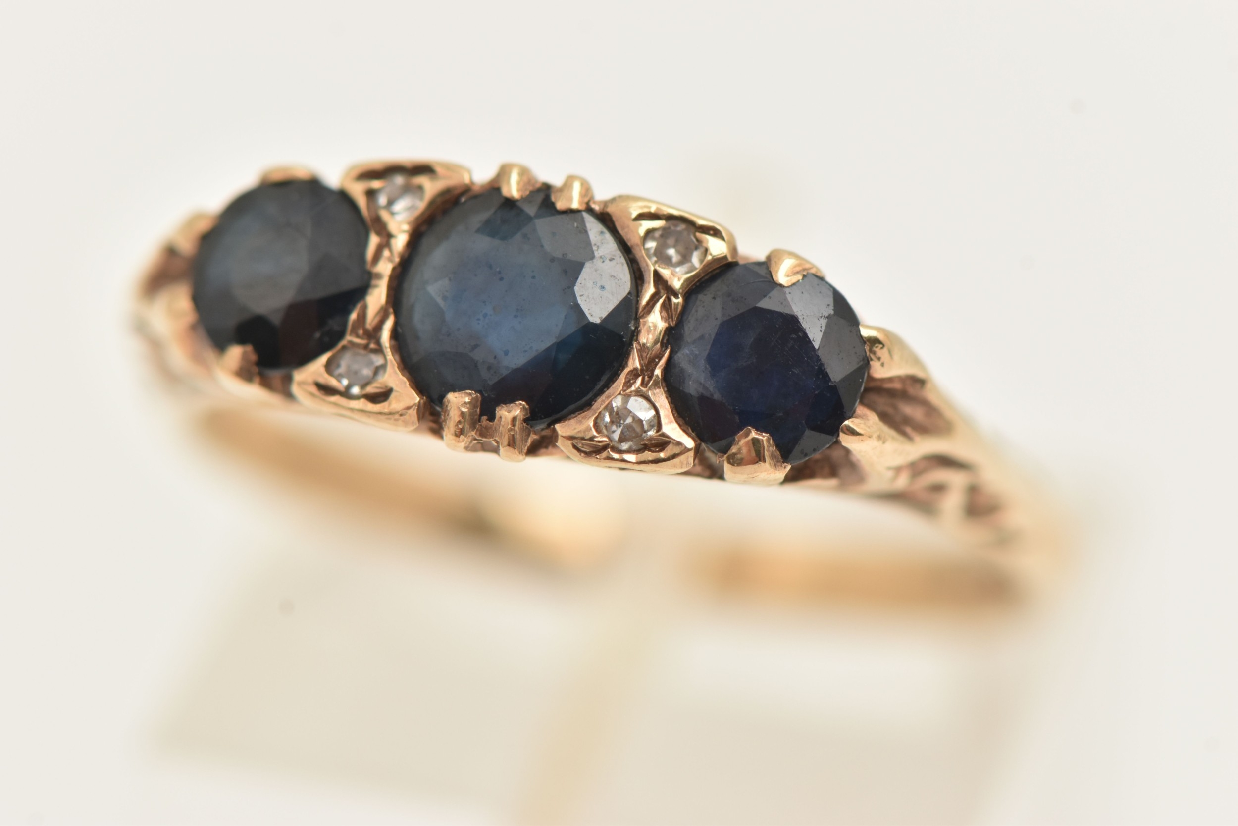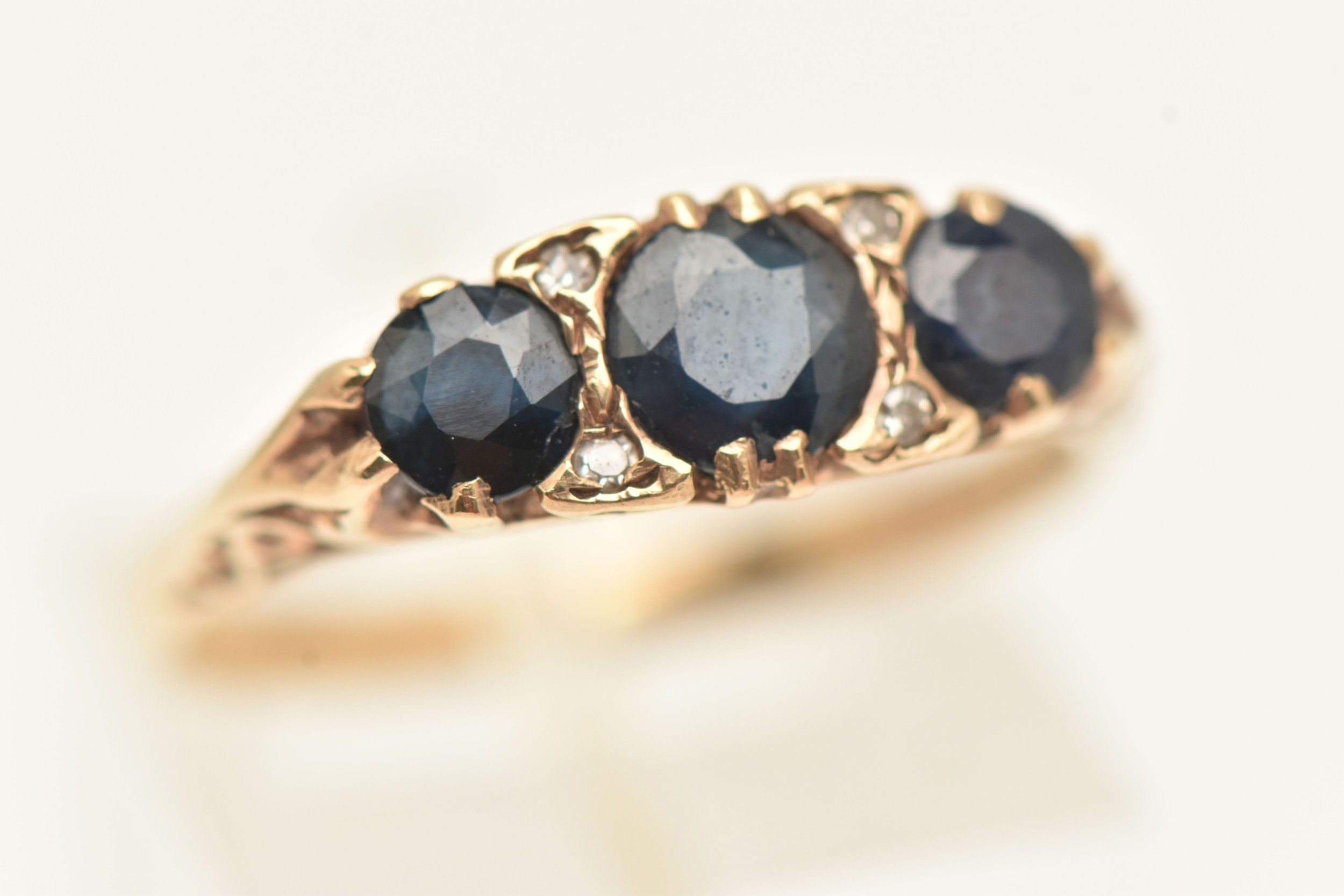 A 9CT GOLD SAPPHIRE AND DIAMOND RING, set with three circular cut blue sapphires interspaced with four small single cut diamonds, scrolling gallery and polished band, hallmarked 9ct Birmingham, ring size Q, approximate gross weight 3.0 grams (condition report: general light wear, stones secure)