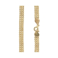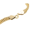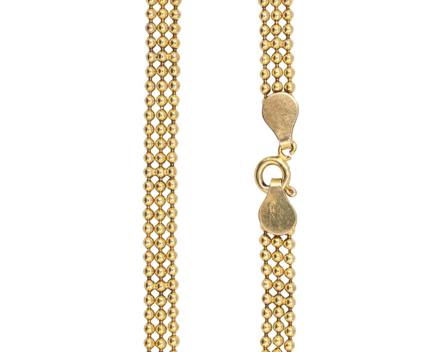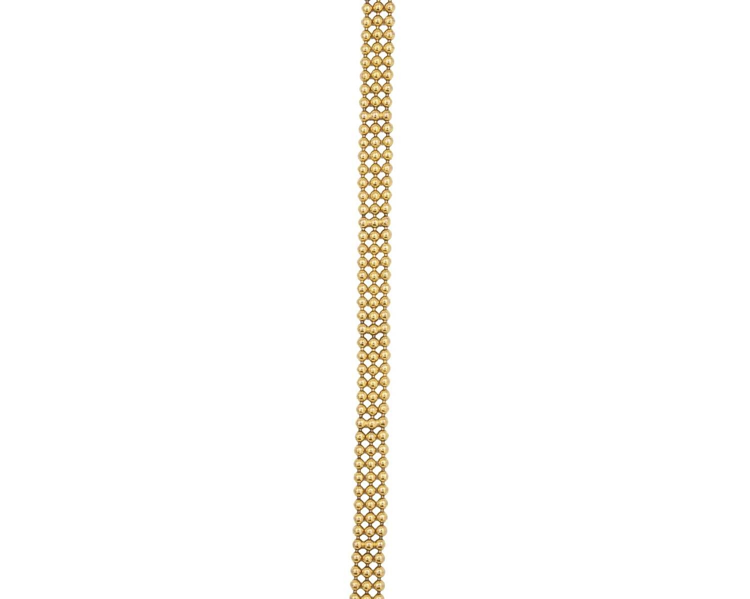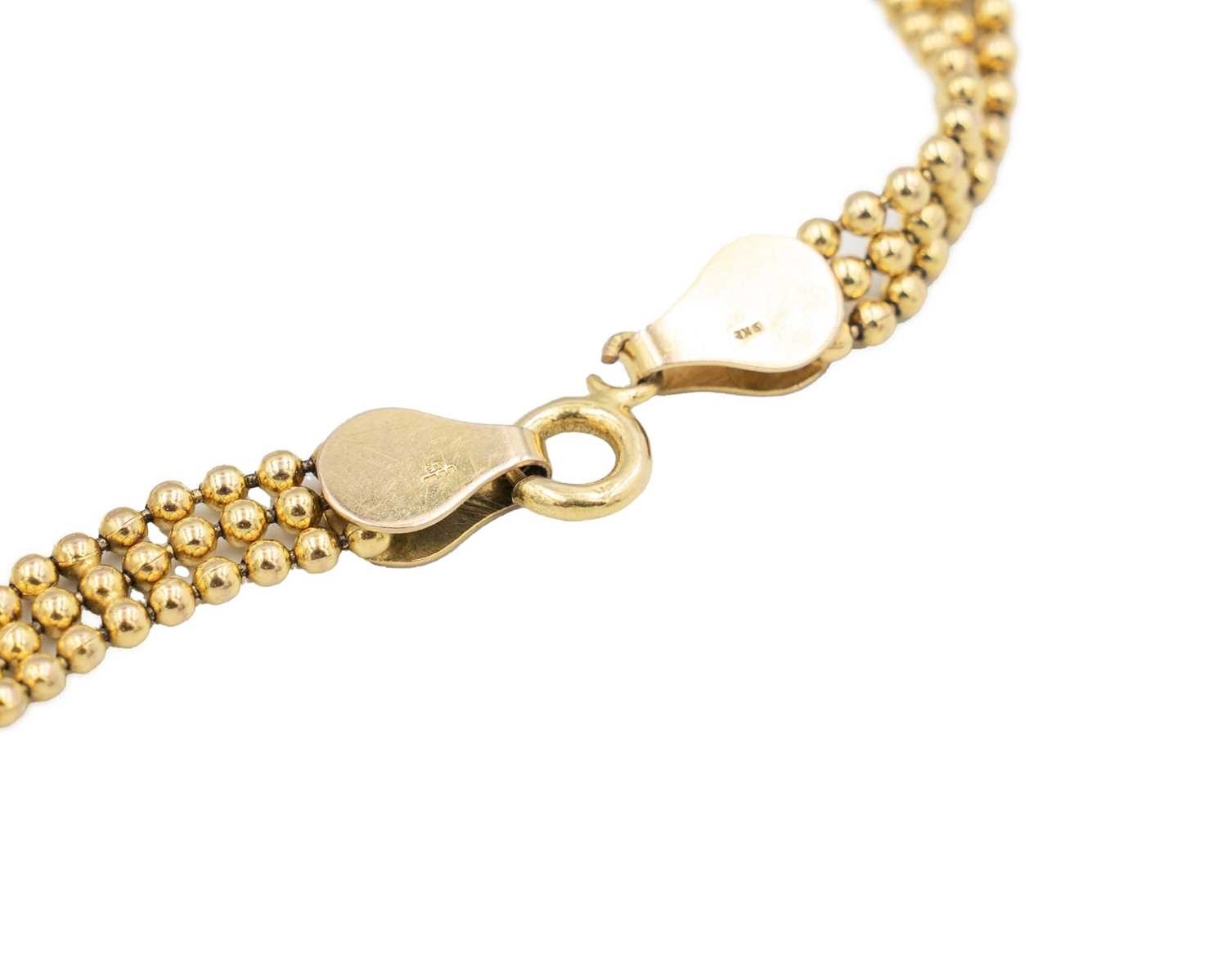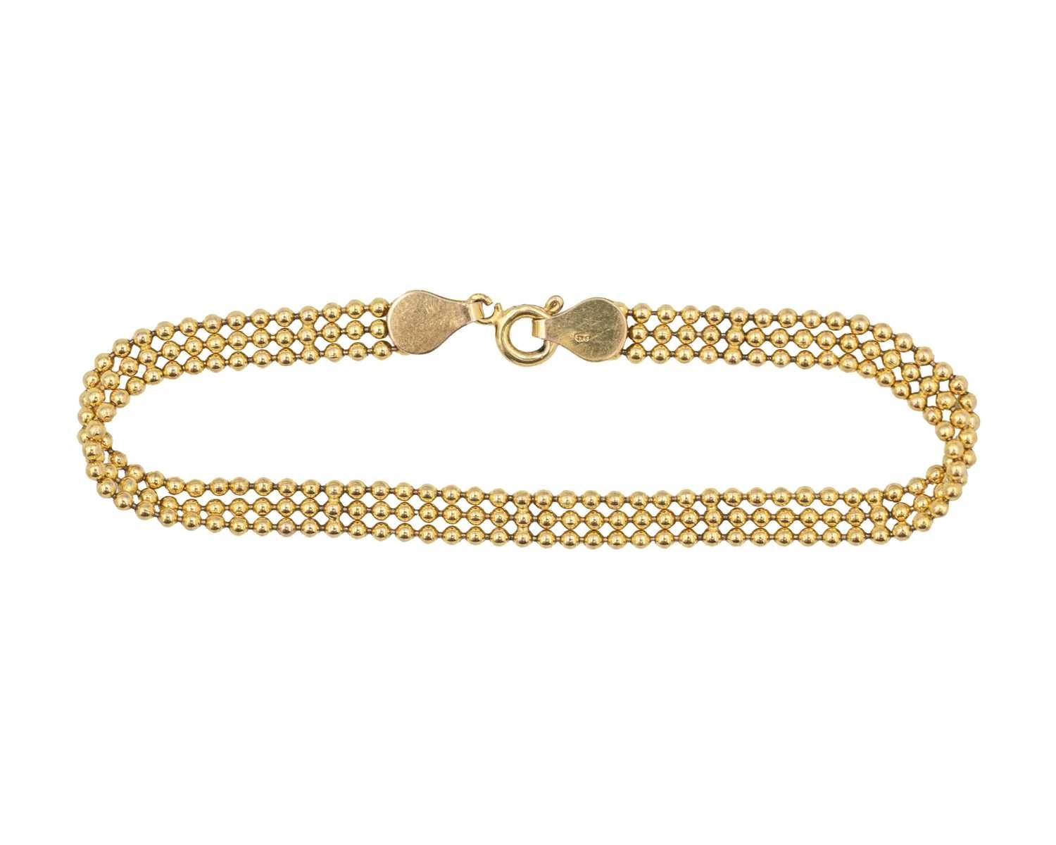 A 9k gold three-row bead link bracelet. Fitted with a spring clasp, the width is 5.6mm, the length 7", stamped 9k, weight is 6.70g.