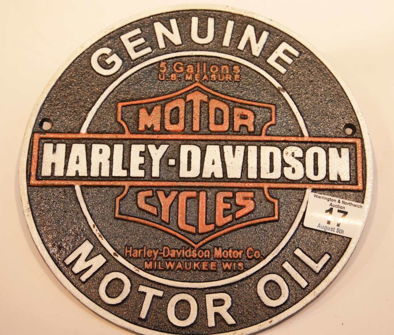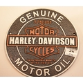 Cast iron Harley Davidson Motor Oil sign, D: 24 cm. P&P Group 2 (£18+VAT for the first lot and £2+VAT for subsequent lots)
