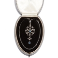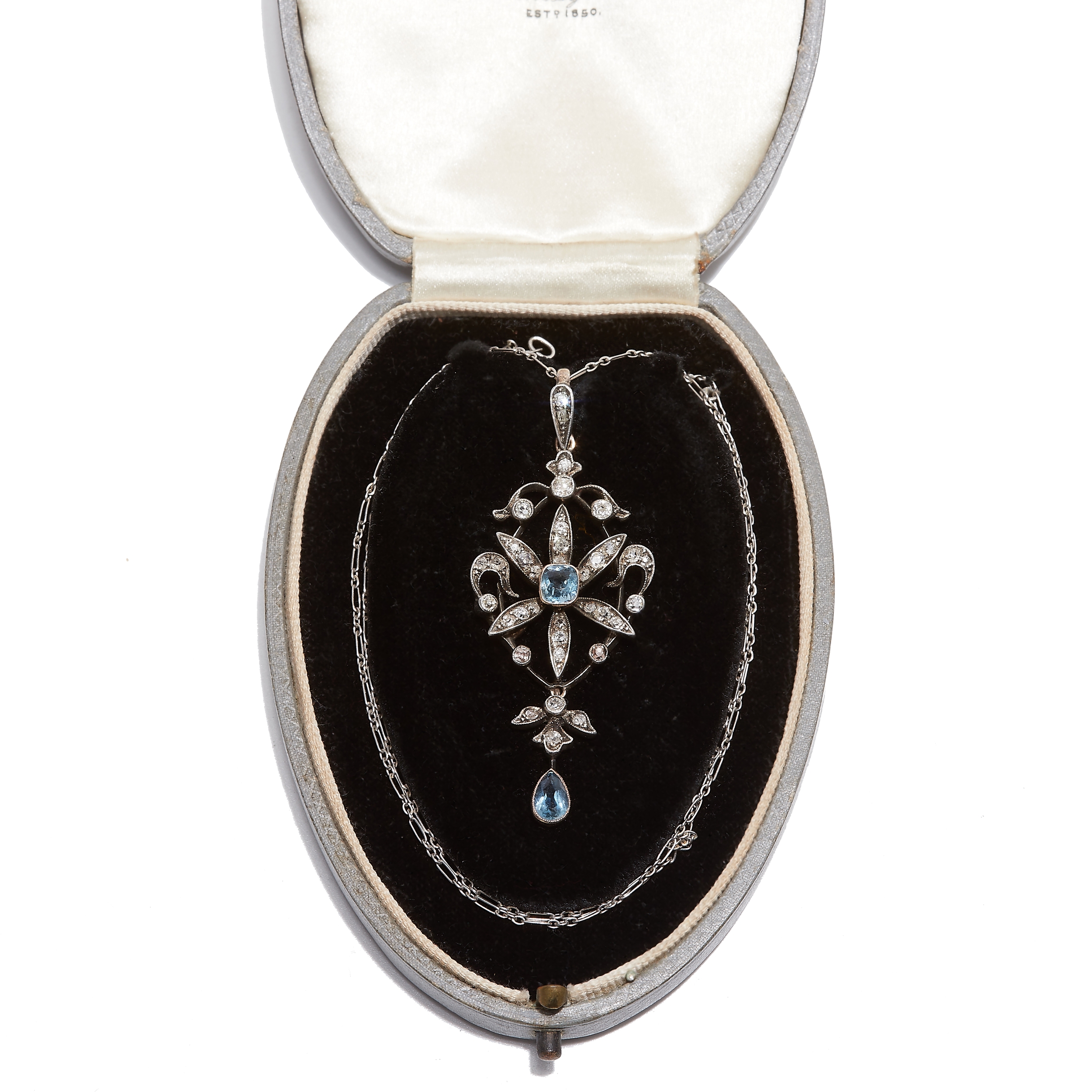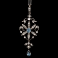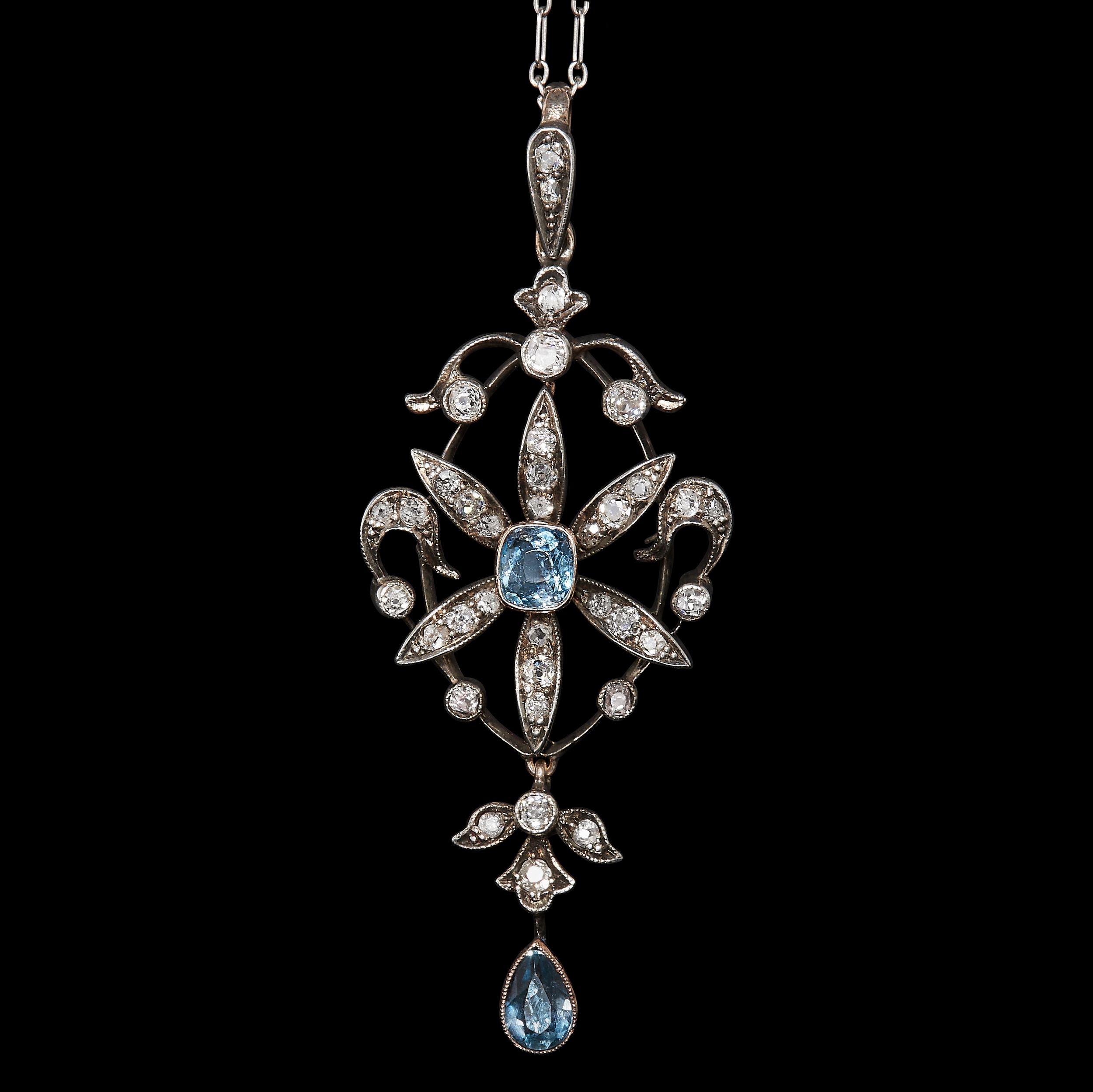 EDWARDIAN SCROLL PENDANT WITH AQUAMARINE AND DIAMOND. set with with a aquamarine in the center surrounded by diamonds. with a aquamarine and diamond drop. diamonds totalling approx. 0.74 ct. L 5.4 cm. W 2.2 cm. 6.5 grams.