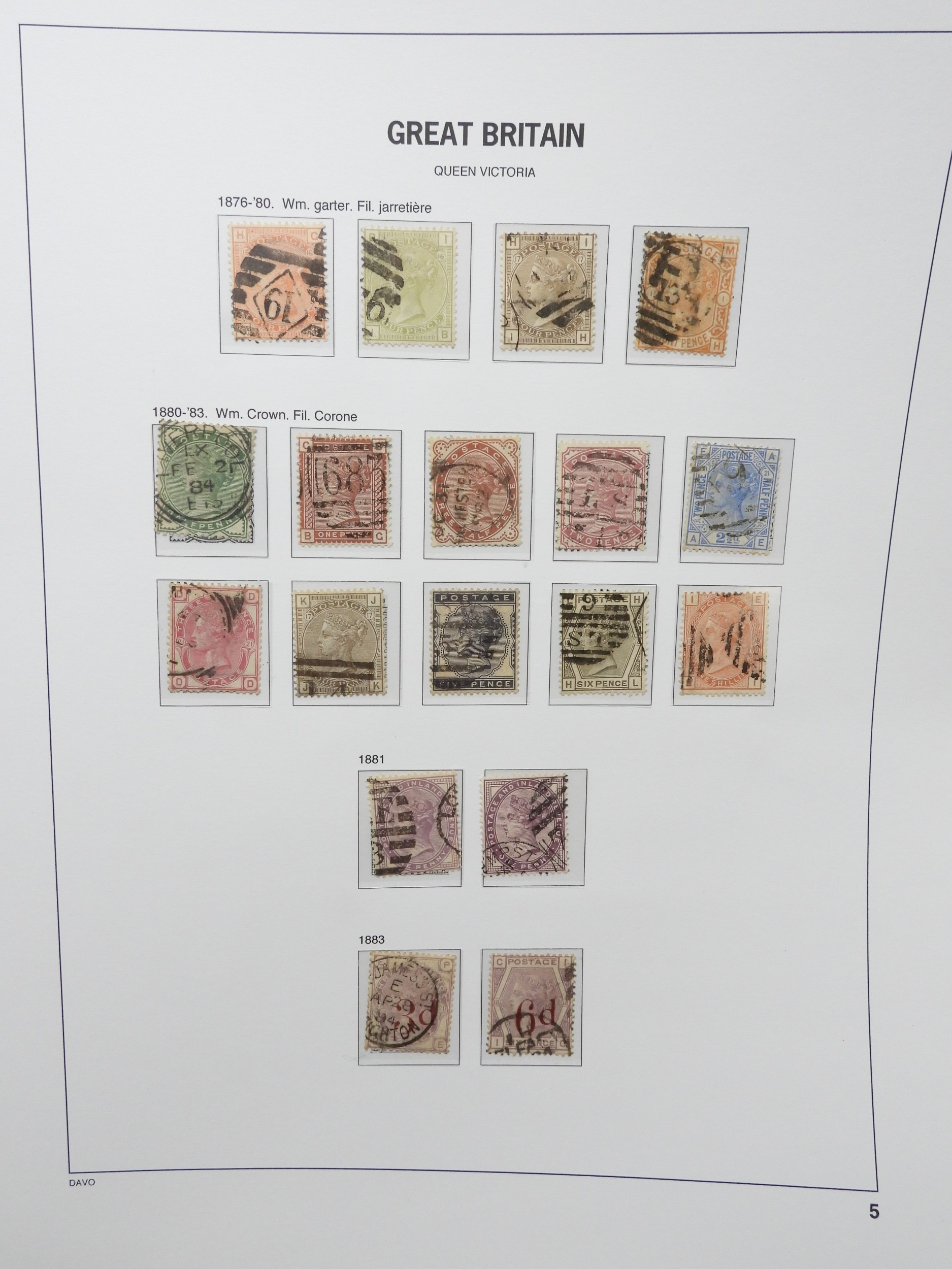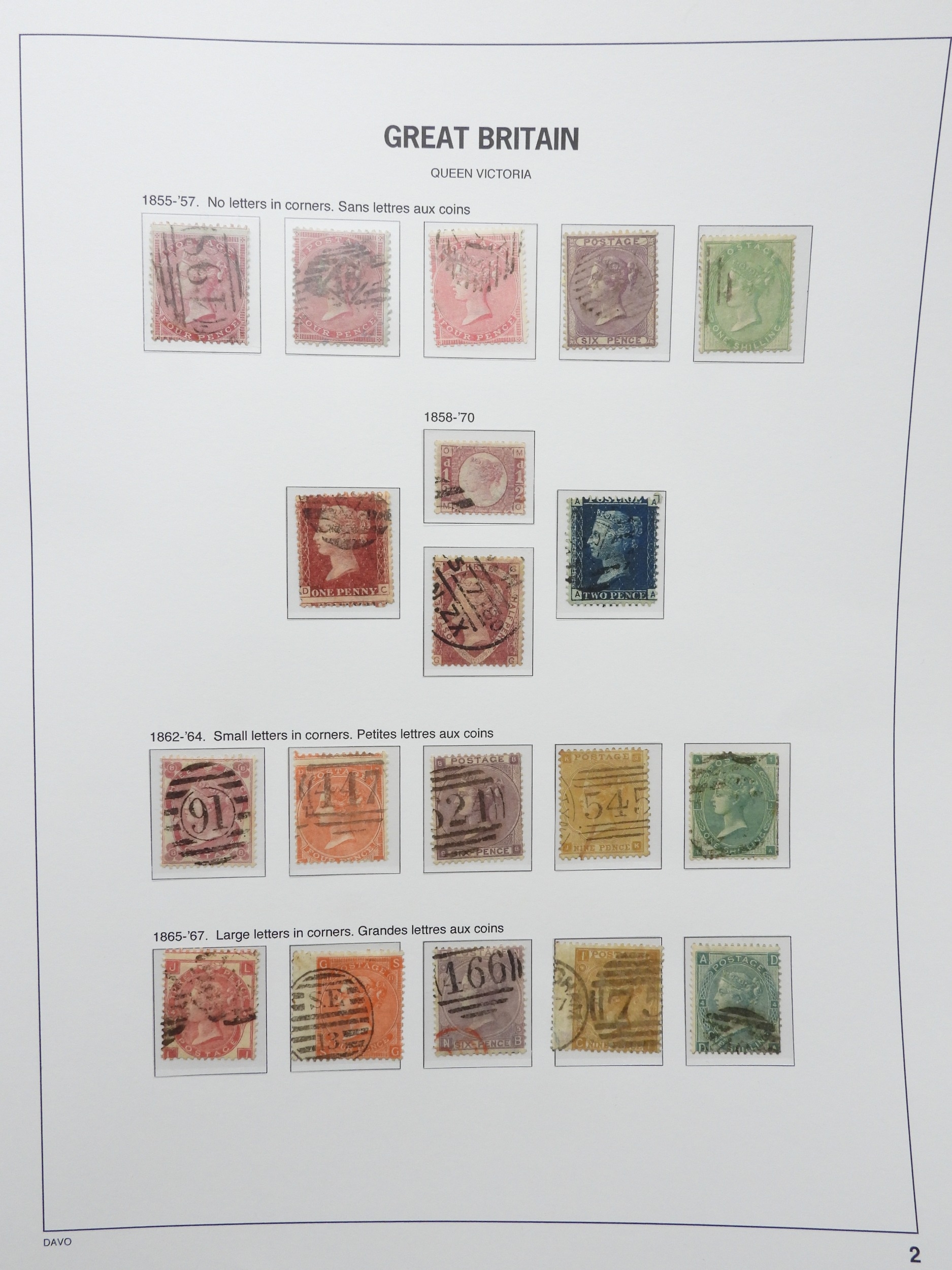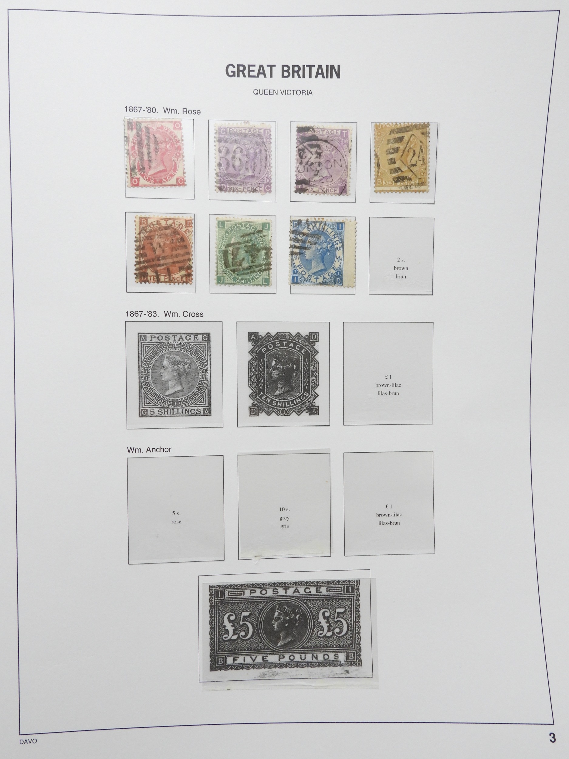 Great Britain Collection of Victorian Line Engraved and Surface printed used stamps from 1841 to1900 on simplified David pages. These have spaces for all stamps by watermark and perforation, but not by shades, paper types or different plate numbers. Included are SG 62, 63 and 66, then, 1857, 1862 and 1865 basic sets. 1867 set to 2/- blue, NO 2/- Brown, then complete up to SG 172, finally the 1897 and 1900 sets all used many CDS used. No values above 2/-. A very good lot with an extremely high cat value.