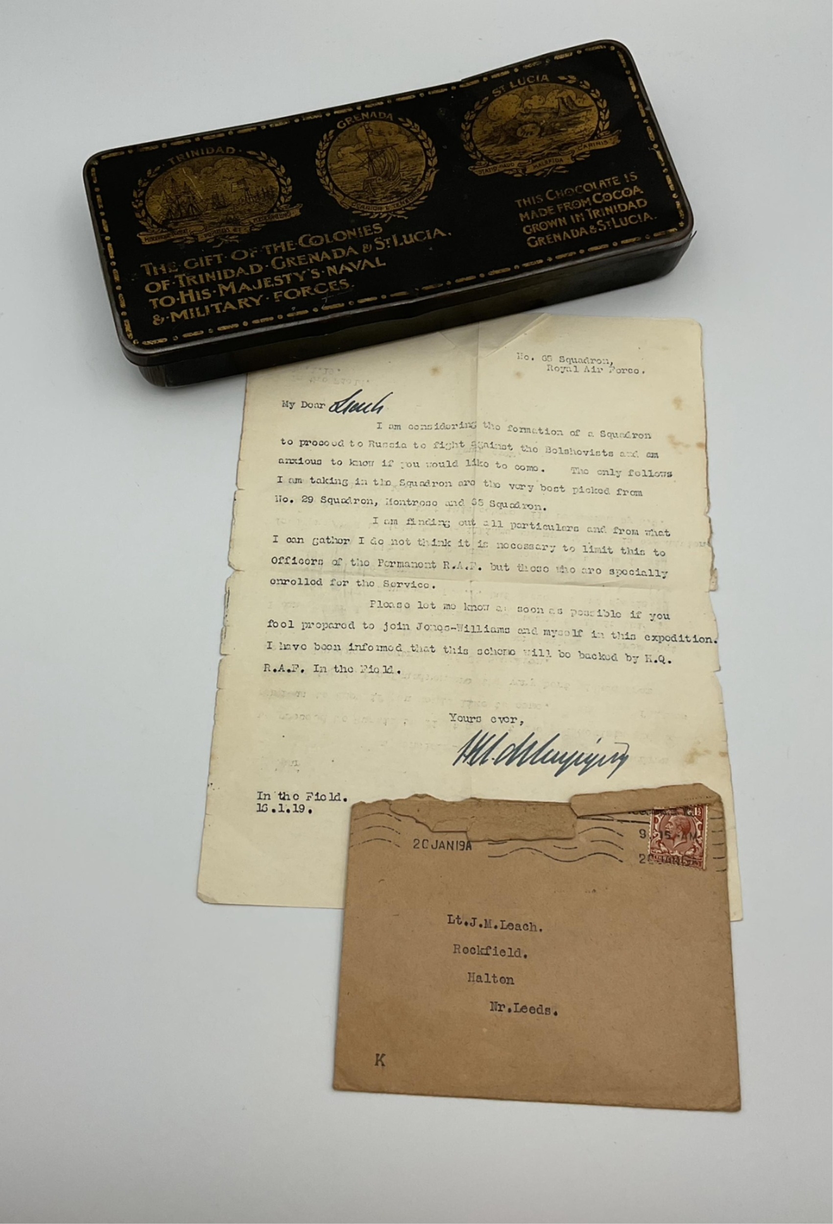 A WWI First World War Gift of the Colonies chocolate tin from Trinidad, Grenada and St. Lucia, to His Majesty's Naval and Military Forces. The lid of the tin has three vignettes within wreaths with inscribed scrolls, together with a typed letter to Lt. J. M. Leach (No 65 Squadron Royal Air Force), dated 16-1-19.