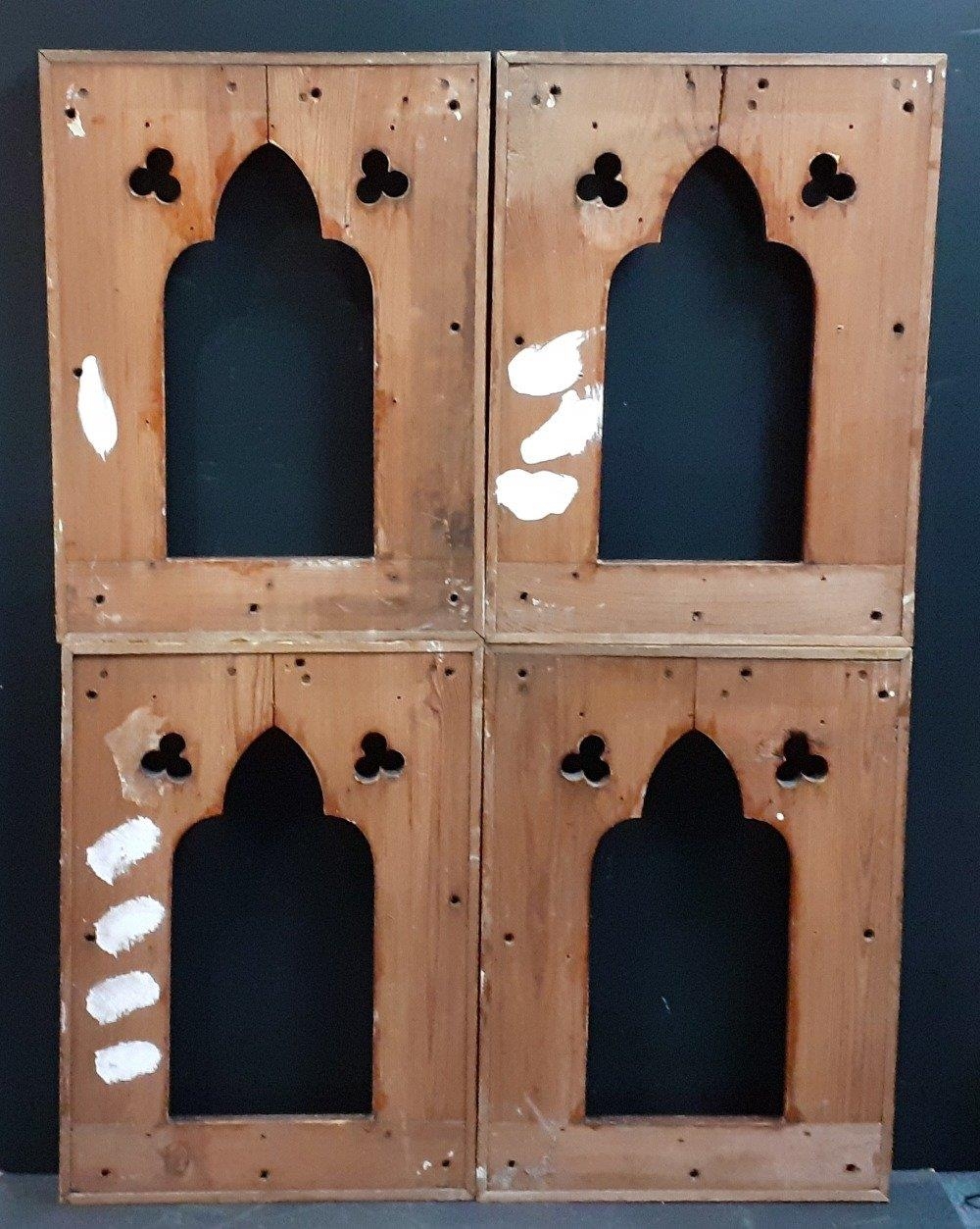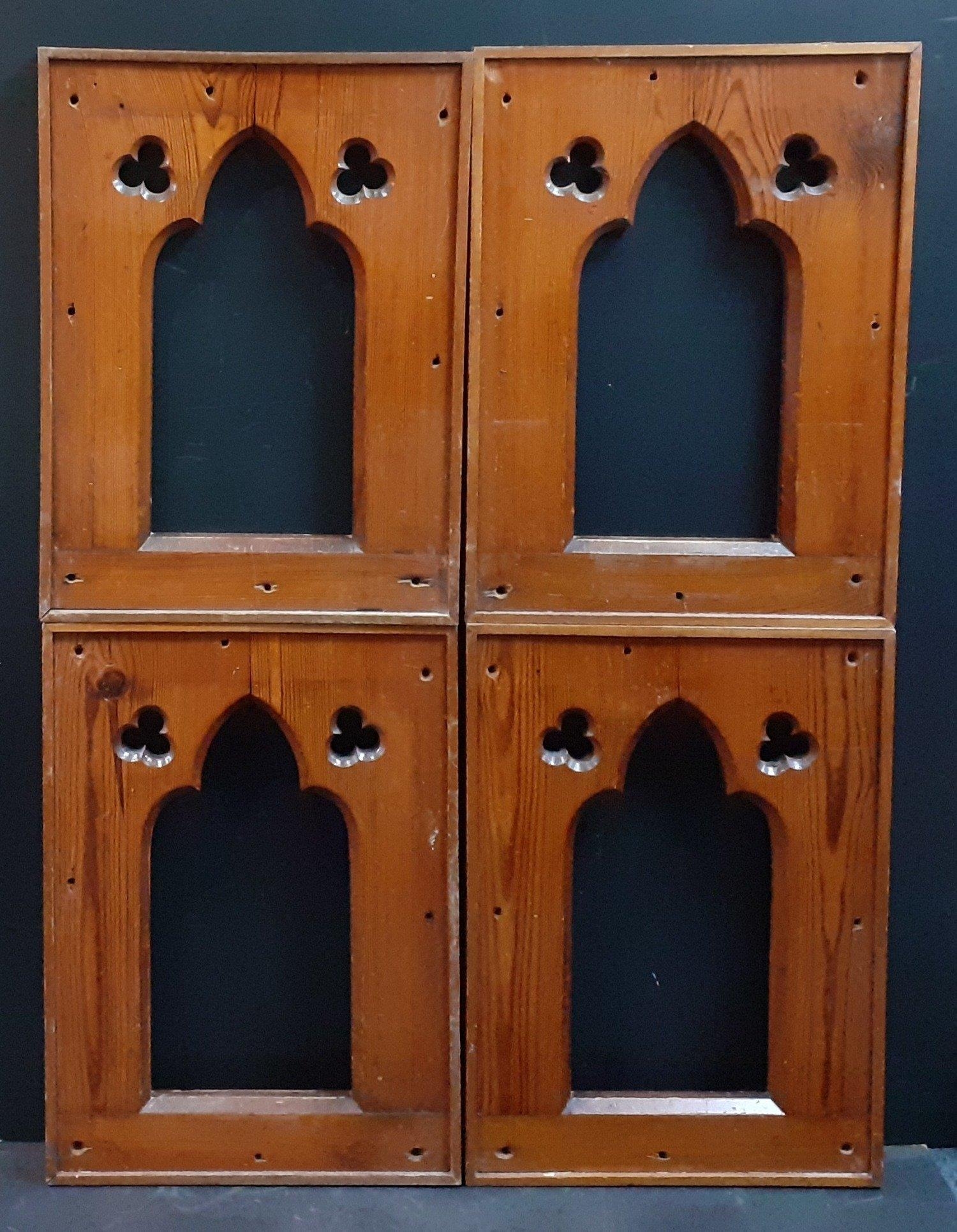 Four antique wooden panels removed from a church. Each measures 63 x 46cm approx. Would make interesting mirrors or shelf dividers.