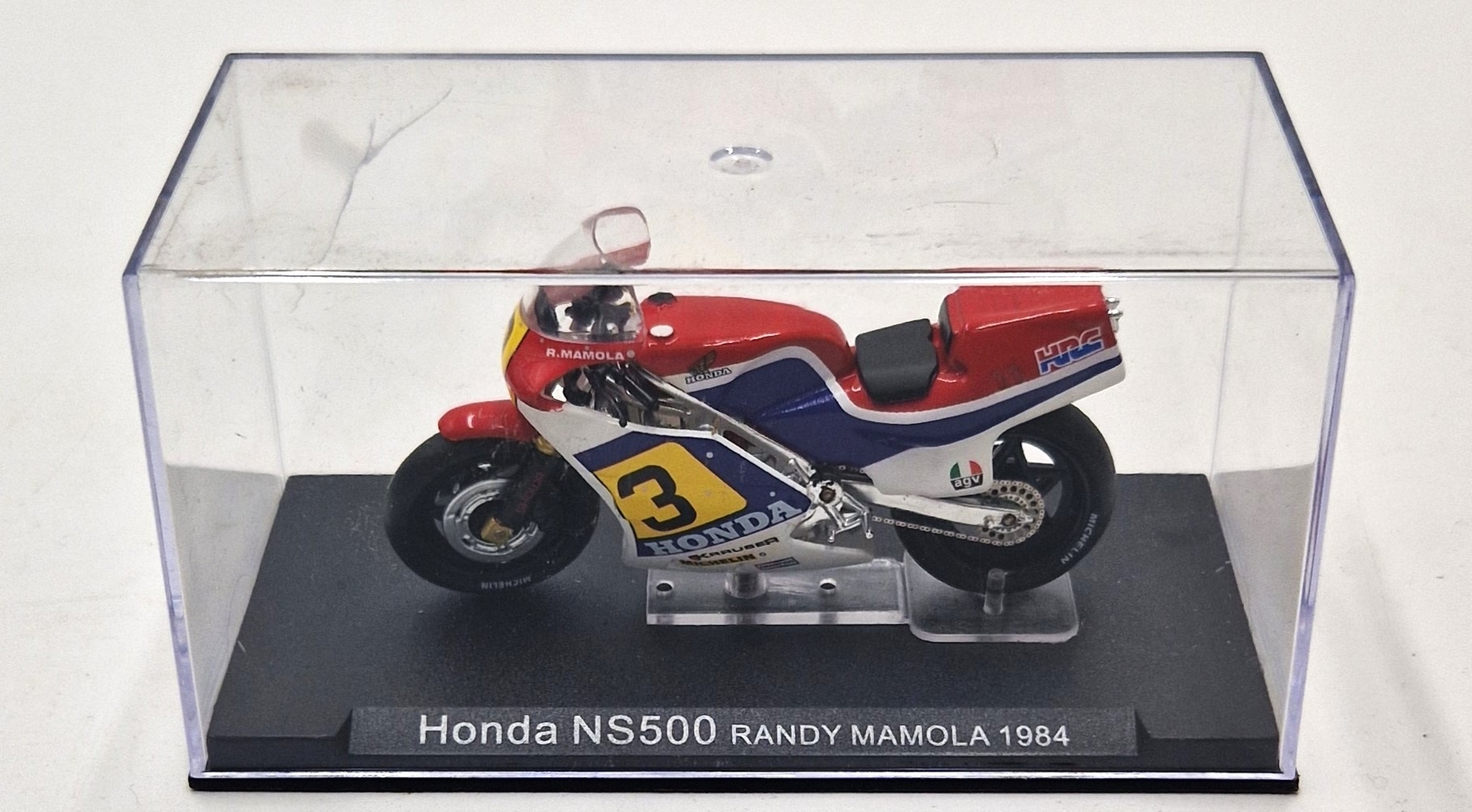 DIE CAST COLLECTORS MODEL OF A HONDA NS500 (Randy Mamola) 1984 (Original Hard Plastic Display Case).